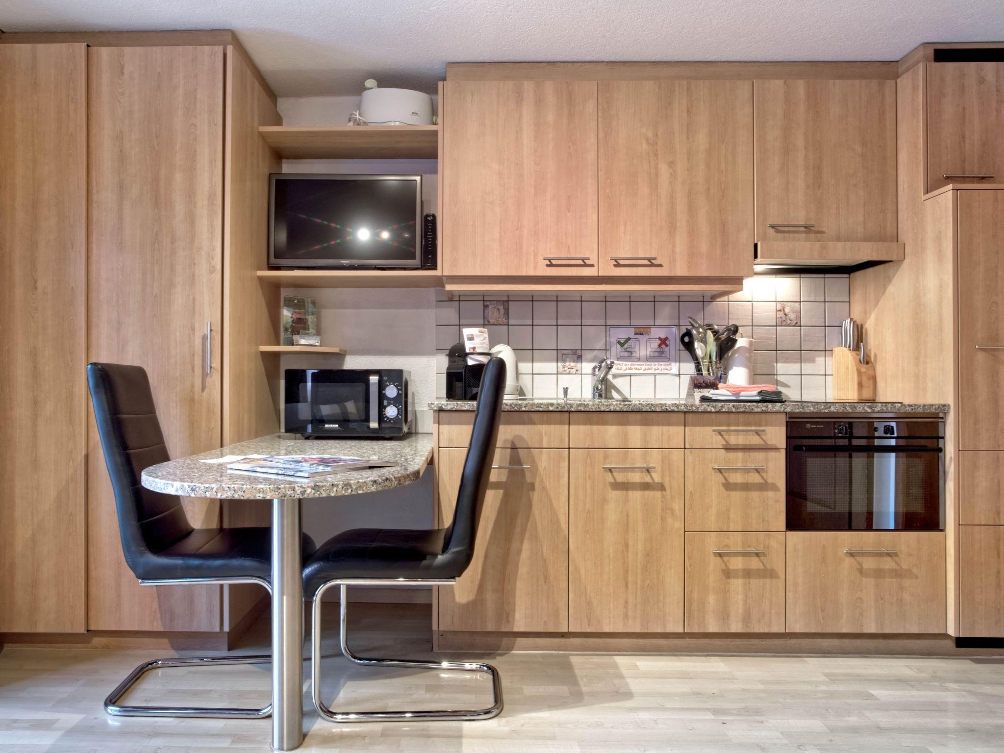 The cozy, open studio has a sleeping area with a double bed and 1 bathroom with shower/WC. The studio has a well-equipped kitchen and a cozy living and dining area. The spacious balcony offers a beautiful view of the surrounding mountain landscape.