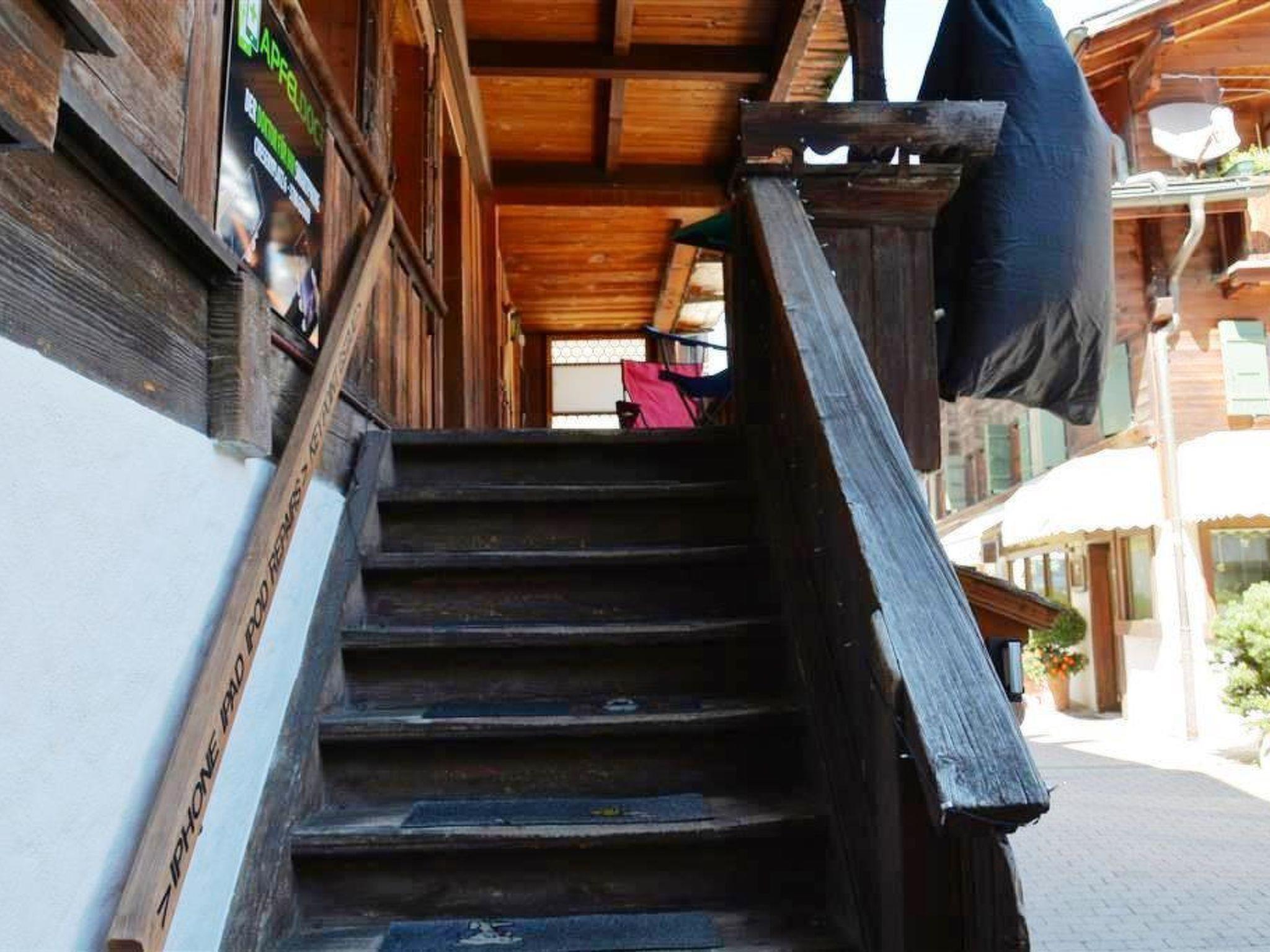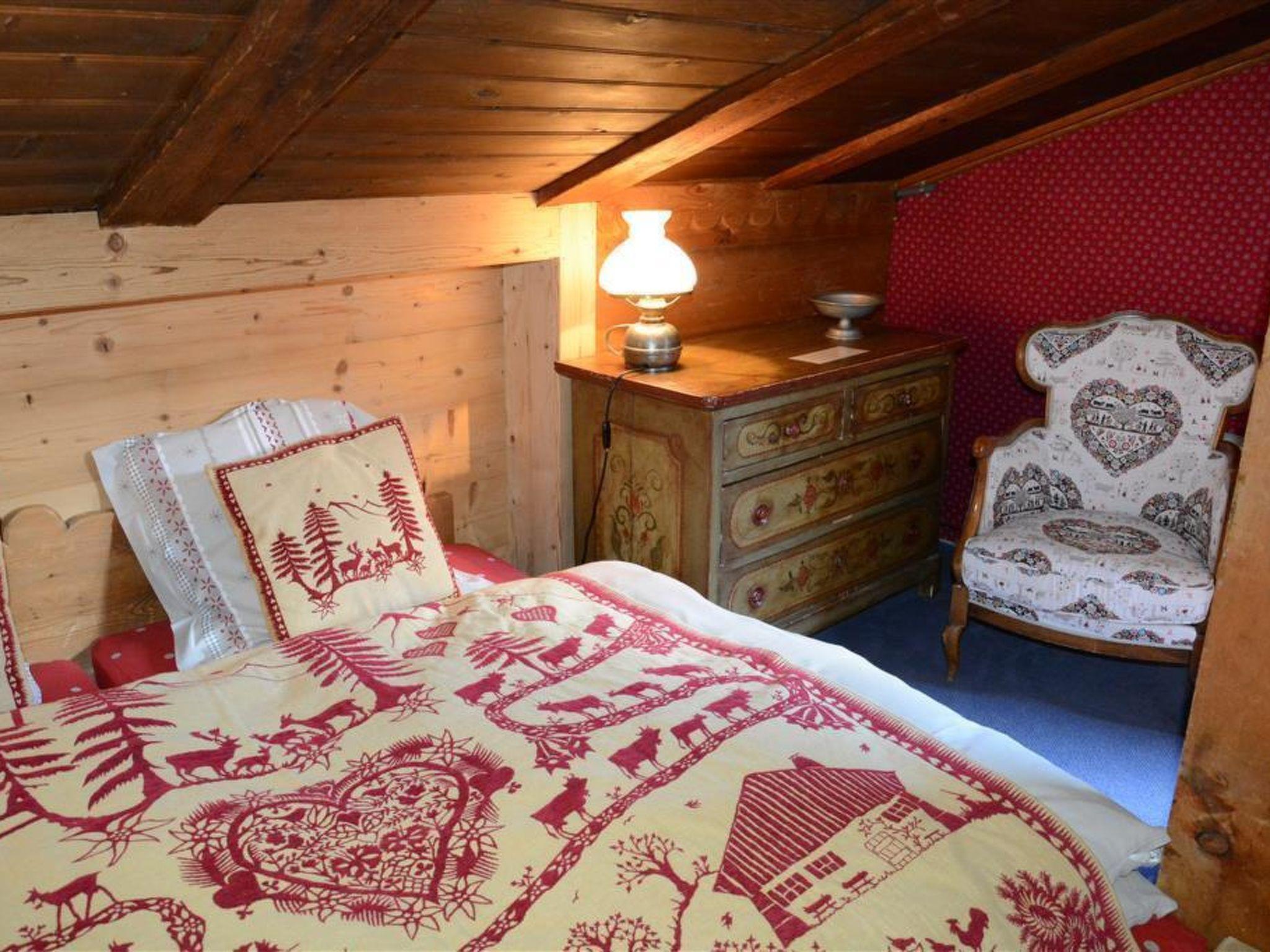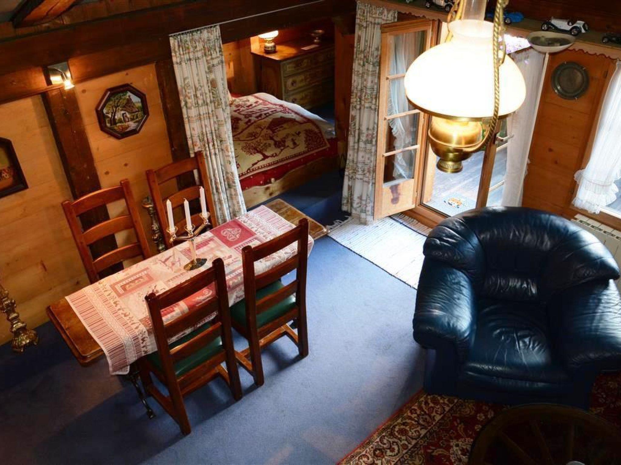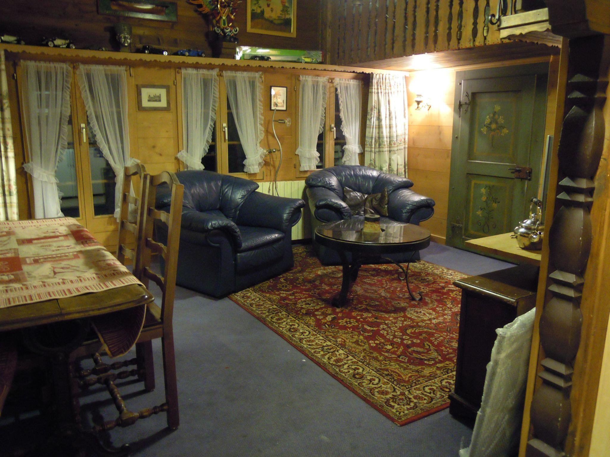 Living-dining room with 2 armchairs, dining table with chairs and flat screen TV. WiFi. Very small open-plan kitchenette (with 2 hotplates, coffee machine with capsules (Nespresso) as well as a fondue- and raclette-set). 1 double bed (180x200cm) in a small room beside the living room, separated with a curtain (in the pitch of the roof). Small cupboard and dresser. 2 single beds (90x200cm) on the gallery (not suitable for infants). Access by small stairs without handrail. Bathroom with toilet and shower. Small balcony with garden furniture. Store room for skis and sports equipment.