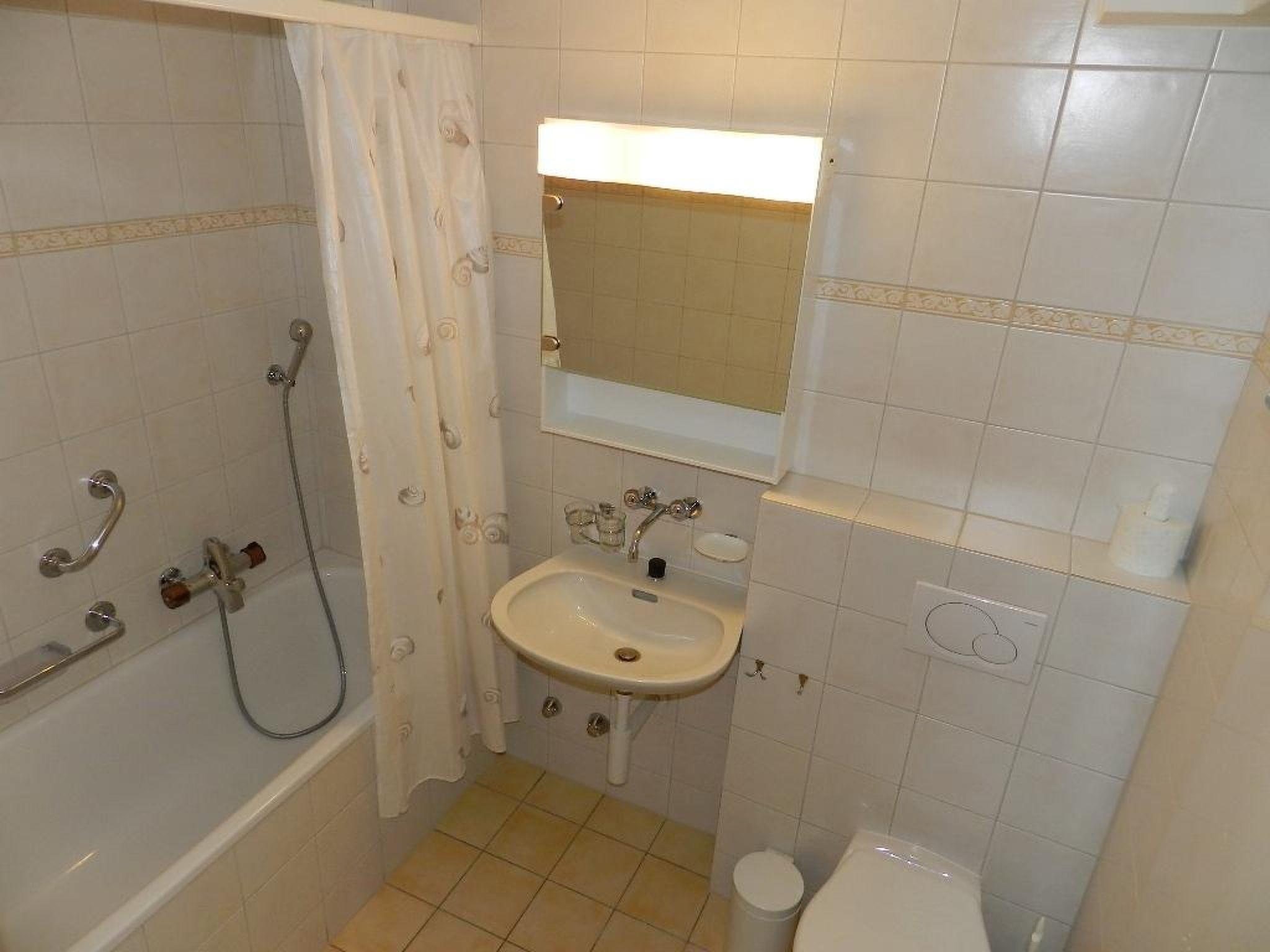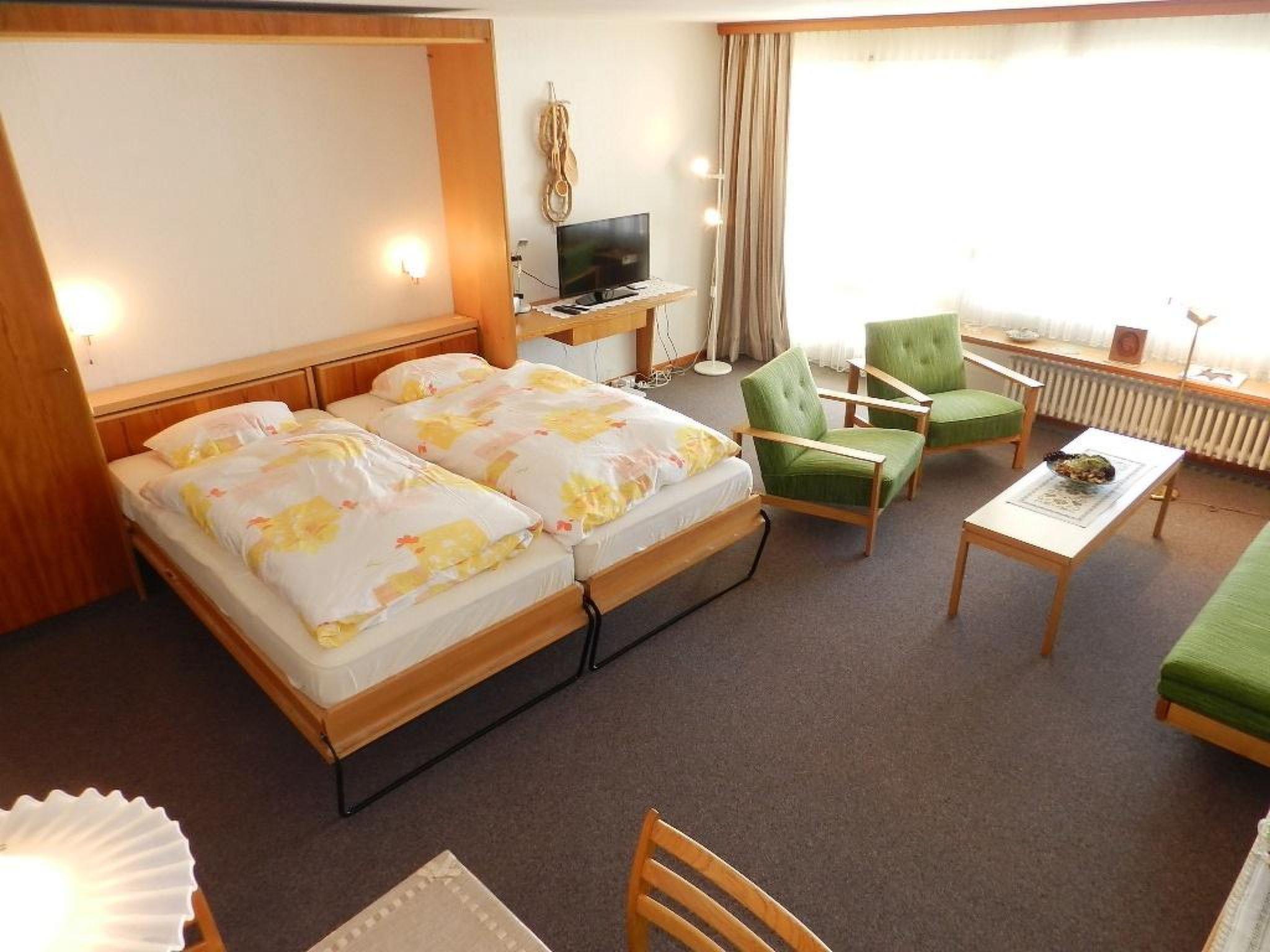 Practically and simple furnished studio. Living/dining room with dining table, sofa, TV and cabinet/fold-away bed (2 single beds, each 90x200cm). Small separate kitchenette (among with coffee machine with capsules and fondue-set). Bathroom with bathtub/toilet. Washing machine and tumble dryer for common use upon request. Wifi.