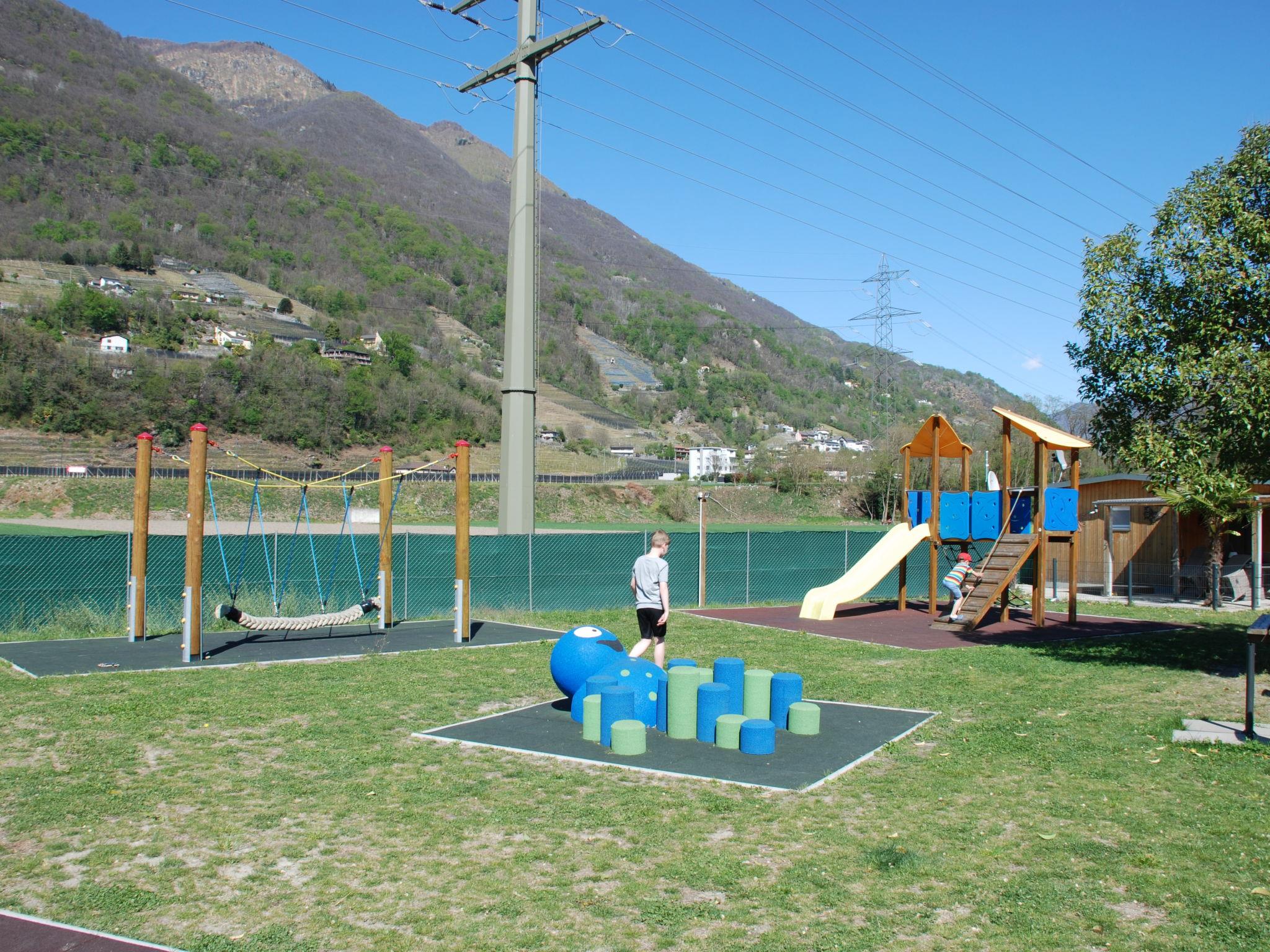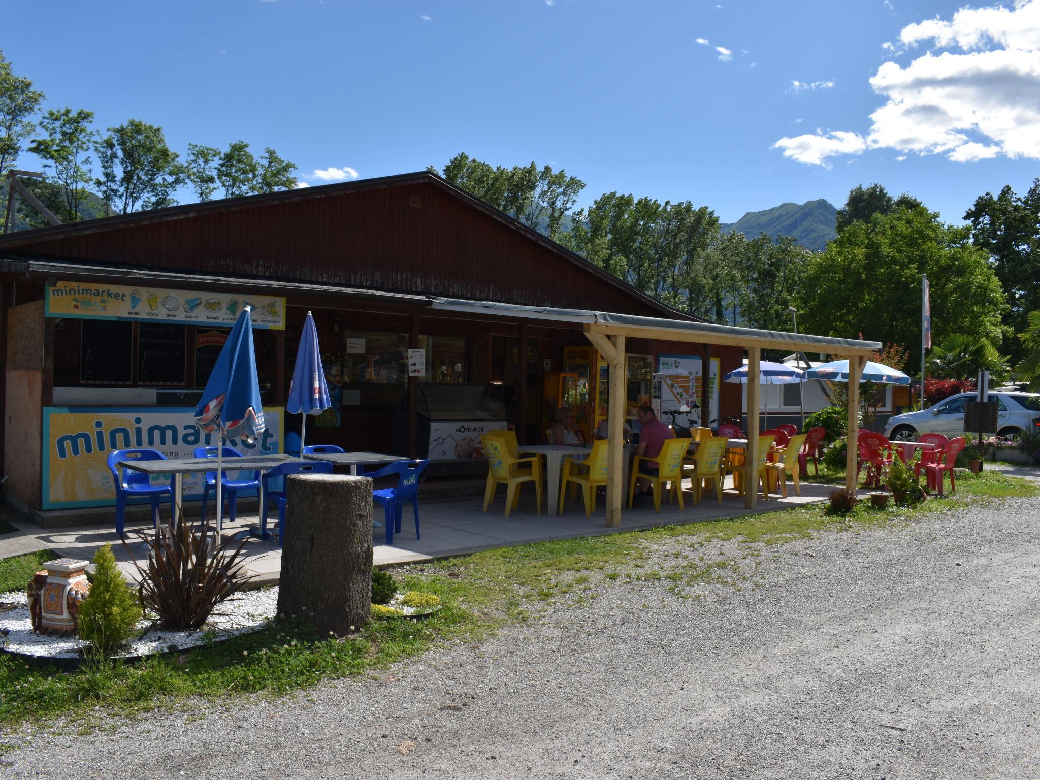Gudo 16 km from Locarno: Modern, cosy bungalow "Isola", surrounded by trees and meadows. 6 houses in the resort. On the outskirts Gudo, in a sunny position, in the countryside. For shared use: natural state property, beautiful, well-kept garden, meadow, swimming pool angular (24 x 12 m, 300 m2, depth 40 - 160 cm, seasonal availability: 20.May. - 15.Oct.) with internal staircase. Outdoor shower, table tennis, children's playground. In the complex: reception, restaurant, lounge, WiFi, playroom, table football, shopping facilities, kiosk, storage room for bicycles, central heating system. Breakfast and half board possible on request (extra). Motor access to the grounds. Grocery 50 m, supermarket 4 km, restaurant 50 m, café, bus stop "Linie 311" 500 m, railway station "SBB- CFF Riazzino" 4.4 km. Cycle lane 200 m. Nearby attractions: Castelli di Bellinzona, Piazza Grande, Locarno, Ascona, Ronco sopra Ascona, Isole di Brissago, Cardada, Madonna del Sasso, Mercato Luino e Cannobio IT. Well-known lakes can easily be reached: Lago Maggiore, Lago di Lugano, Lago di Como. Hiking paths: Valle Verzasca, Centovalli, Vallemaggia. Please note: suitable for families. Groups of teenagers on request only. The complex has another 5 bungalows for rent.