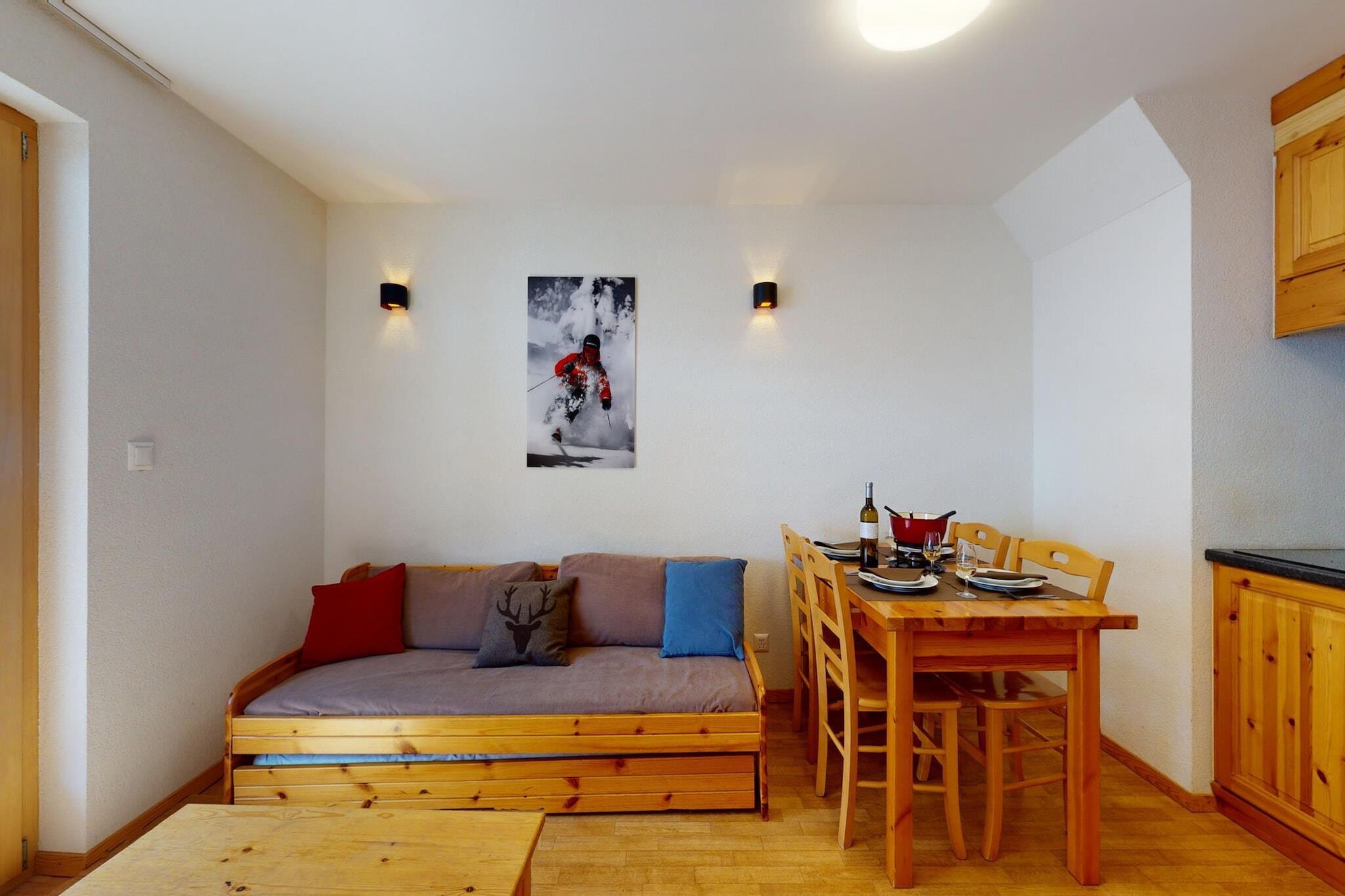 Velkommen til charmerende tilbagetog beliggende i det pulserende feriested Nendaz, Schweiz, i hjertet af de 4 Vallées. Denne komfortable 3-stjernede lejlighed, der spænder over 34 m², er ideel til op til 4 gæster og er bekvemt beliggende tæt på landsbyens centrum og svævebaner. Lejligheden ligger på 4. etage og har en hyggelig stue med balkon med delvis udsigt over bjergene, fladskærms-tv med kabelkanaler og gratis trådløs internetadgang. Det åbne køkken er veludstyret med køleskab og fryser, opvaskemaskine, mikroovn, elkedel og kaffemaskine, hvilket sikrer et bekvemt og behageligt ophold. Boligen har en fremragende beliggenhed, kun 100 meter fra svævebanen og i kort afstand fra butikker og fritidsfaciliteter. Indkvarteringen omfatter en dobbelt sovesofa i stuen, et soveværelse med to enkeltsenge og et badeværelse med badekar, håndvask og separat toilet. Gæsterne kan også drage fordel af bygningens sauna (tilgængelig mod et tillægsgebyr), vaskeri og skirum. Der tilbydes en udendørs parkeringsplads, afhængigt af tilgængelighed, med yderligere indendørs parkeringsmuligheder mod et ekstra gebyr. Forbedre dit ophold med valgfrie tjenester som sengelinned, slutrengøring og gourmetkurve.