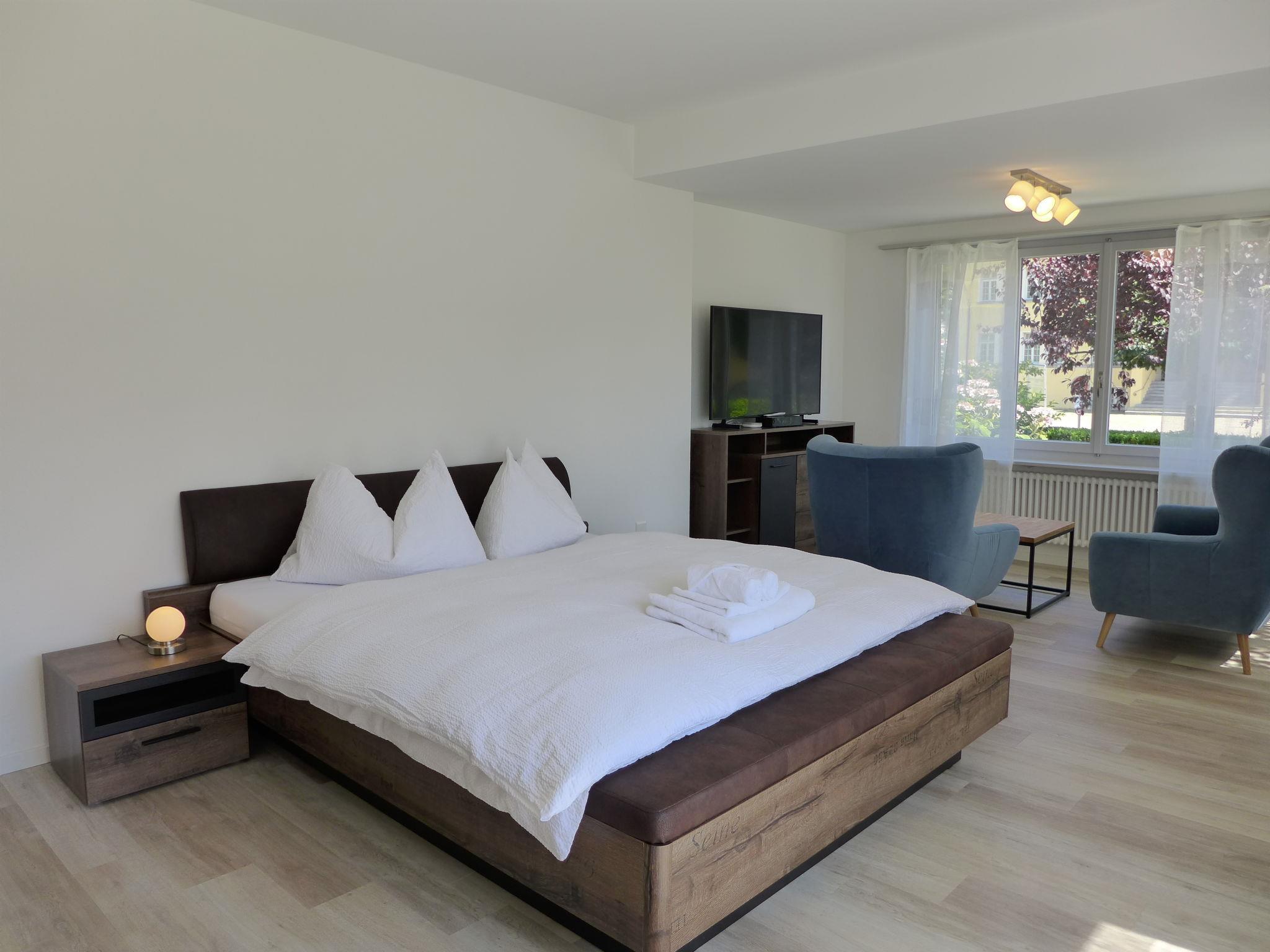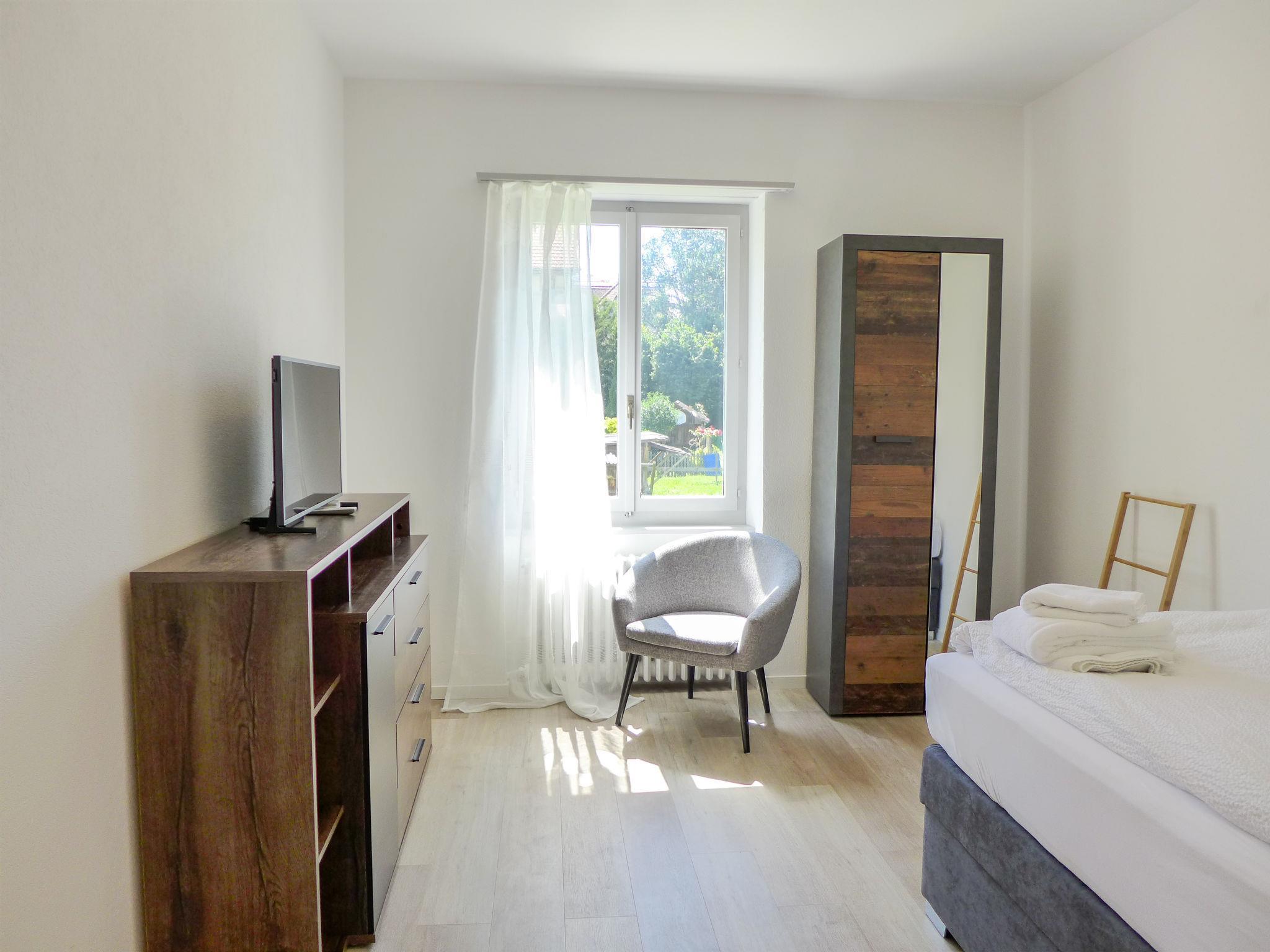 "Henry's 100", 4-room apartment 100 m2, on the upper ground floor. Spacious and bright, fully renovated in 2022, very comfortable and modern furnishings: large living/sleeping room with 1 double bed (180 cm, length 200 cm), cable TV. 1 room with 1 double bed (160 cm, length 200 cm), cable TV. 2 rooms, each room with 1 bed (120 cm, length 200 cm), cable TV. Kitchen-/living room (dishwasher, 4 induction hot plates, toaster, kettle, microwave, electric coffee machine, Capsules for coffee machine (Dolce Gusto) extra) with dining table. Exit to the garden. 2 showers/WC. Parquet floors. Partial view of the mountains and the resort. Facilities: hair dryer. Internet (WiFi, free). Parking (1 car). Please note: non-smoking house. Fire extinguisher.