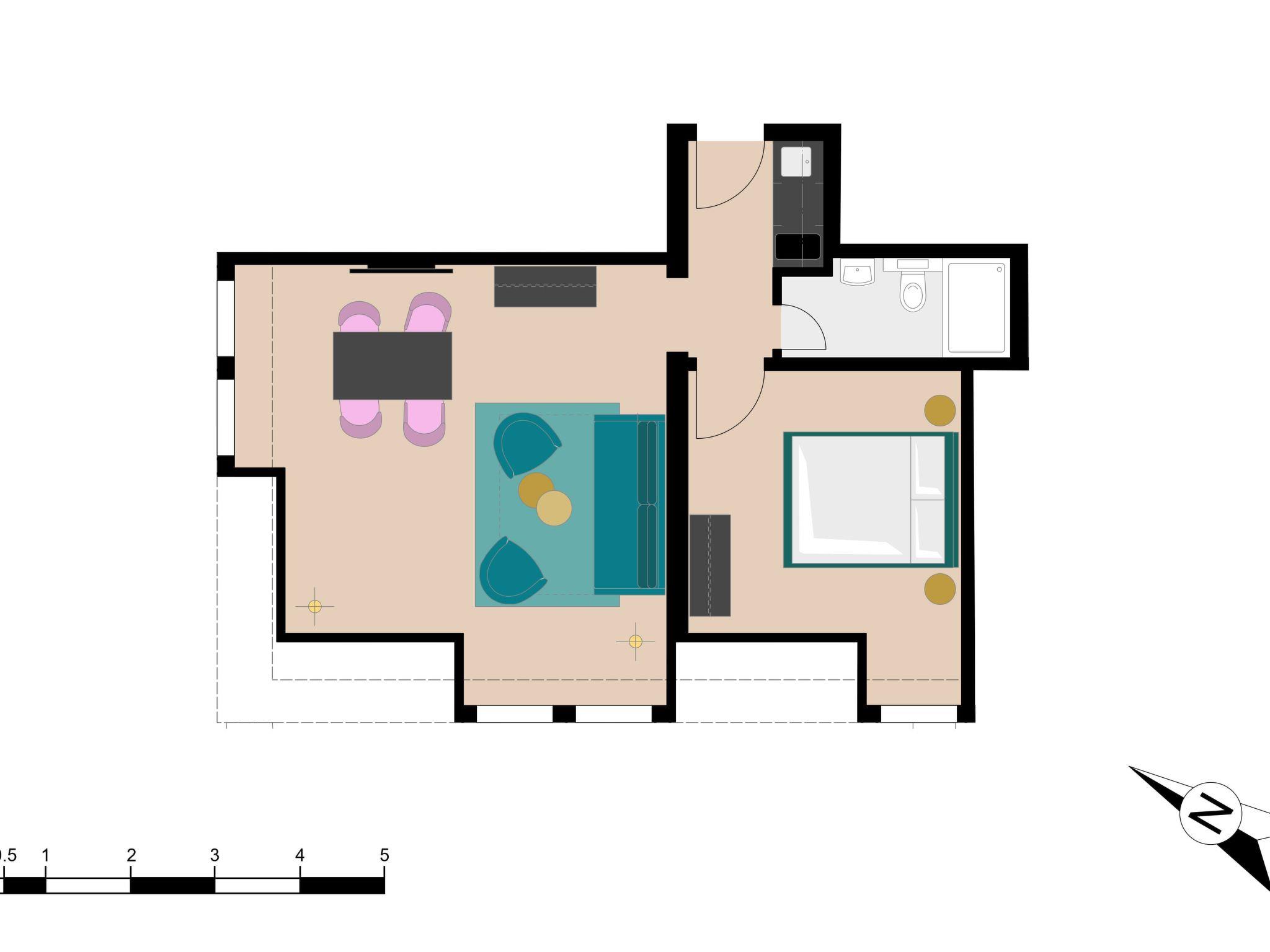 The modern, air-conditioned flat (40 m2) on the 4th floor offers space for up to 4 people. Thanks to the successful combination of stylish elements and a warm, inviting atmosphere, the flat creates a pleasant feel-good ambience.