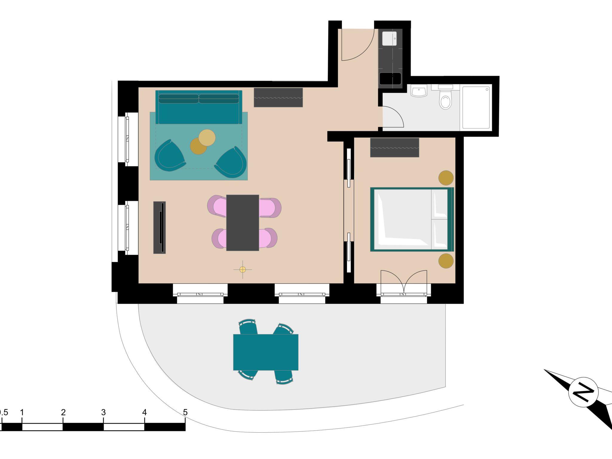 The modern, air-conditioned suite (57 m2) on the 3rd floor offers space for up to 4 people. The bright and friendly flat has been furnished with great attention to detail and combines comfort with stylish design.