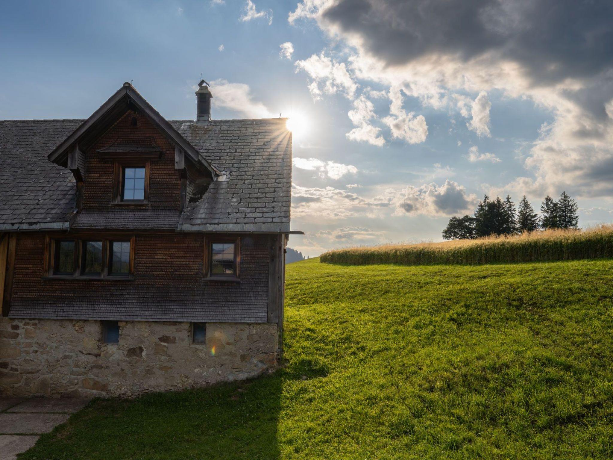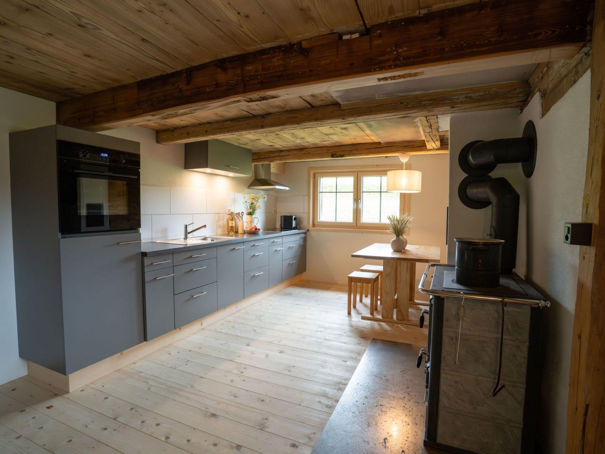 The outdoor area invites you to linger and enjoy yourself with a seating area, bench set and barbecue area. Situated at 1100 metres above sea level, the hut is surrounded by meadows and woodland and offers a magnificent view of the Säntis and Speer mountains. The surrounding meadows are farmed organically by us, the Schmid family, with suckler cow husbandry. The cows and calves spend the summer on a high alp in the Glarnerland and on the Unter Bächen alp in Ebnat Kappel. Organic meat and flour can be purchased directly from the farm.
