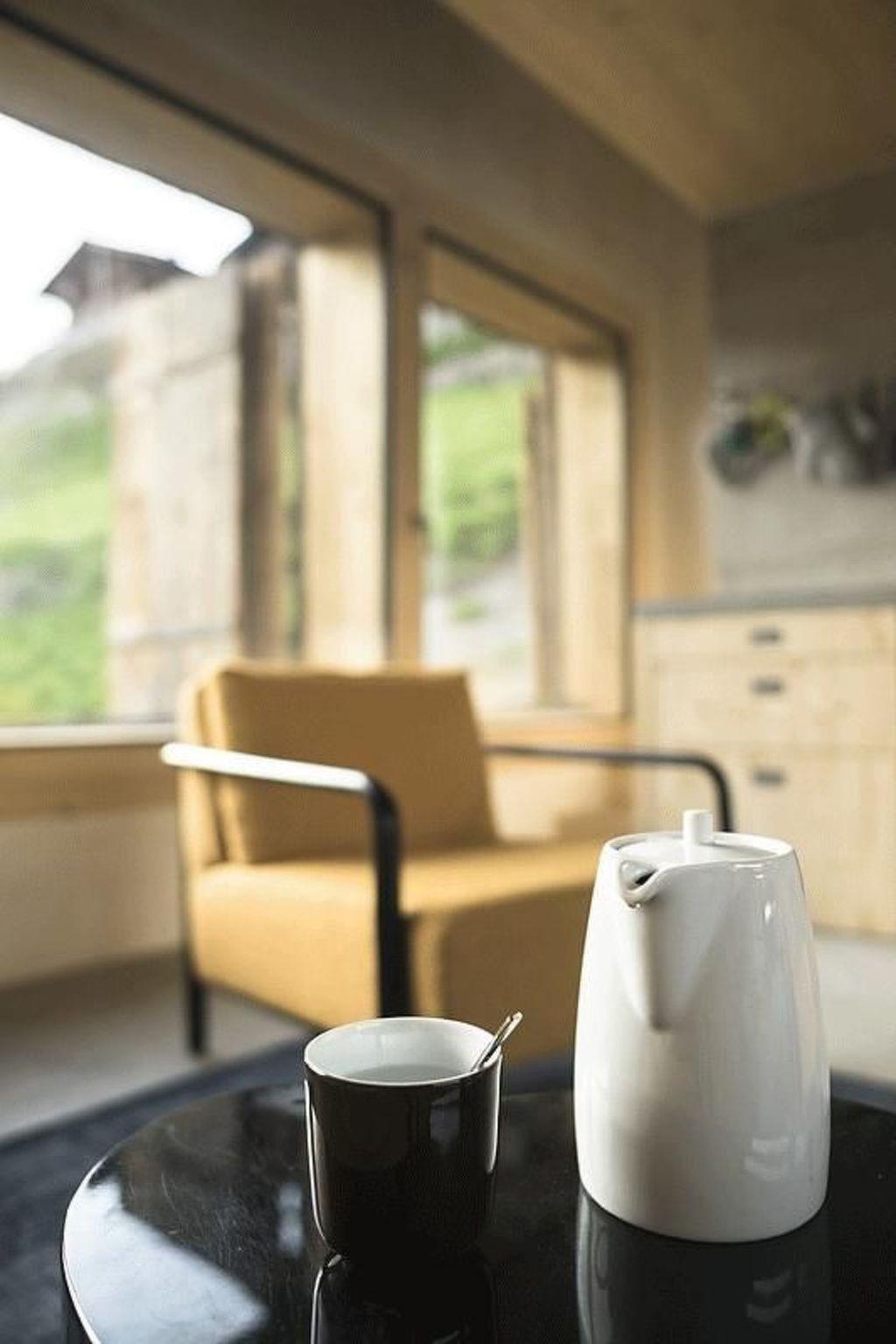 The former barn contains the main living area, with a fitted kitchen, dining table and seating area. The living space also includes the wood-burning cooker, which heats the entire mayen in the spirit of yesteryear. Large windows on the sides offer views over the valley in a resolutely modern atmosphere.
