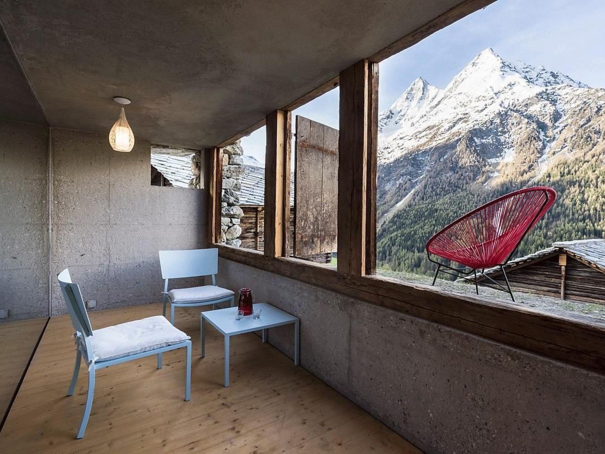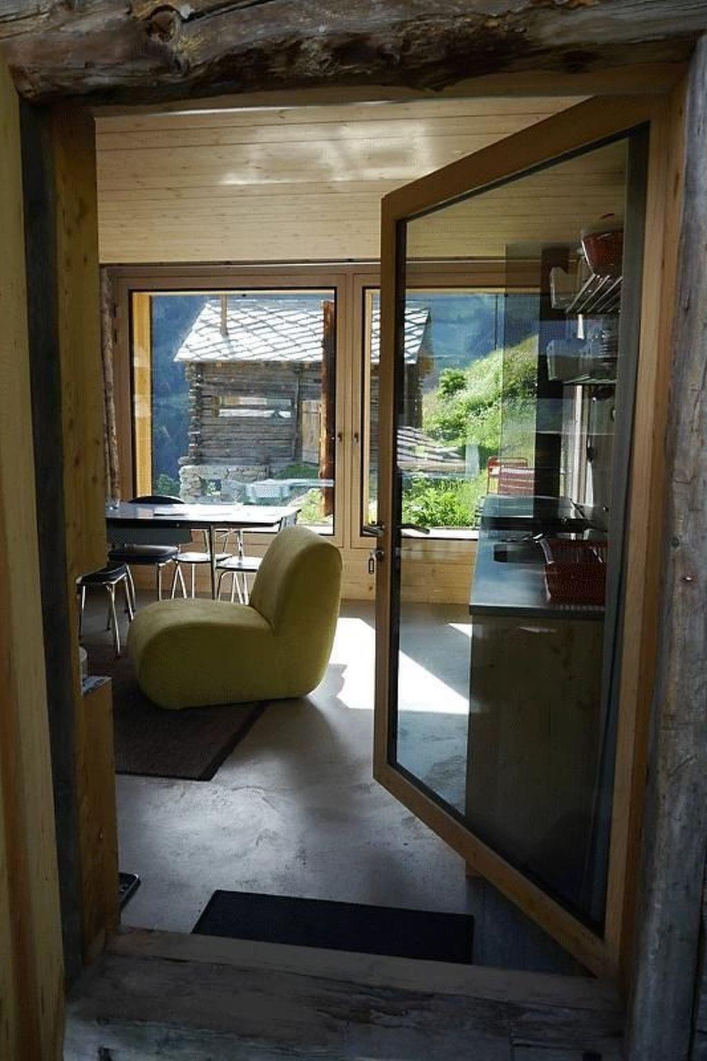 The former barn contains the main living area, with a fitted kitchen, dining table and seating area. The living space also includes the wood-burning cooker, which heats the entire mayen in the spirit of yesteryear. Large windows on the sides offer views over the valley in a resolutely modern atmosphere.