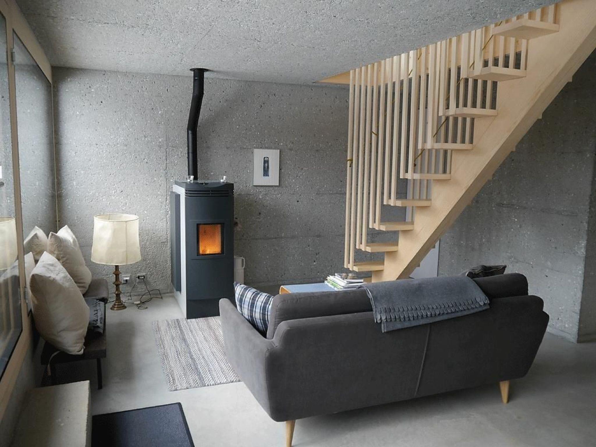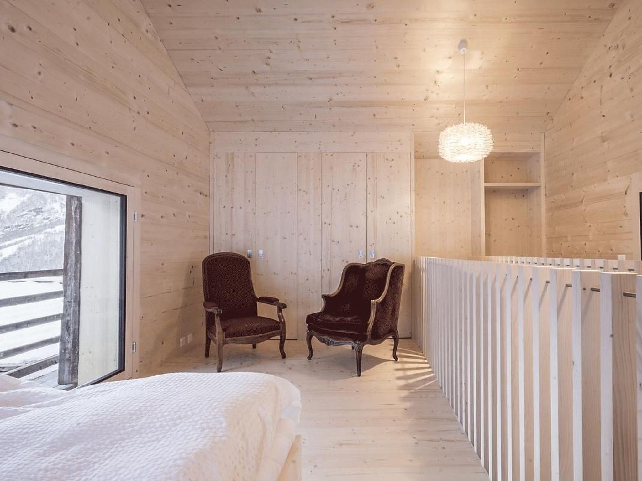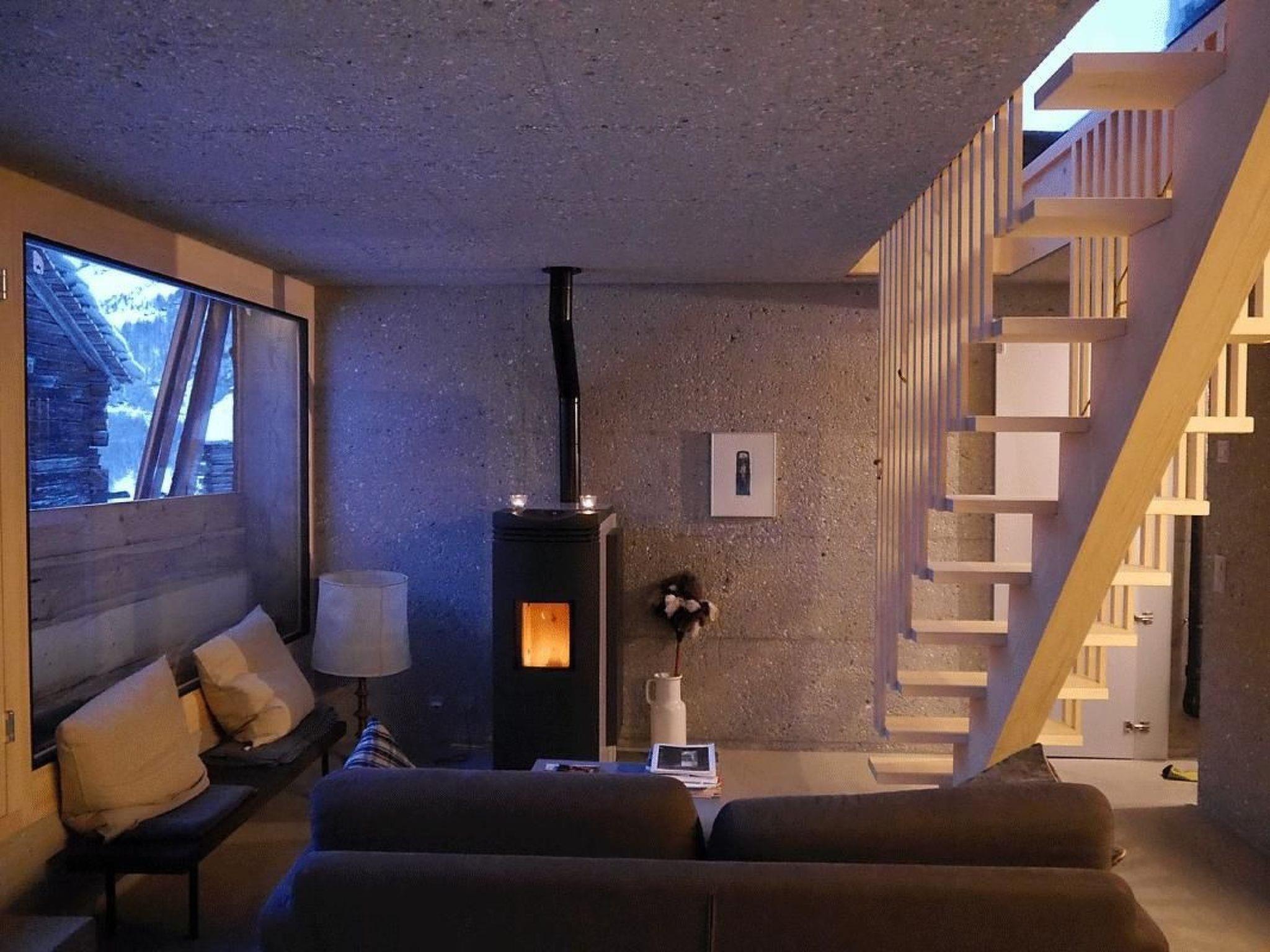 The former stable is now a modern living space heated by a pellet stove. The upper part has been converted into a spacious bedroom with a view of the Dent Blanche at 4357 metres. The different areas allow us to offer you two completely different atmospheres. The former stable has a mineral feel, combining concrete and stone, while the raccard area is a cocoon lined with wood, inviting you to relax and unwind. The passage from one floor to the other is via a wooden staircase that crosses the void, a journey in itself!