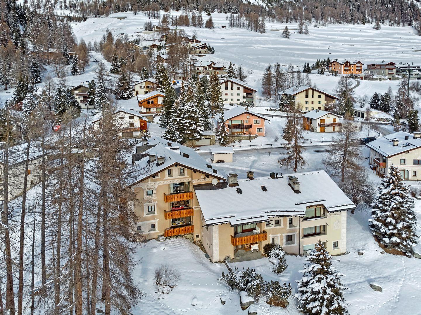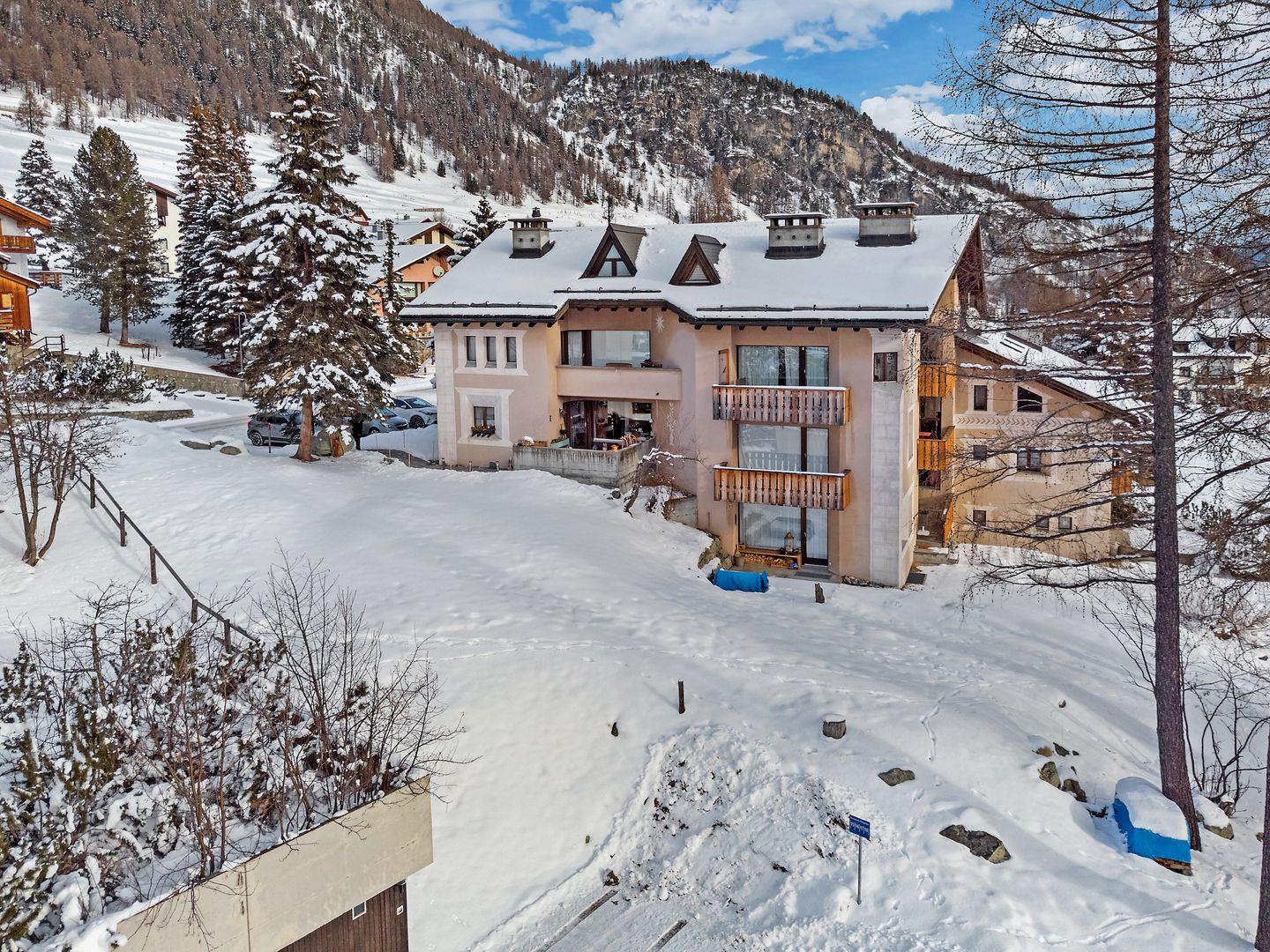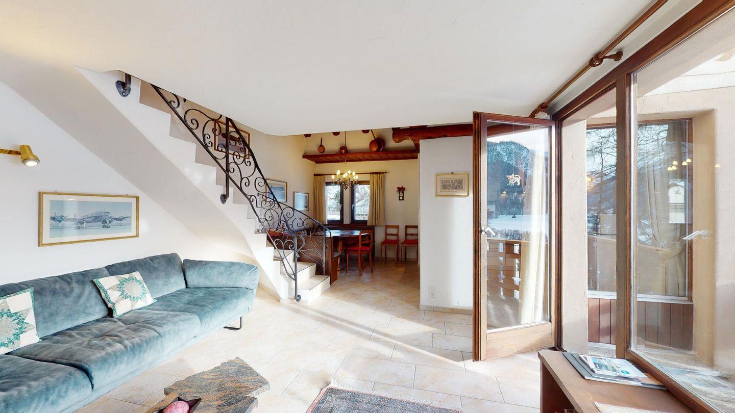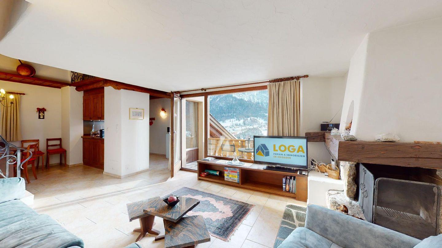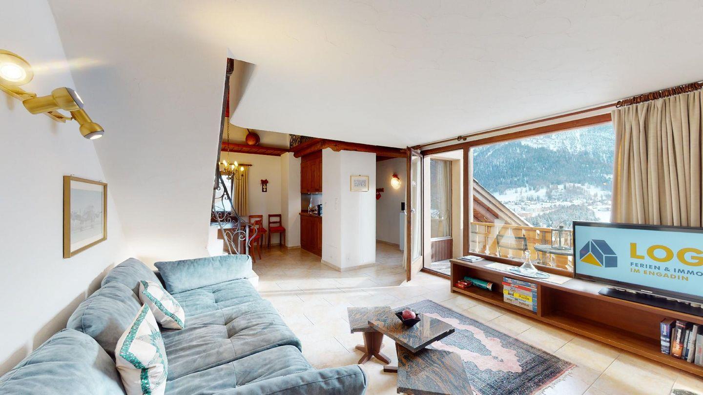 3½-Zimmerwohnung im 3. Stock. Eingang mit Garderobe. Ein Doppelzimmer (1,80m × 2 m) und ein Schlafzimmer mit einem Einzelbett und einem Hochbett (0,90m × 2 m). Zwei Badezimmer mit Wanne, WC und Lavabo. Über die Empore führt eine Treppe zum offenen Wohnzimmer mit TV, Kamin, Essecke und Balkon mit Blick in die Val Chamuera. Halboffene Küche mit Glaskeramikkochfeld mit Dampfabzug, Backofen, Kühlschrank mit Tiefkühlfach, Geschirrspüler. Garagenplatz. Waschküche zur gemeinsamen Benützung. Haustiere sind nicht erlaubt.