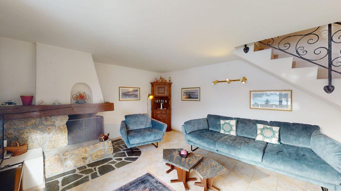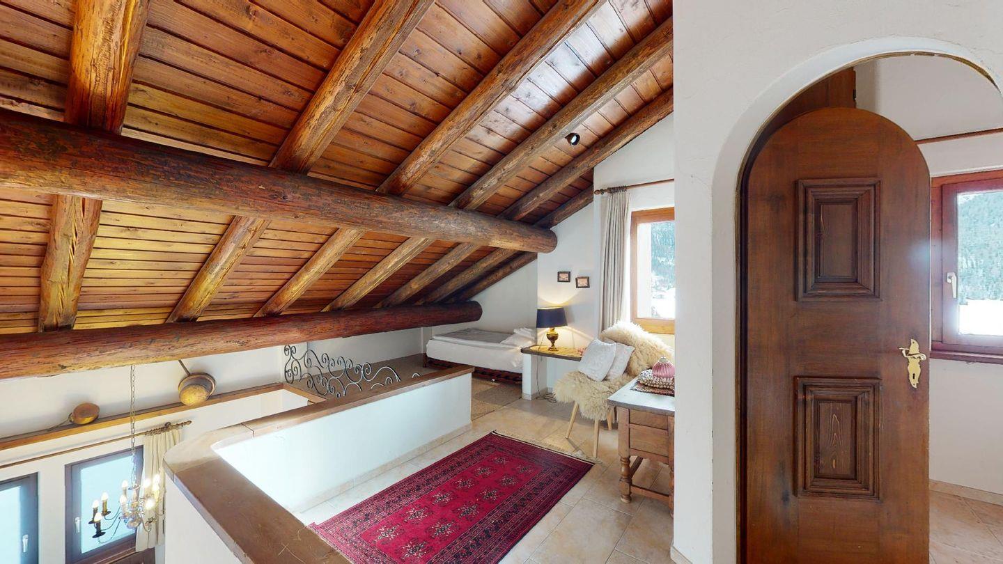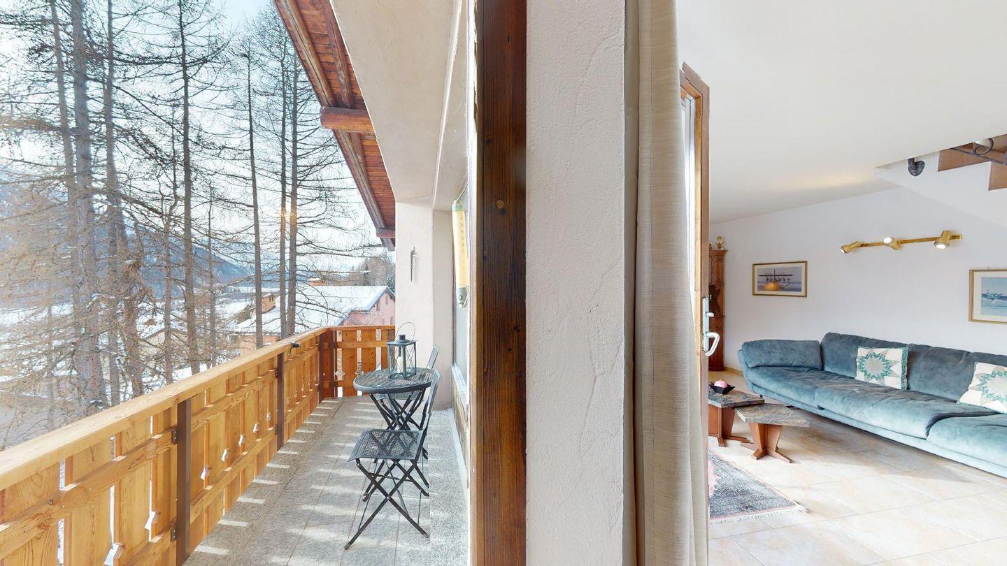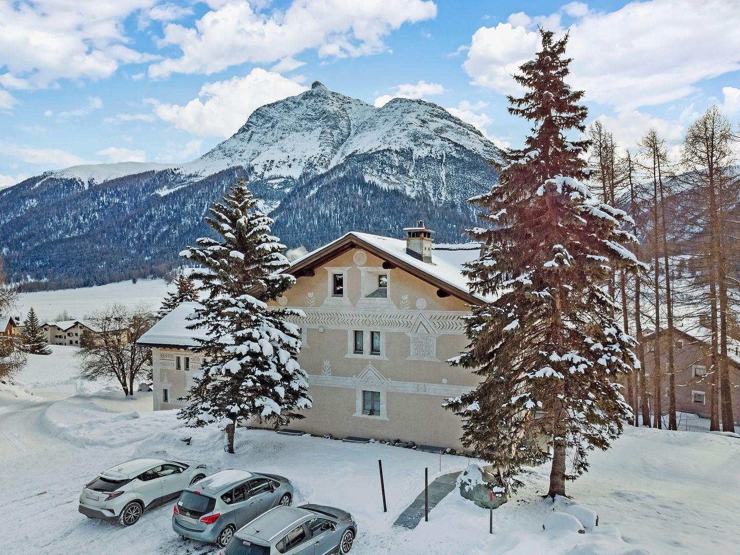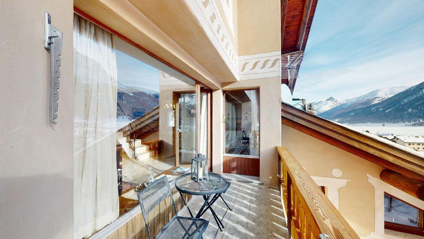3½-Zimmerwohnung im 3. Stock. Eingang mit Garderobe. Ein Doppelzimmer (1,80m × 2 m) und ein Schlafzimmer mit einem Einzelbett und einem Hochbett (0,90m × 2 m). Zwei Badezimmer mit Wanne, WC und Lavabo. Über die Empore führt eine Treppe zum offenen Wohnzimmer mit TV, Kamin, Essecke und Balkon mit Blick in die Val Chamuera. Halboffene Küche mit Glaskeramikkochfeld mit Dampfabzug, Backofen, Kühlschrank mit Tiefkühlfach, Geschirrspüler. Garagenplatz. Waschküche zur gemeinsamen Benützung. Haustiere sind nicht erlaubt.
