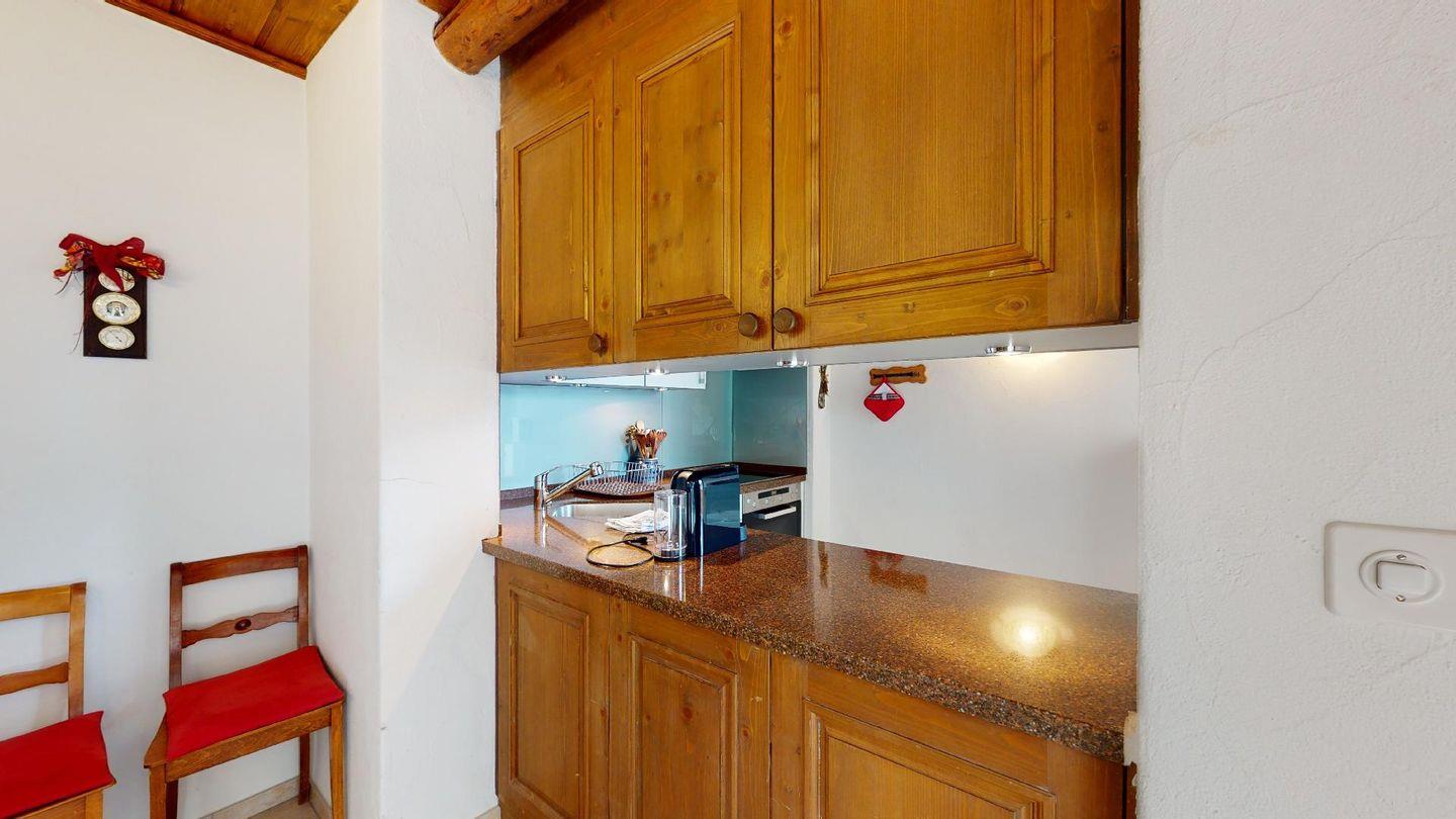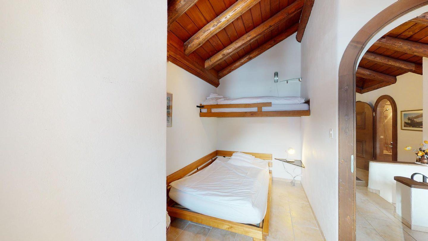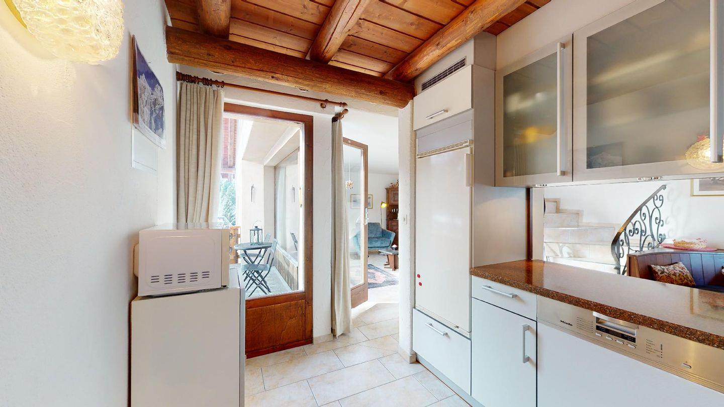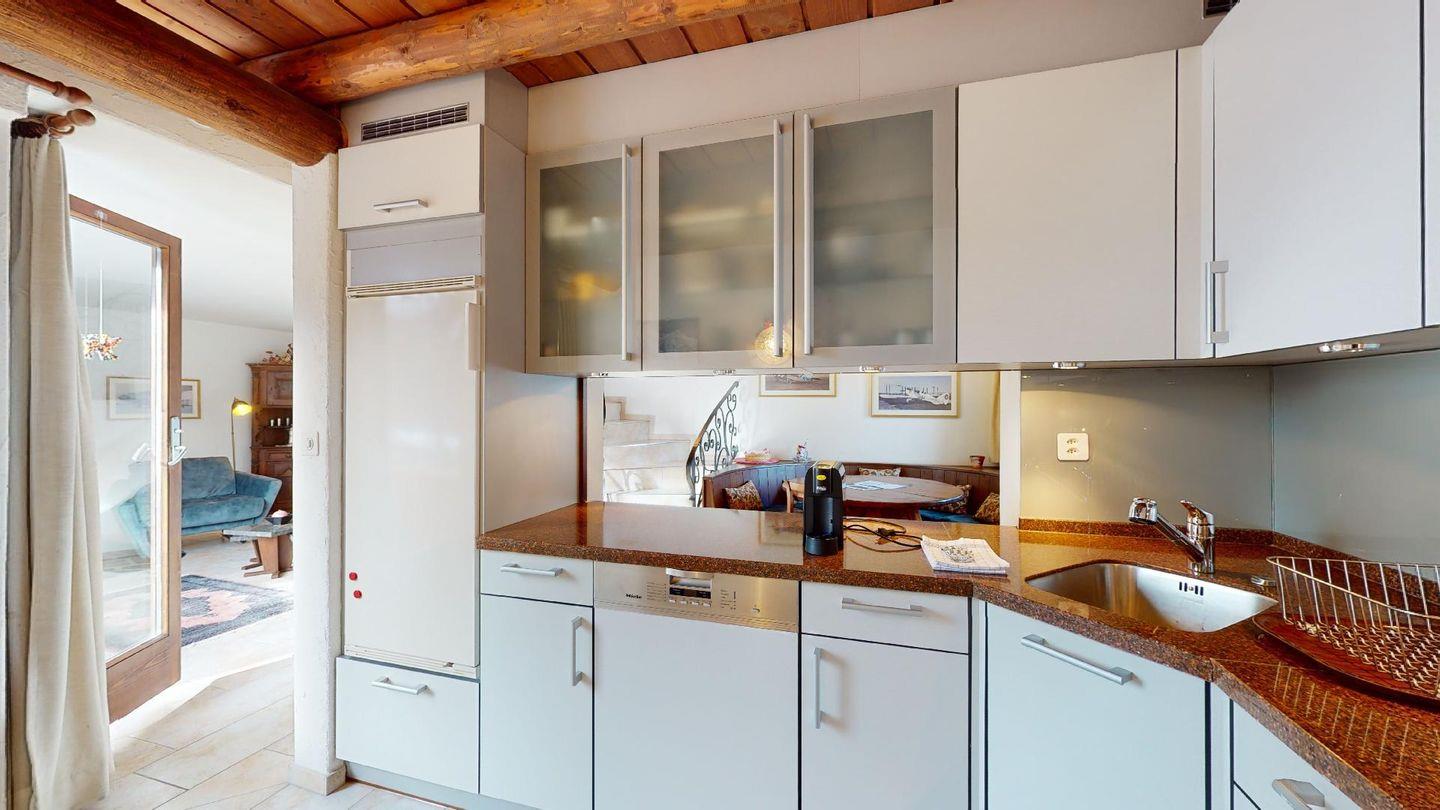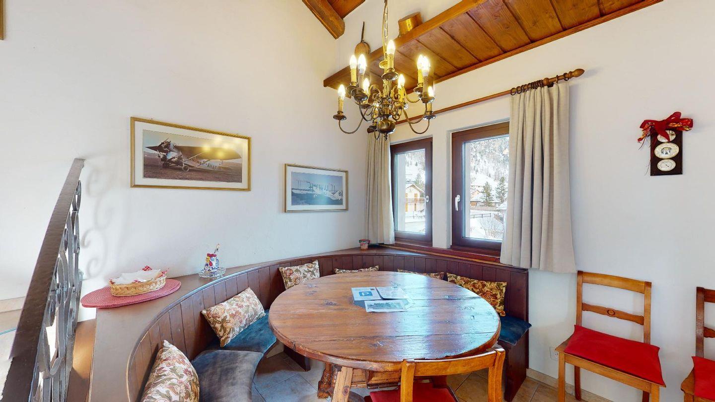3½-Zimmerwohnung im 3. Stock. Eingang mit Garderobe. Ein Doppelzimmer (1,80m × 2 m) und ein Schlafzimmer mit einem Einzelbett und einem Hochbett (0,90m × 2 m). Zwei Badezimmer mit Wanne, WC und Lavabo. Über die Empore führt eine Treppe zum offenen Wohnzimmer mit TV, Kamin, Essecke und Balkon mit Blick in die Val Chamuera. Halboffene Küche mit Glaskeramikkochfeld mit Dampfabzug, Backofen, Kühlschrank mit Tiefkühlfach, Geschirrspüler. Garagenplatz. Waschküche zur gemeinsamen Benützung. Haustiere sind nicht erlaubt.