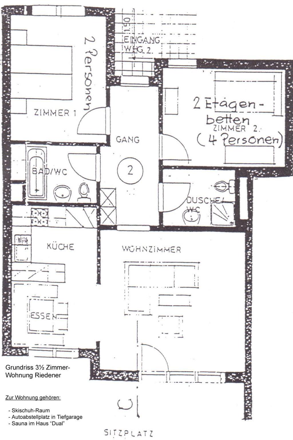 73 m2. More information by the provider: On the outskirts of Laax, in an idyllic and quiet location, is the 3.5 room apartment Casa Migiur. The bright first floor apartment offers 73m2 of space for 6 guests. It has a garden with a terrace and barbecue, a bedroom with a double bed and a bedroom with two bunk beds.In the family bathroom there is a bathtub with toilet and sink. In the small bathroom there is a separate shower with toilet and sink.The kitchen is equipped with a ceramic hob, oven, dishwasher and a refrigerator with freezer compartment, coffee filter machine, raclette, cheese and chinoise fondue set. A TV, radio as well as WLAN are available for free use.