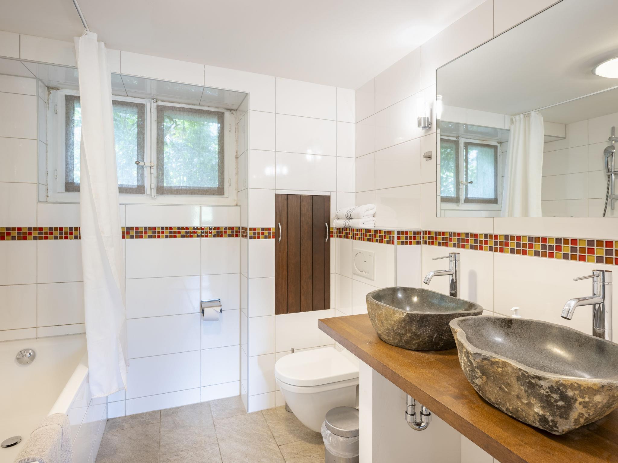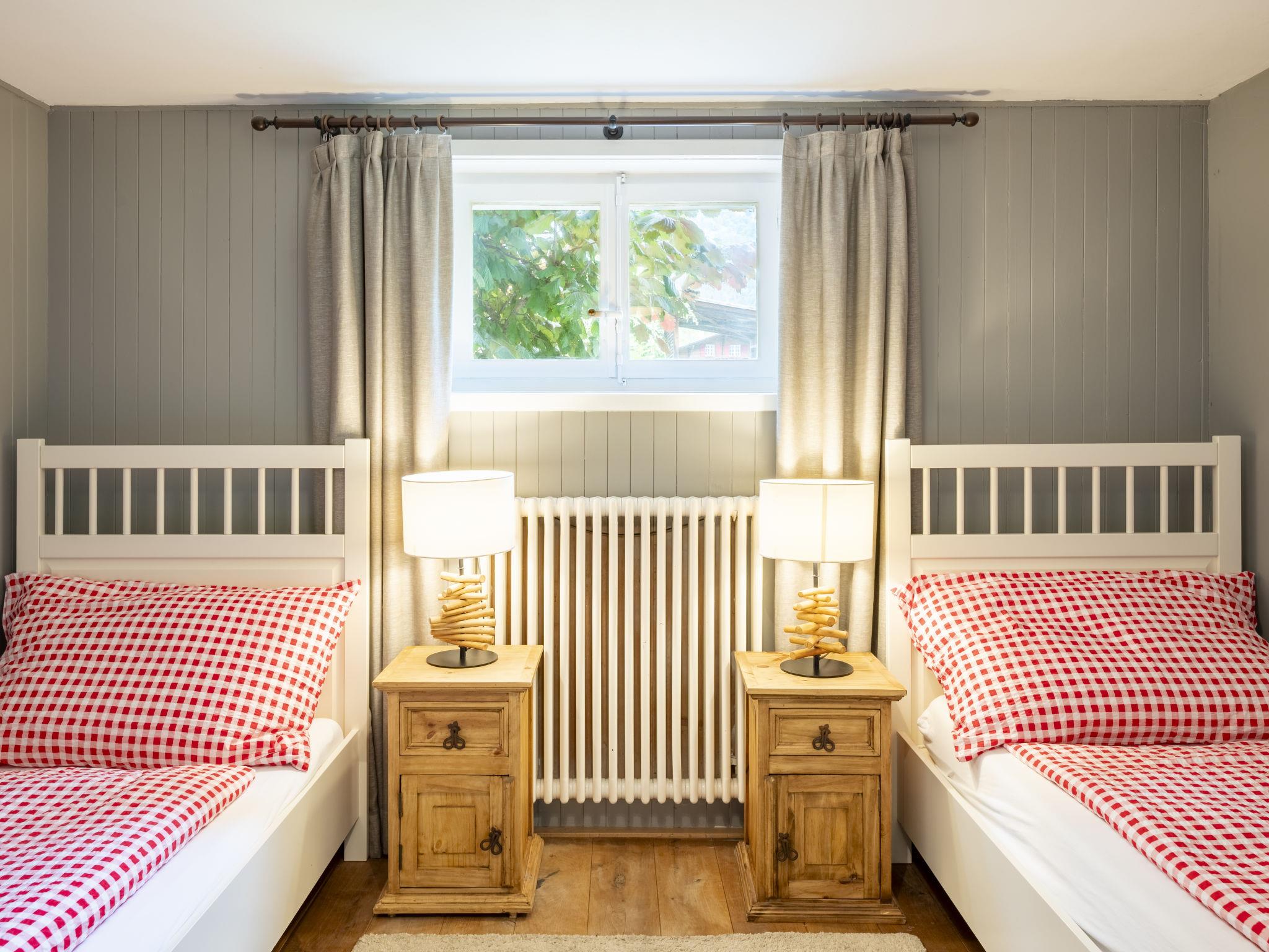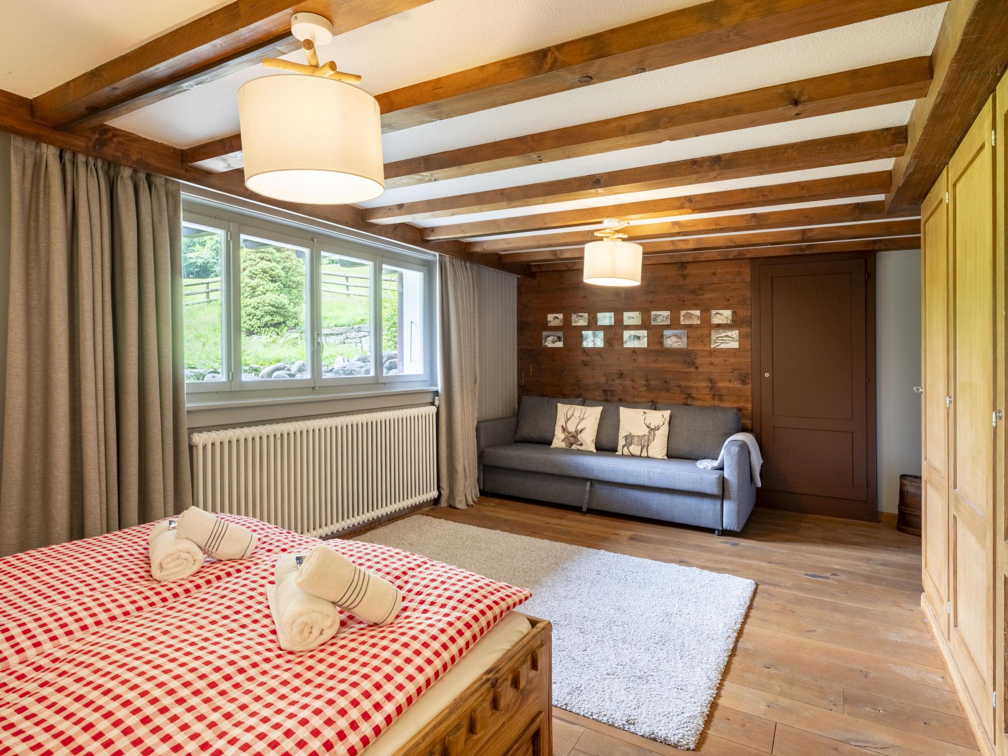 "Chalet am Schärm", 7-room chalet 200 m2 on 3 levels. Spacious and bright, partly renovated in 2022, tasteful and cosy furnishings: open living/dining room 35 m2 with open-hearth fireplace, cable TV, digital TV, international TV channels and flat screen. Exit to the balcony. 1 room 20 m2 with 1 french bed (160 cm, length 200 cm). Open kitchen 12 m2 (oven, dishwasher, 5 ceramic glass hob hotplates, microwave, freezer, electric coffee machine, raclette grill, fondue Set (cheese)). Shower/WC. On the lower ground floor: 1 room 28 m2 with 1 sofabed (130 cm, length 200 cm), 1 french bed (160 cm, length 200 cm). 1 room 15 m2 with 2 beds (90 cm, length 200 cm). Exit to the garden. Bath/WC, double hand-basin. Upper floor: 3 rooms with sloping ceilings, each room with 1 french bed (160 cm, length 200 cm). Shower/WC. Balcony 35 m2, patio. Balcony furniture, deck chairs (6), box-room. Marvellous panoramic view of the mountains and the countryside. Facilities: iron, children's high chair, baby cot for up to 4 year olds (extra), hair dryer. Internet (WiFi, free). Please note: non-smoking house. Smoke alarm, fire extinguisher.