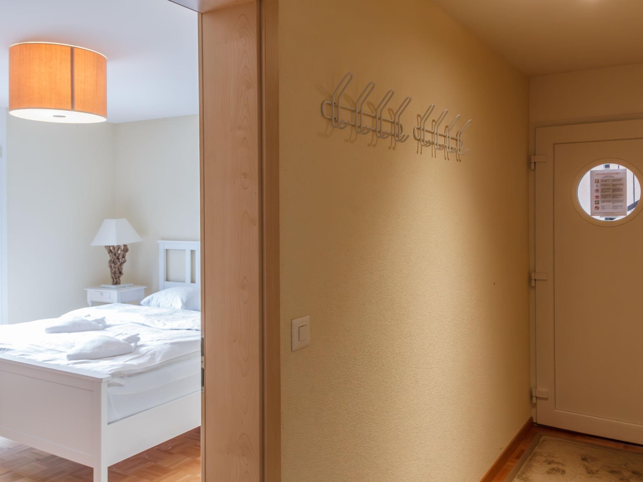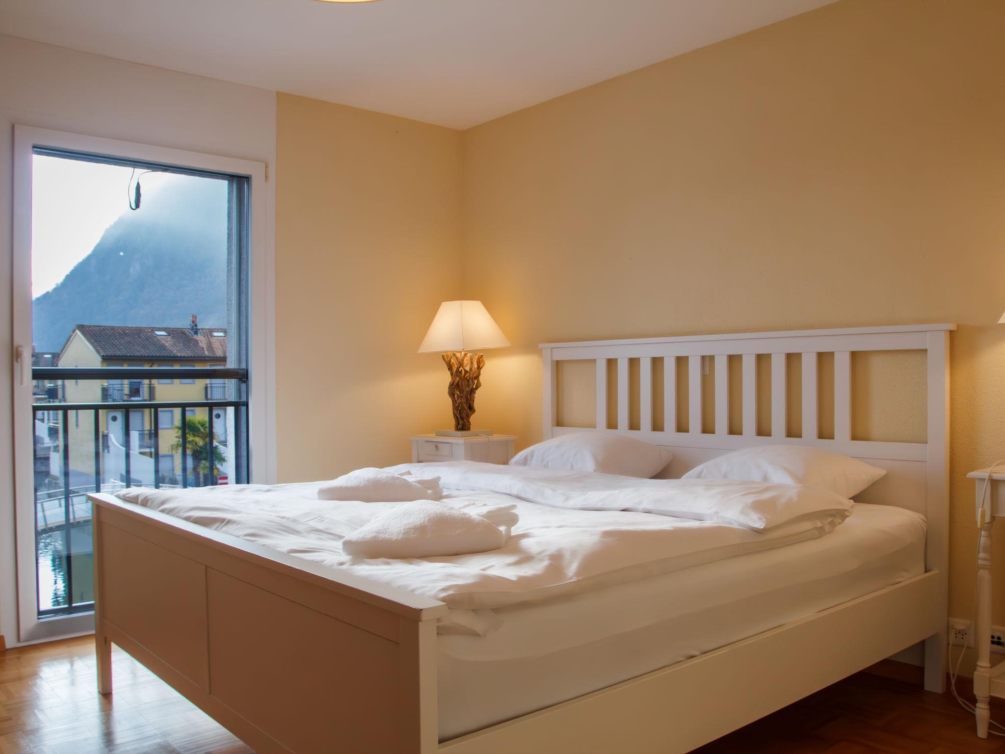 "Cook P1/2", 4-room apartment on 2nd floor. Object suitable for 6 adults + 2 children. Spacious and bright, beautiful and tasteful furnishings: open large living/dining room with panoramic window with dining table, cable TV and flat screen. Exit to the balcony. 1 room with 1 double bed (160 cm, length 200 cm), bath/WC. 1 room with 1 double bed (160 cm, length 200 cm). Exit to the balcony. 1 room with 1 bed (90 cm, length 190 cm), 1 x 2 bunk beds (90 cm, length 190 cm), 1 pull-out bed (1 pers. 2 x 90 cm, length 190 cm). Open kitchen (oven, dishwasher, 4 ceramic glass hob hotplates, toaster, kettle, microwave, freezer, electric coffee machine, Capsules for coffee machine (Nespresso) extra, fondue Set (cheese)) with bar. Shower/WC, sep. WC. Parquet floors. Balcony 7 m2. Balcony furniture, electric barbecue (portable), deck chairs (2). View of the mountains and the canal. Facilities: washing machine, dryer, children's high chair, baby cot for up to 3 year olds (extra), hair dryer. Internet (WiFi, free). Parking space n 189. Please note: suitable for families. Non-smokers only. CH49185