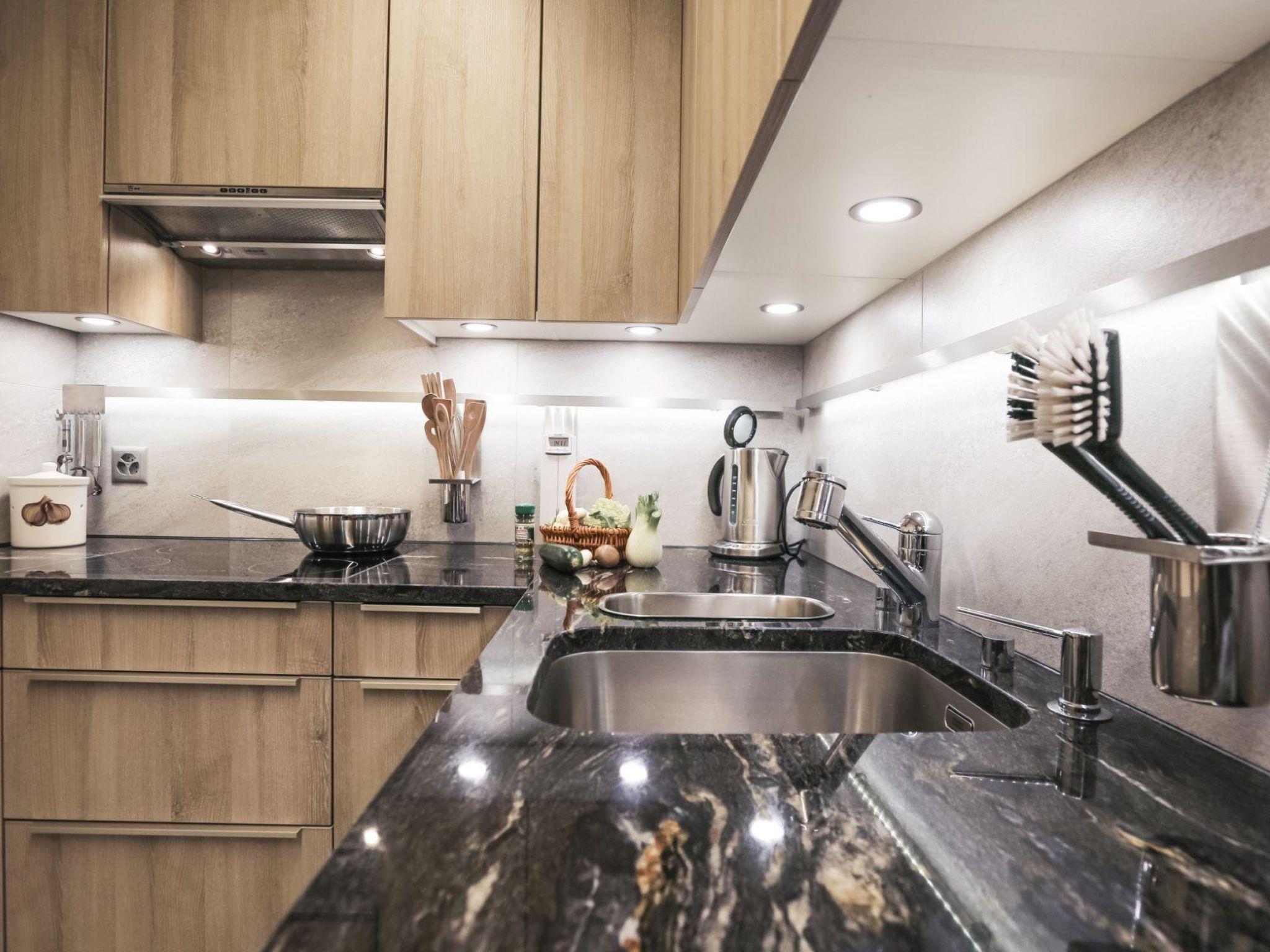 The majority of the single-family house is newly furnished with modern, fully equipped kitchen, living room with leather furniture, fireplace, dining table, mezzanine with leather sofa, TV, DVD, 1 double bedroom, 1 bedroom with 3 single beds, modern bathroom / WC (tub with shower) and shower / WC.