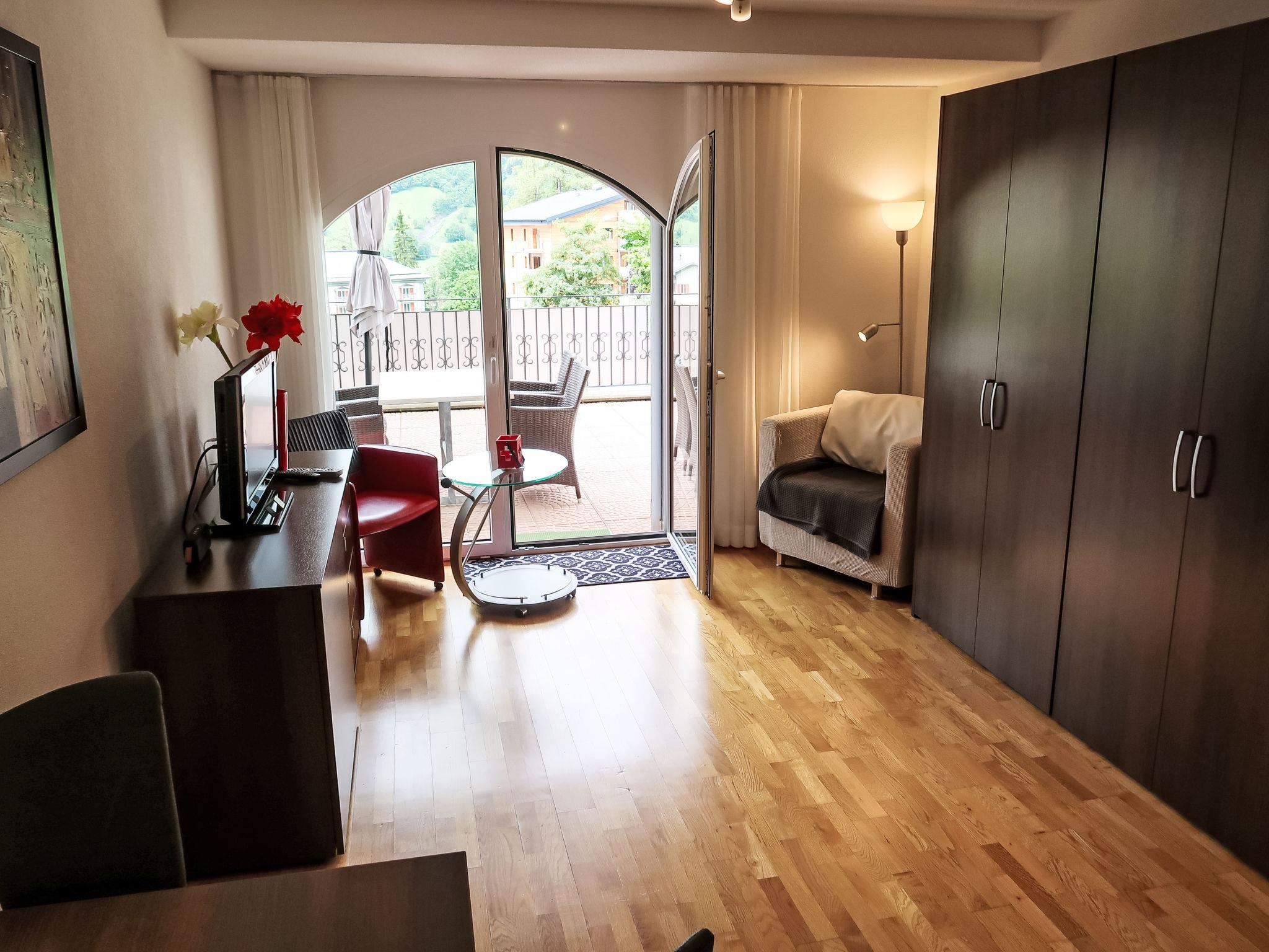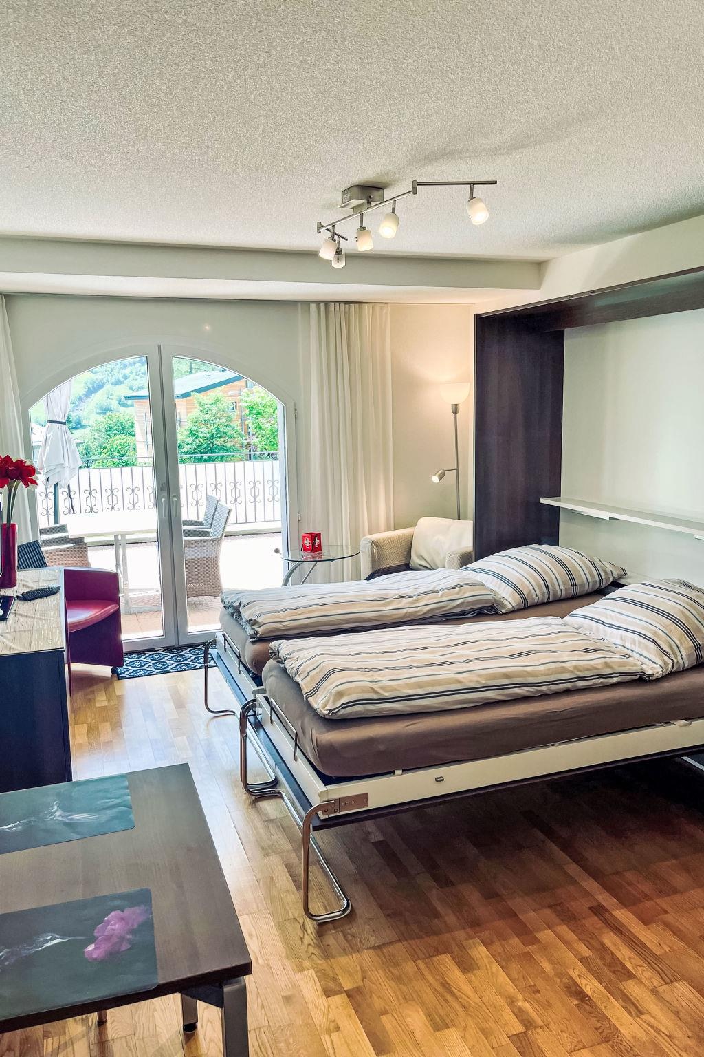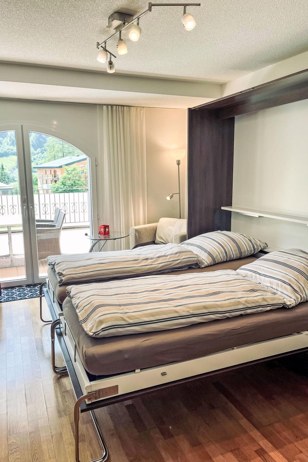 "A01", 1-room studio 32 m2, on the ground floor. Comfortable furnishings: living/sleeping room with 2 fold-away beds, dining table and satellite TV (flat screen), hi-fi system. Exit to the terrace. Open kitchen (oven, dishwasher, 4 ceramic glass hob hotplates, toaster, microwave, electric coffee machine, raclette grill, fondue Set (cheese)). Shower/WC. Large terrace. Terrace furniture, box-room. Marvellous view of the mountains. Facilities: Internet (WiFi, free). Parking (roofed). Please note: non-smokers only.