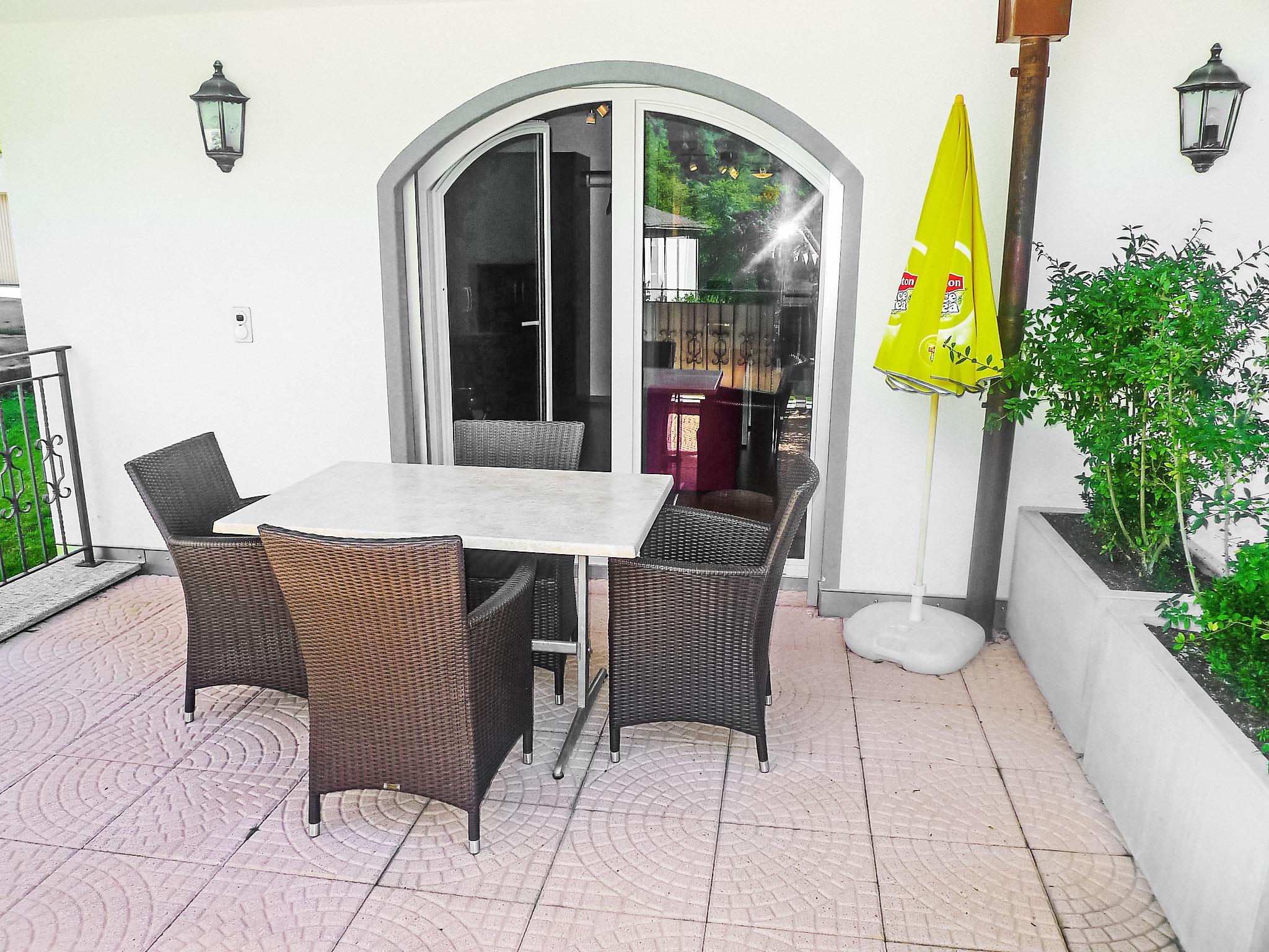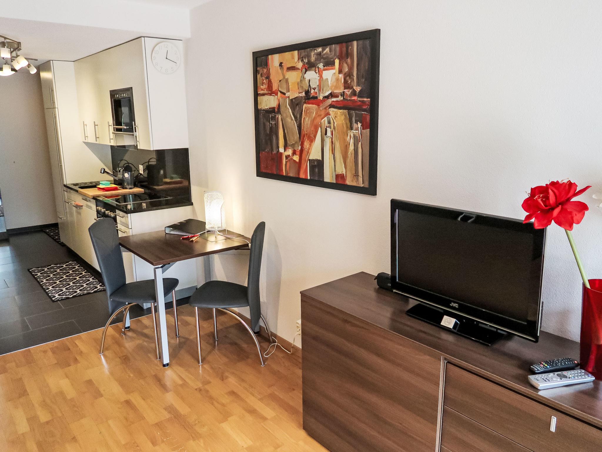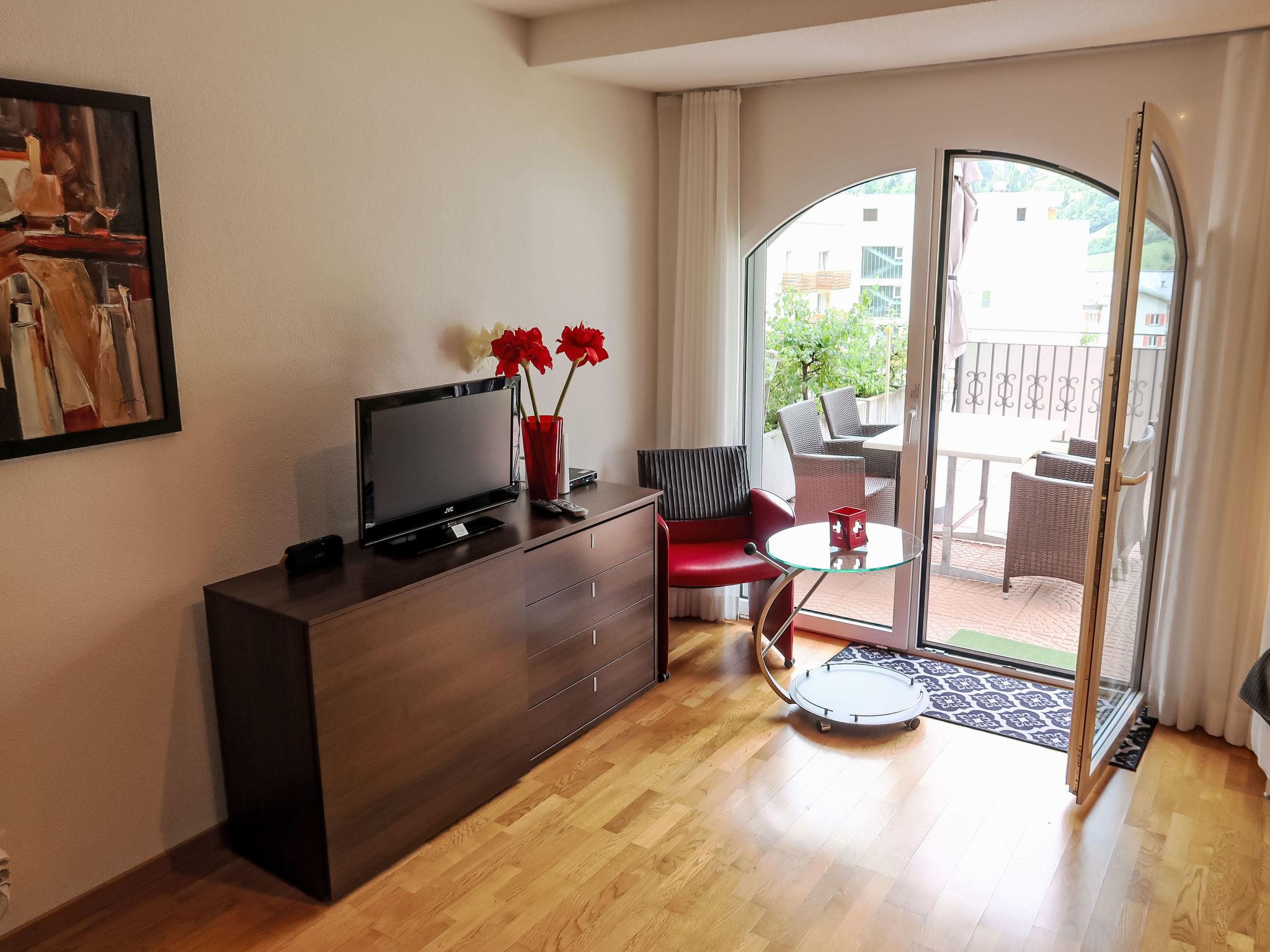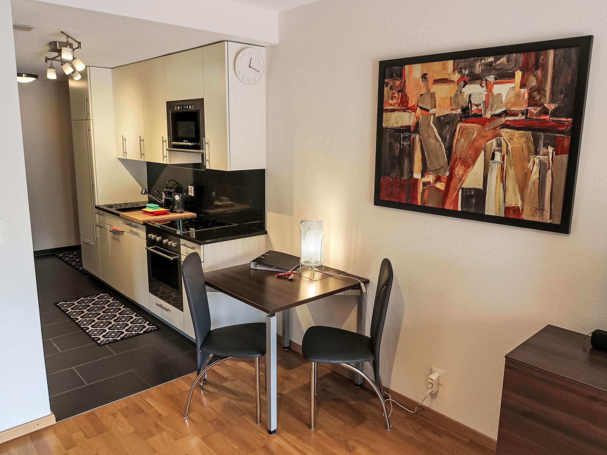 "A01", 1-room studio 32 m2, on the ground floor. Comfortable furnishings: living/sleeping room with 2 fold-away beds, dining table and satellite TV (flat screen), hi-fi system. Exit to the terrace. Open kitchen (oven, dishwasher, 4 ceramic glass hob hotplates, toaster, microwave, electric coffee machine, raclette grill, fondue Set (cheese)). Shower/WC. Large terrace. Terrace furniture, box-room. Marvellous view of the mountains. Facilities: Internet (WiFi, free). Parking (roofed). Please note: non-smokers only.
