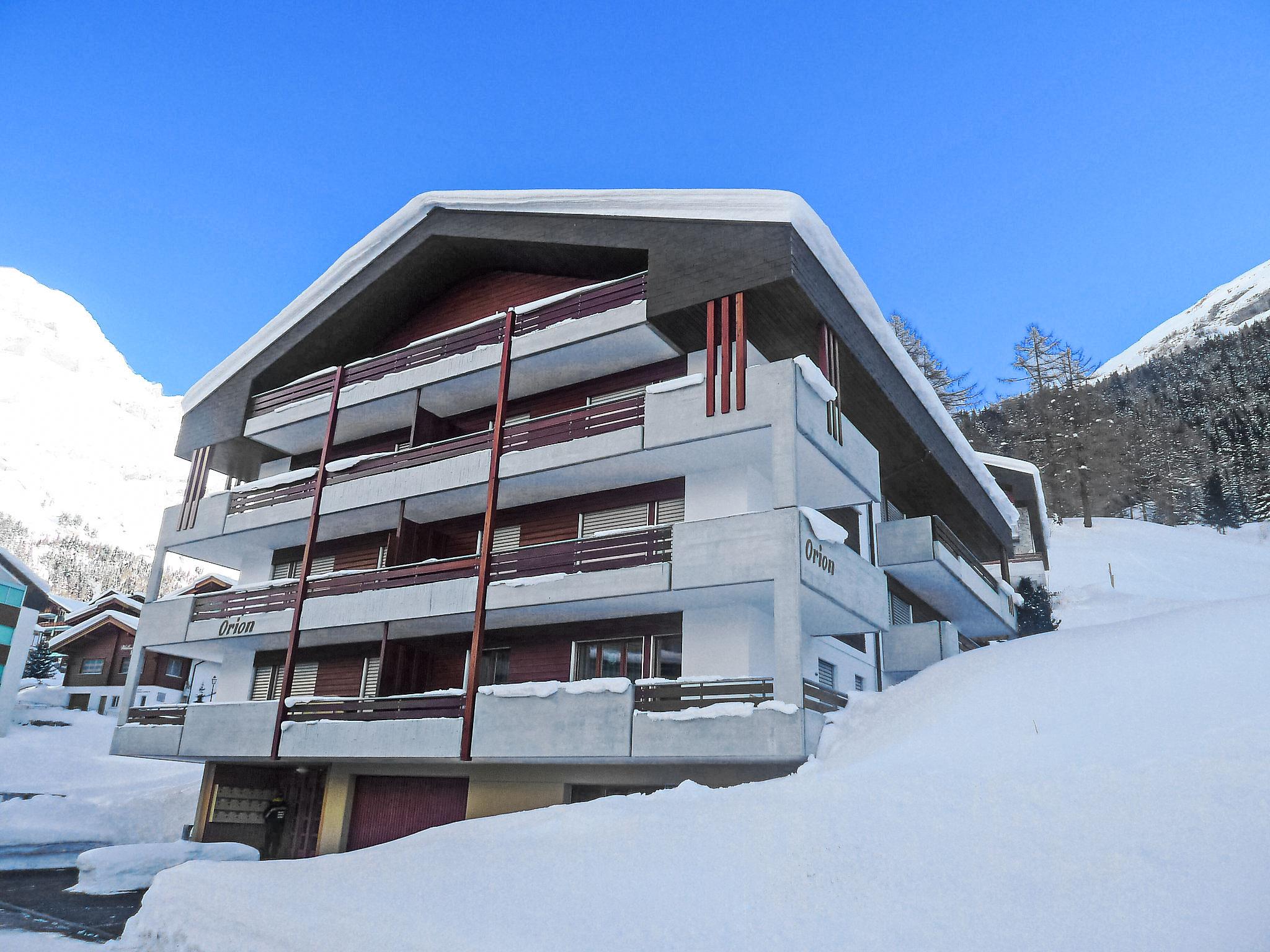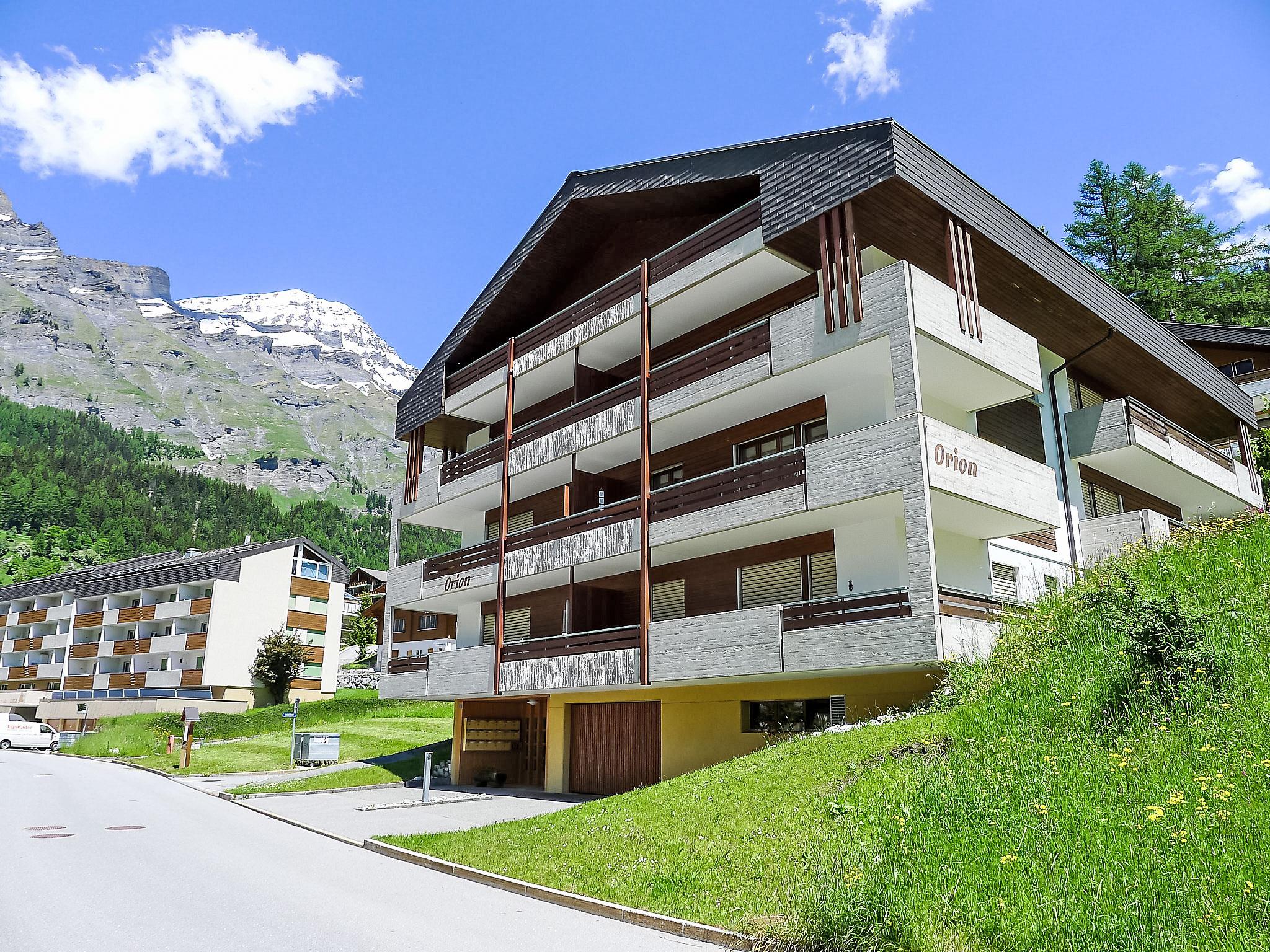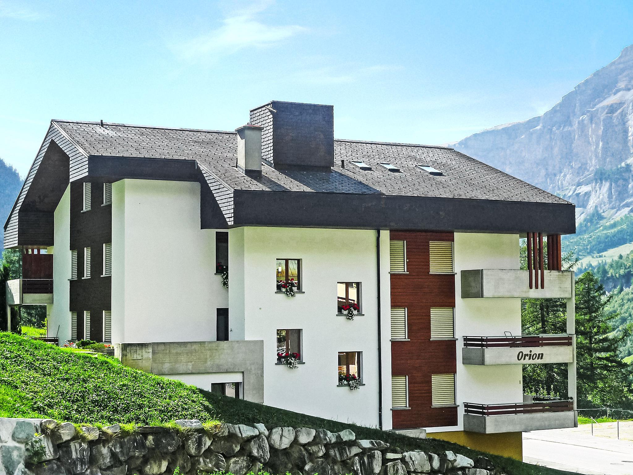 Cosy apartment block "Orion", 3 storeys, built in 1987. In a central, sunny, elevated position, located by a road. In the house: lift, storage room for skis, central heating system. Roofed, parking, communal covered parking. Shop, grocery 400 m, restaurant 100 m, bar, café 400 m, bus stop "Leukerbad, Obere Maressen" 200 m, thermal baths 400 m. Mountain railway, skisport facilities 600 m, ski bus stop 150 m, ice rink 1 km.
