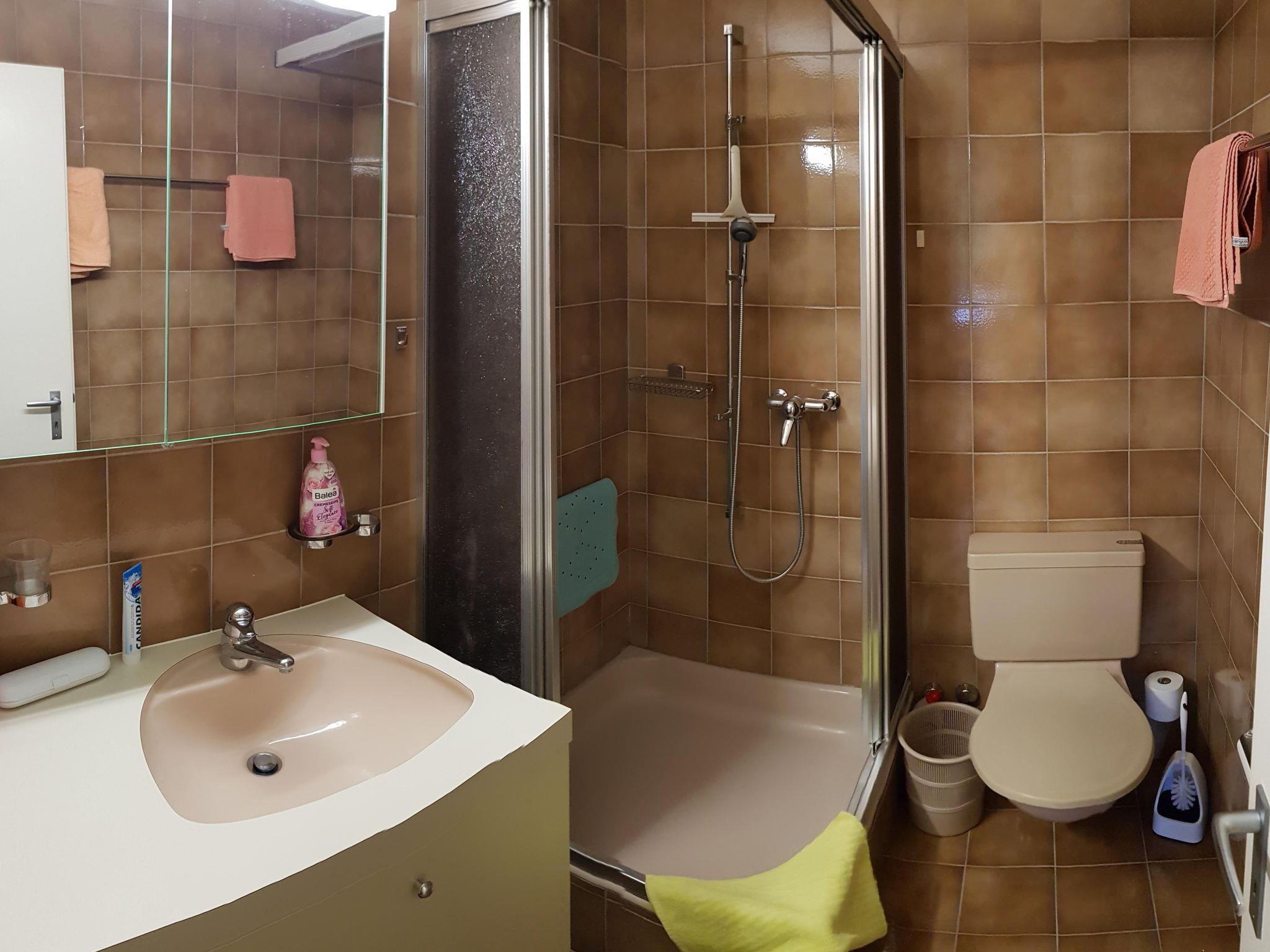 Bathroom - shower - WC - mirror cabinet - washbasin - hairdryer - towelling - laundry trolley for dirty laundry