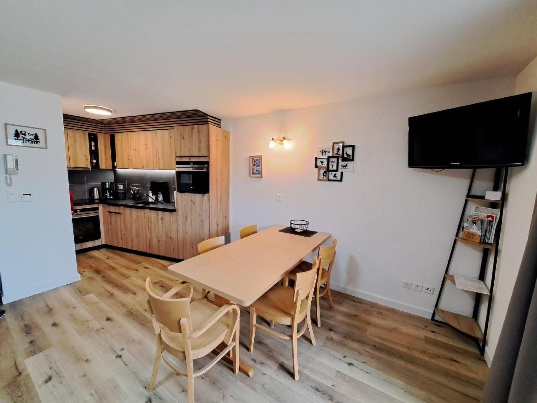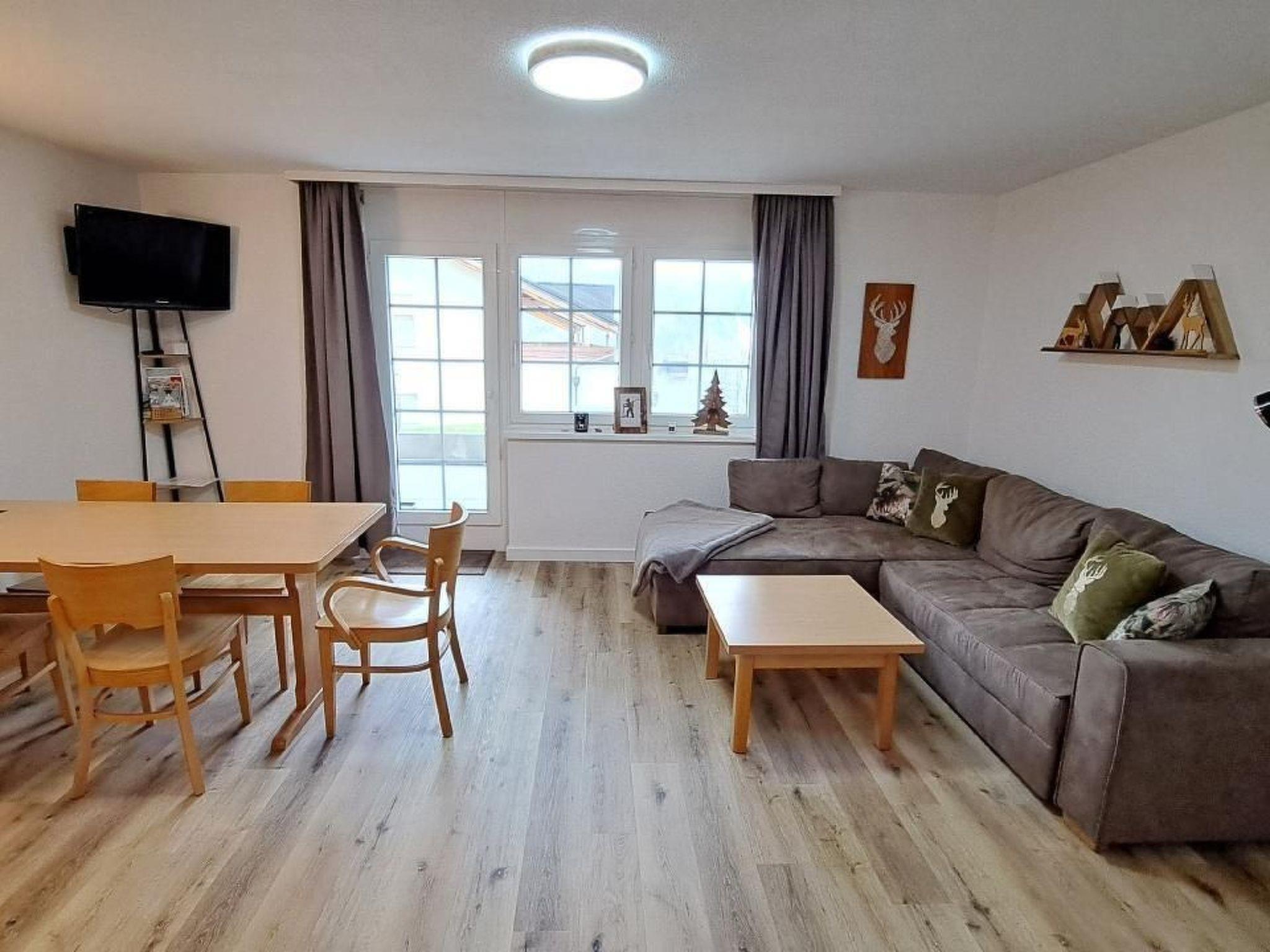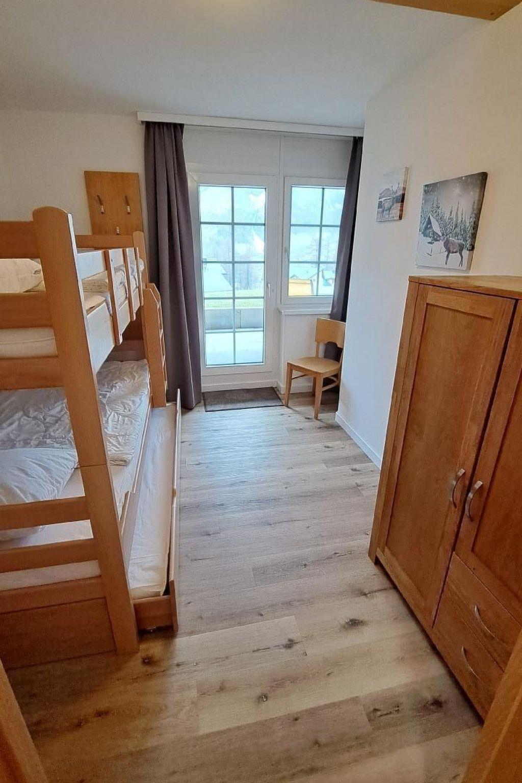 Flat 002 - 67 m2 Kitchen with fridge, oven, microwave, dishwasher, coffee machine (filter), kettle, toaster, fondue set, raclette set. Bedroom 1: Bunk beds 2x 90x200 cm, 1x 90x190 cm. Bedroom 2: double bed 180x200cm (2x 90x200cm). Bathroom 1: shower, towel dryer, WC Bathroom 2: shower and WC Living/dining room: sofa bed, TV, dining area for 5 people. 2 terraces with furniture and beautiful views of the mountains Laundry room, ski room. Car park.