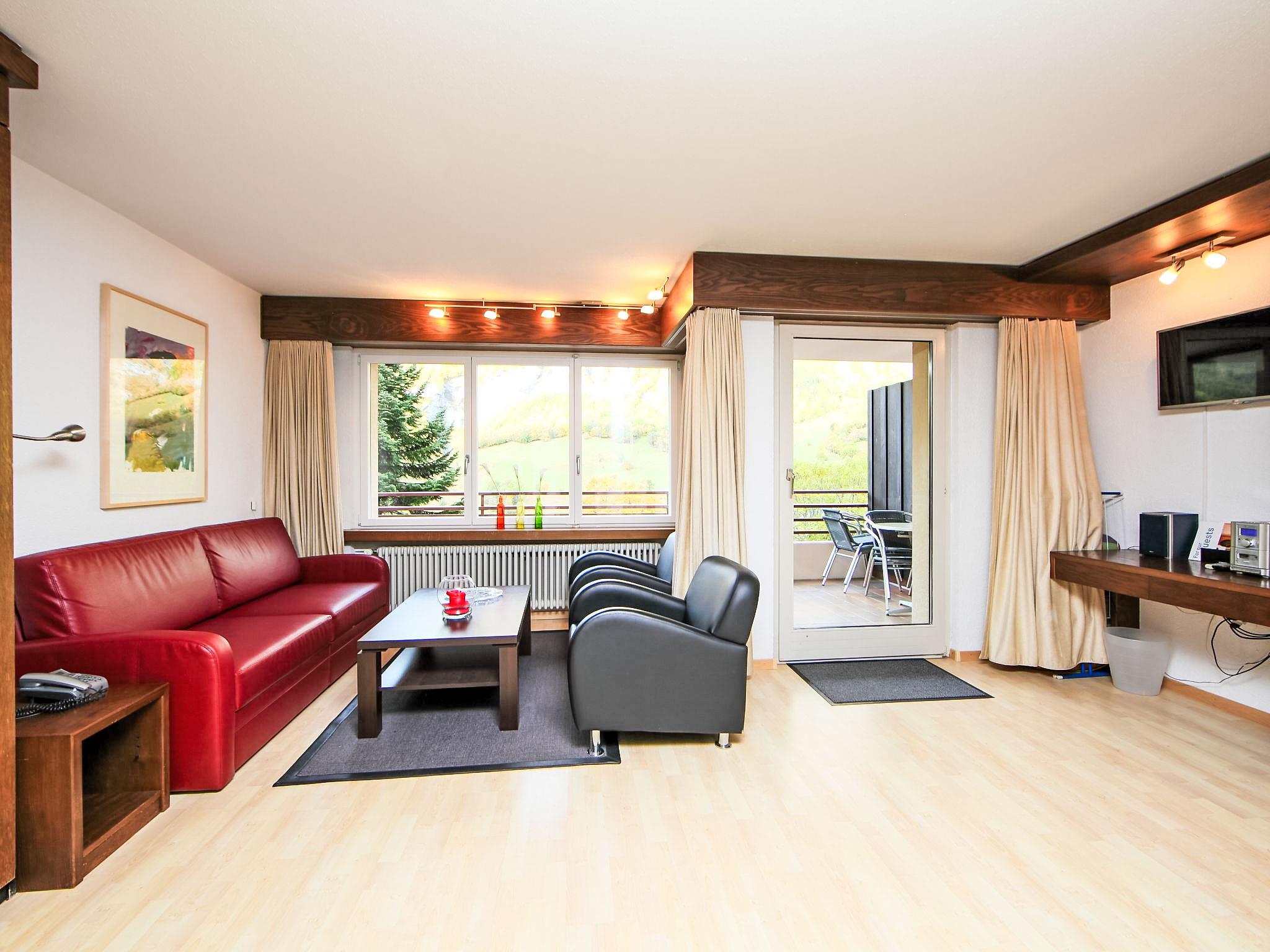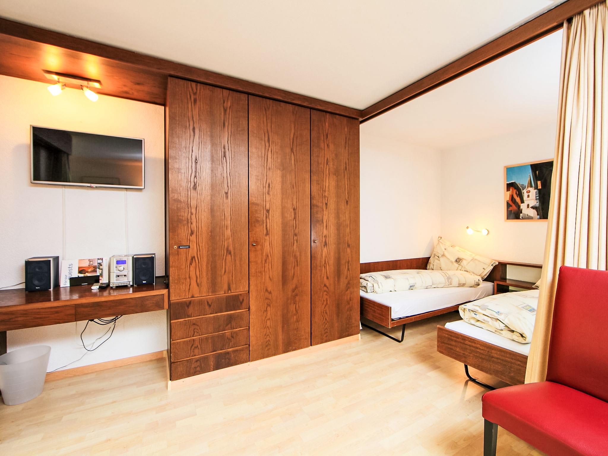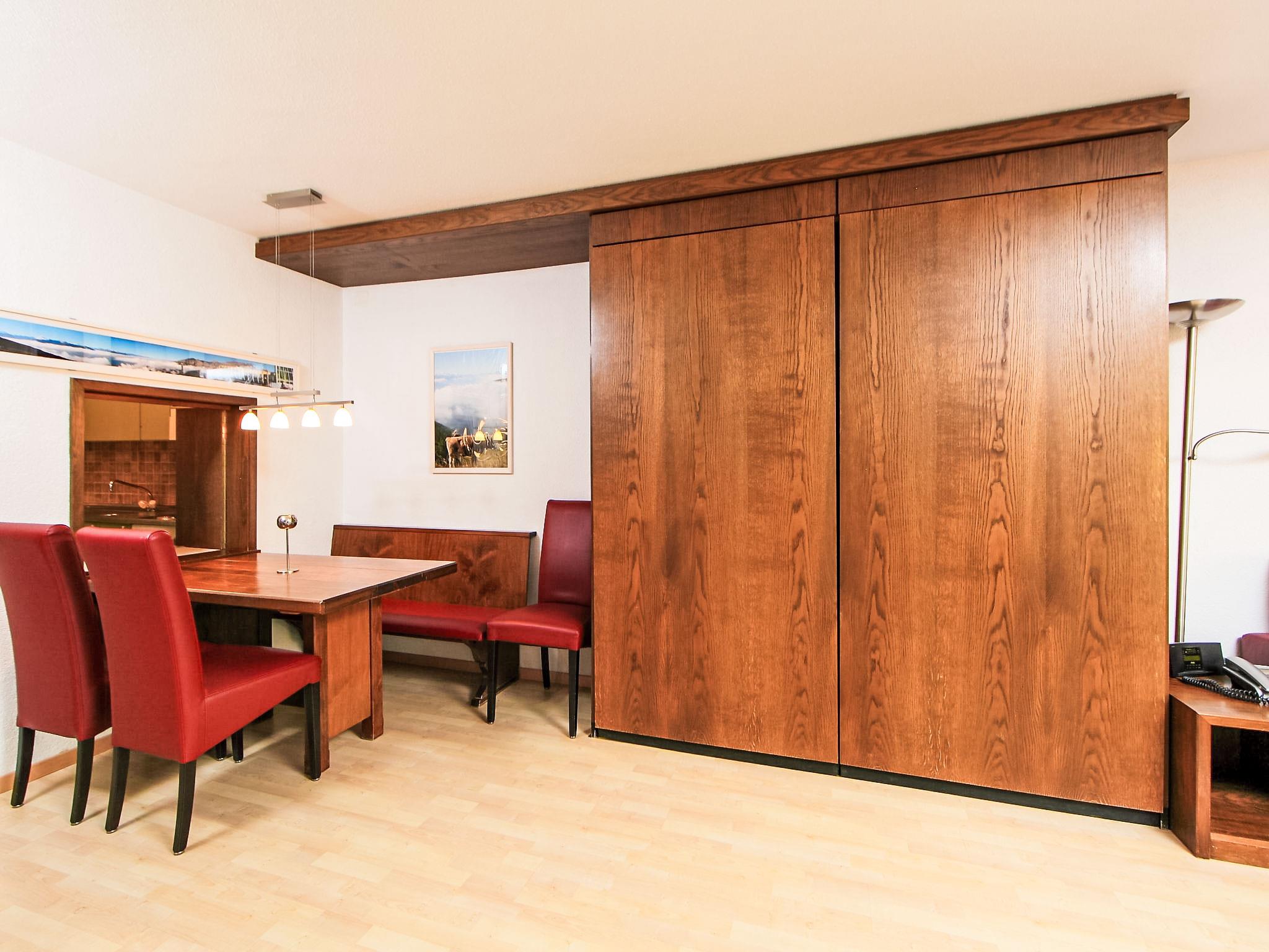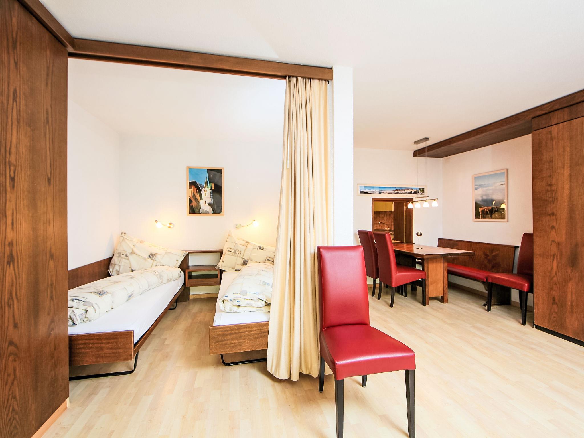 "Ringstrasse Apt 213", 1-room apartment 50 m2 on 2nd floor. Partly renovated in 2022, cosy furnishings: living/dining room with 2 fold-away beds and cable TV (flat screen). Alcove with curtain with 2 beds. Kitchen (oven, dishwasher, 4 ceramic glass hob hotplates, electric coffee machine, Capsules for coffee machine (Nespresso) extra). Bath/WC. Balcony. Terrace furniture. View of the mountains and the valley. Facilities: Internet (WiFi, free). Please note: non-smokers only. Instead of an enclosed bedroom, some sleeping areas are located in an open-plan area (gallery, alcove, etc.).