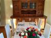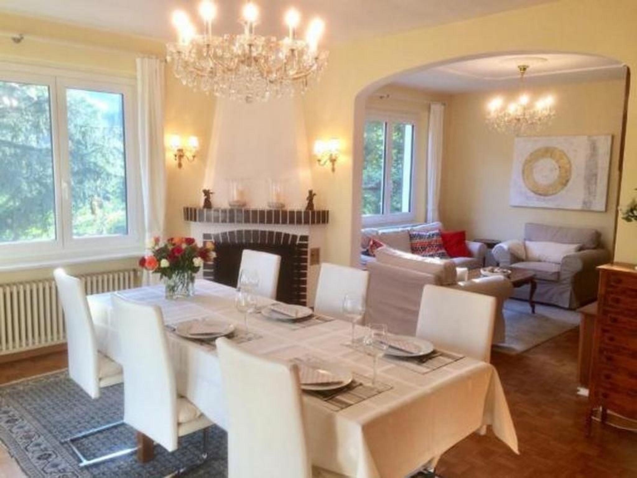 1 dining table for 6 people, 6 dining chairs, 1 baby dining chair if required, 1 height-adjustable high chair, 1 large buffet with wine glasses, secretary and drawer cabinet, large ceiling light, fireplace but not usable, double-leaf exit door to the covered terrace, heat-insulating windows and patio doors, curtains, fly screens