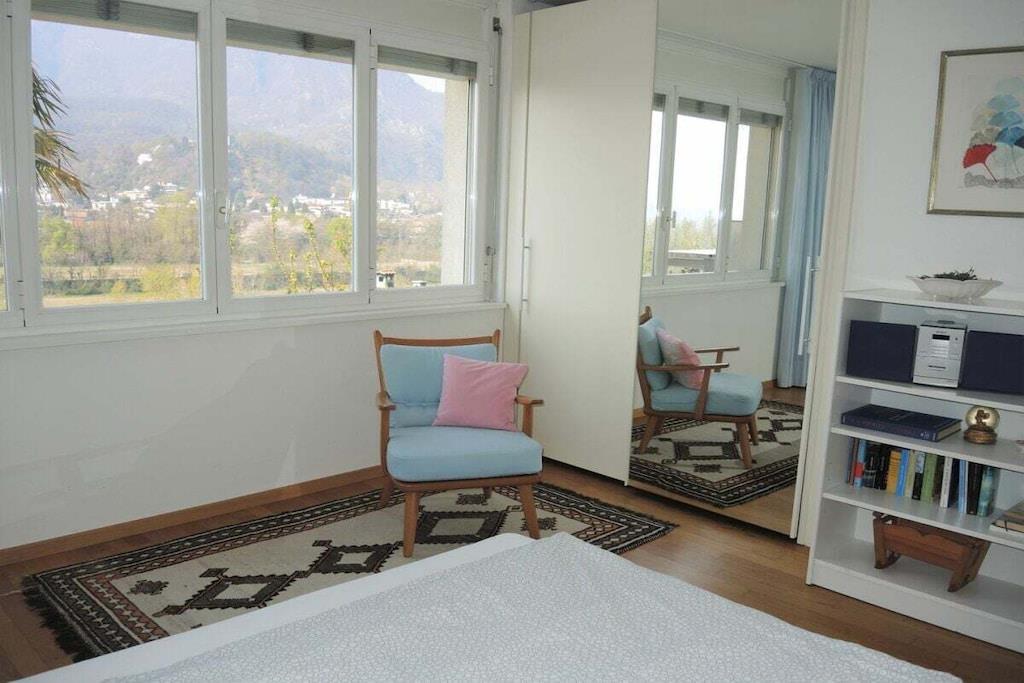• 3.5-room apartment in a two-family house, 80 m2 • 1st basement level • Sleeps 4 • Elevated, sunny location • Views of the countryside and the Maggia River • Pleasant, well-maintained interior • Covered balcony with dining table and sun blinds • Living/dining room with dining table, exit to the balcony • Blinds on the windows • Sofa set, coffee table • Flat-screen Swisscom TV • CD player, video player, radio • Wi-Fi • Fully equipped open kitchen • Ceramic hob, oven • Refrigerator with freezer compartment • Dishwasher, microwave • Filter coffee machine, kettle, toaster • 1 bedroom with double bed, 2 mattresses • 1 bedroom with French bed (140 cm) • Bathroom with shower/WC, bidet • Barbecues are permitted in the garden; guests must bring their own. • The house's garden is available for use. • 2 Sun loungers, seating, charcoal grill • 1 parking space in front of the house • Central heating • Pets not allowed • Non-smoking apartment • Centovalli bus stop and train station are about a 10-minute walk away