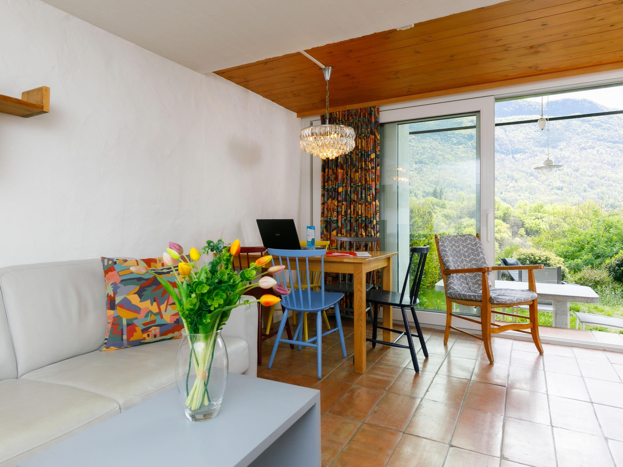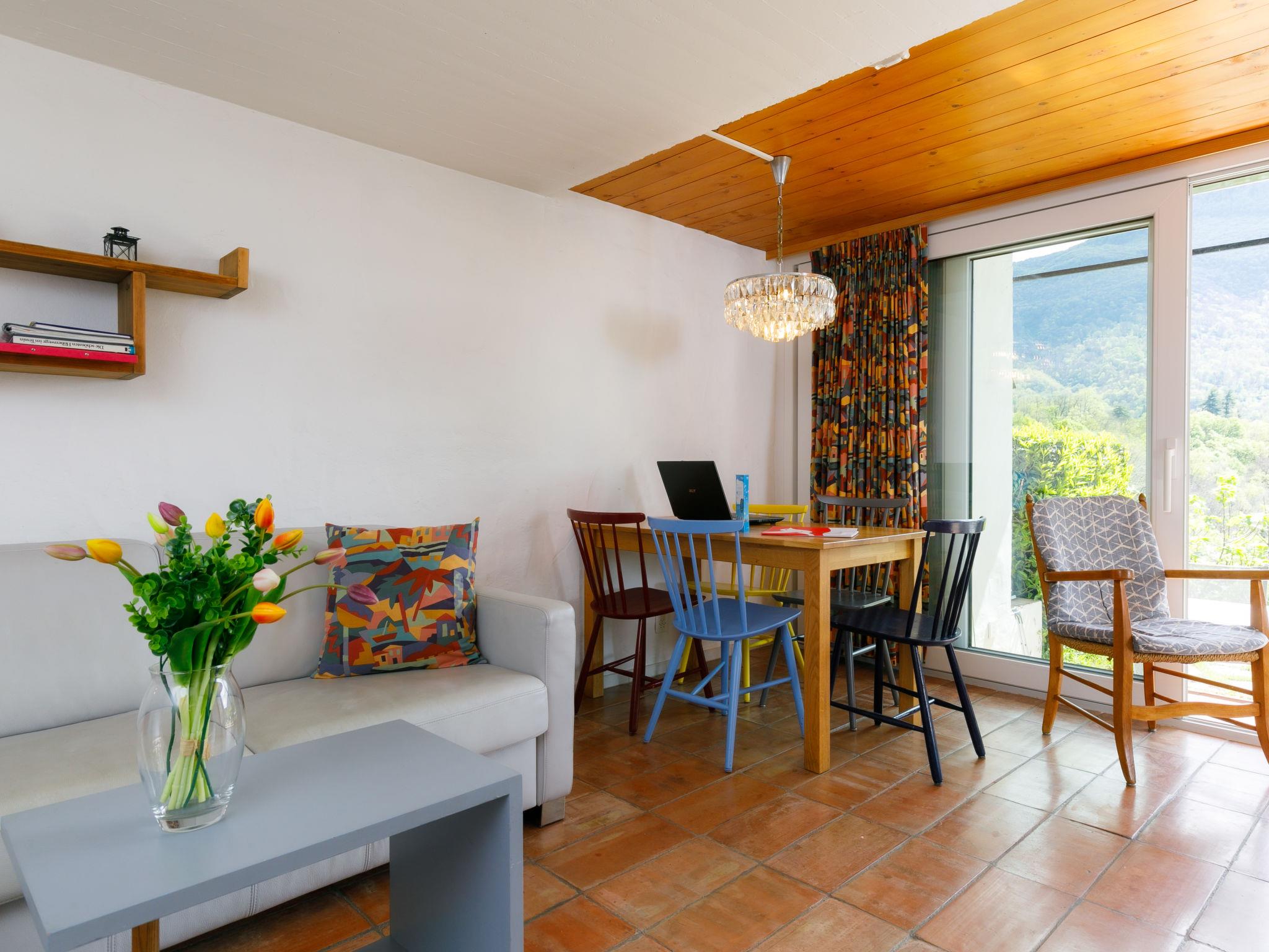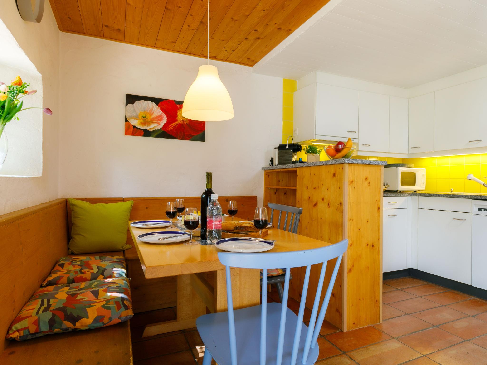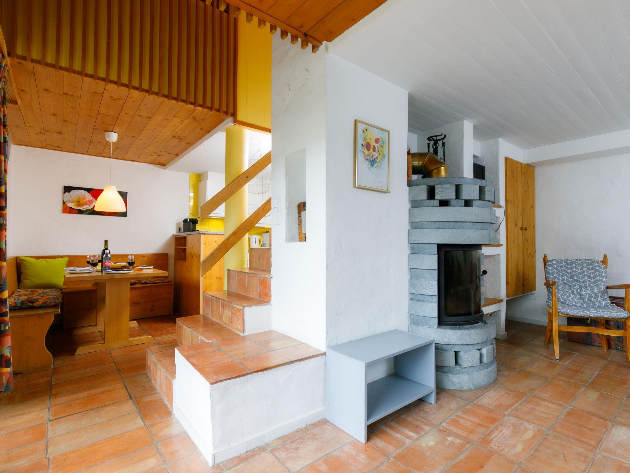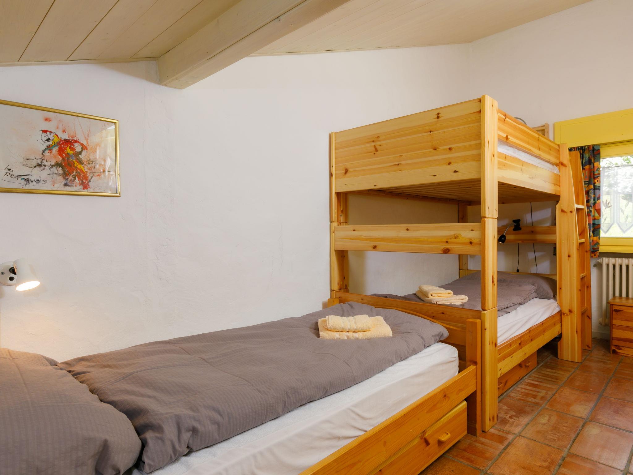 "Villaggio Sureggio A7 mit TicinoTicket", 3-room apartment 65 m2 on 2 levels. Comfortable and cosy furnishings: open living/dining room with open-hearth fireplace and satellite TV. Exit to the patio. (oven, dishwasher, 4 ceramic glass hob hotplates, toaster, kettle, microwave, electric coffee machine, Capsules for coffee machine (Nespresso) extra, raclette grill, fondue Set (chinoise, cheese)). Shower/WC. Electric heating. Upper floor: 1 double bedroom with 1 double bed (2 x 90 cm, length 200 cm). 1 room with 1 bed (90 cm, length 200 cm), 1 x 2 bunk beds (90 cm, length 200 cm). Shower/WC. Electric heating. Natural stone floors. Patio. Terrace furniture, deck chairs. Very beautiful panoramic view of the mountains and the countryside. Facilities: Internet (WiFi). Parking space n 8 (roofed). Please note: suitable for families. Non-smokers only, parking space for small car only. Maximum 1 pet/ dog allowed. Private entrance. NL-00011999