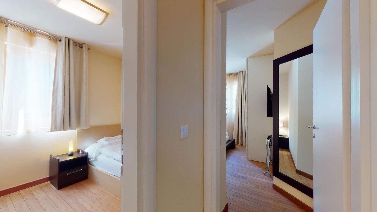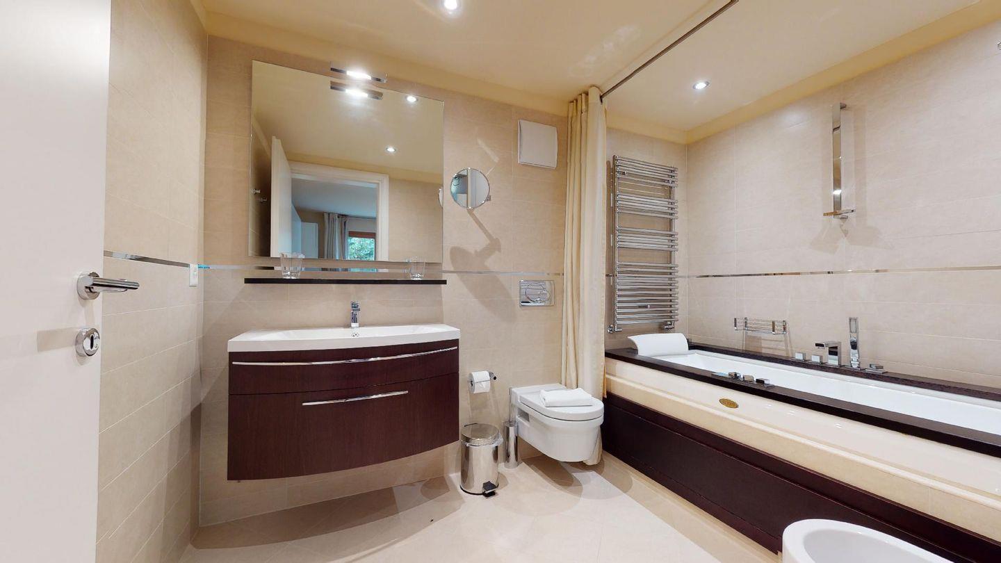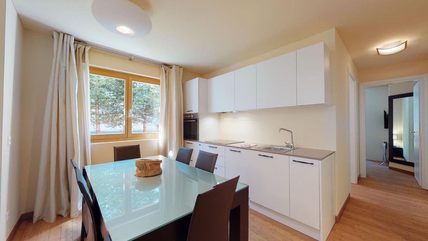 Moderne 3½ Zimmerwohnung im Erdgeschoss, ca. 58m² gross. Eingang mit Garderobe. Offenes Wohn- und Esszimmer mit Küchenzeile. Esstisch mit sechs Stühlen, ein Sofa, Smart-TV und Terrasse. Küche mit Herd, Ofen, Kühlschrank und Geschirrspüler. Ein Doppelzimmer mit Smart-TV. Ein Zimmer mit zwei Einzelbetten. Badezimmer mit Wanne, Lavabo, Toilette und Bidet. WLAN. Gemeinsamer Ski- und Veloraum, sowie Waschmaschine im Untergeschoss. 1 Parkplatz in der Tiefgarage (Höhe max. 210 cm).