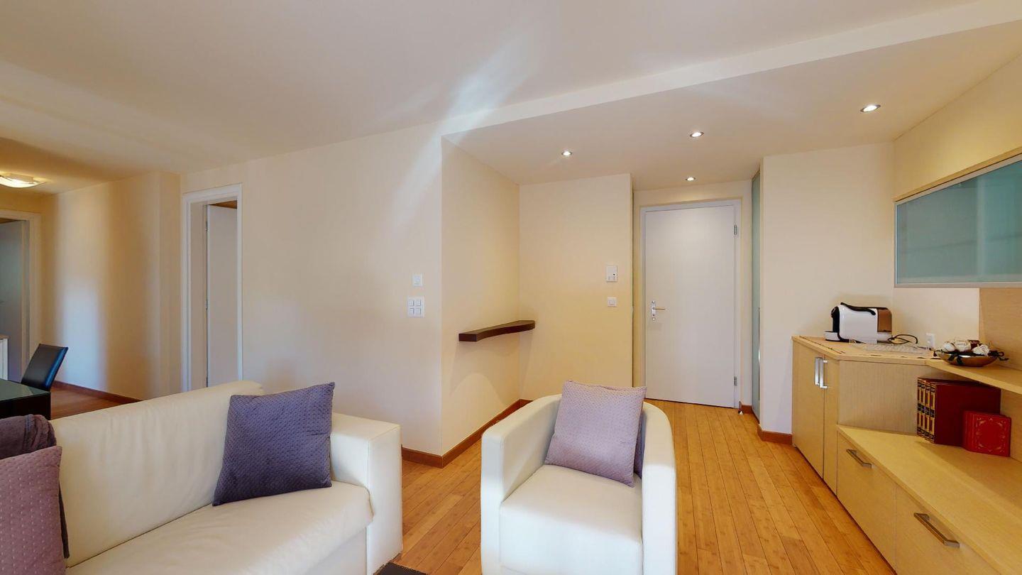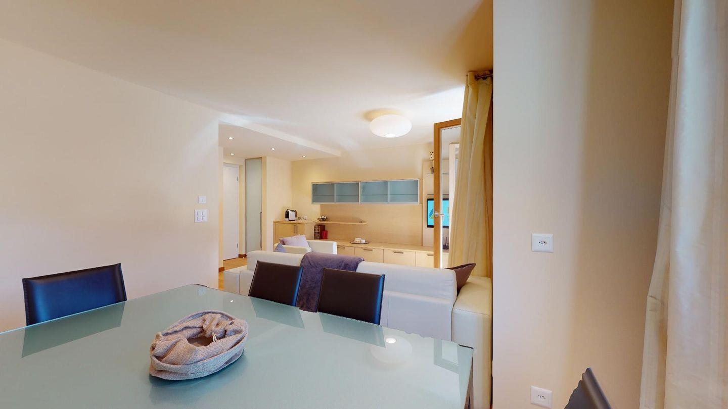 Moderne 3½ Zimmerwohnung im 1. Stock, ca. 59m² gross. Eingang mit Garderobe. Offenes Wohn- und Esszimmer mit Küchenzeile. Esstisch mit sechs Stühlen, ein Sofa, Smart-TV und Terrasse. Küche mit Herd, Ofen, Kühlschrank und Geschirrspüler. Ein Doppelzimmer mit Smart-TV. Ein Zimmer mit zwei Einzelbetten. Badezimmer mit Wanne, Lavabo, Toilette und Bidet. WLAN. Gemeinsamer Ski- und Veloraum, sowie Waschmaschine im Untergeschoss. 1 Parkplatz in der Tiefgarage (Höhe max. 210 cm).