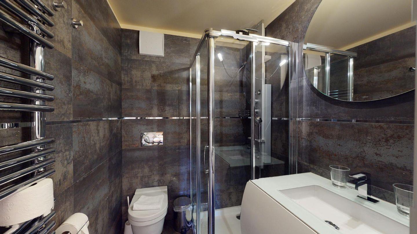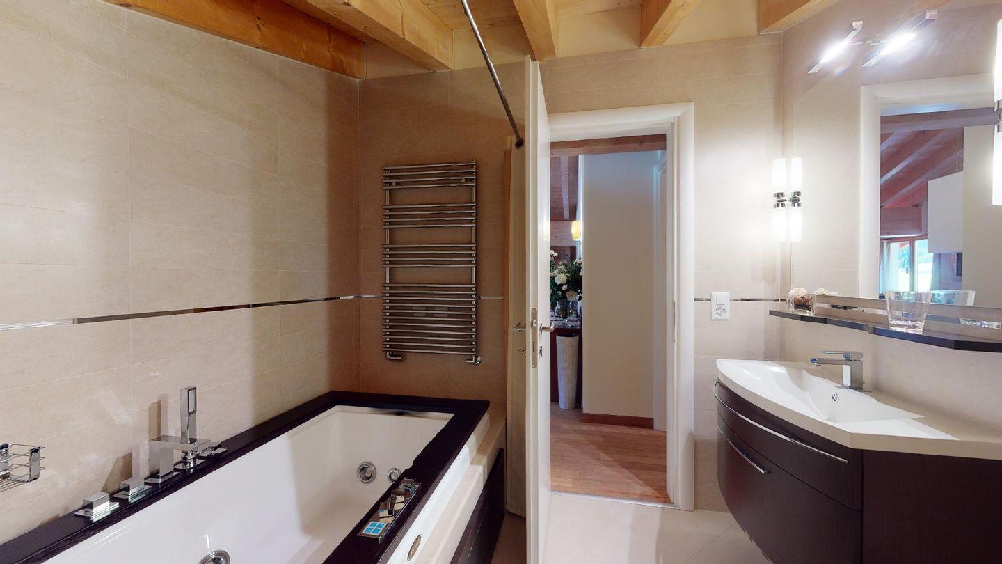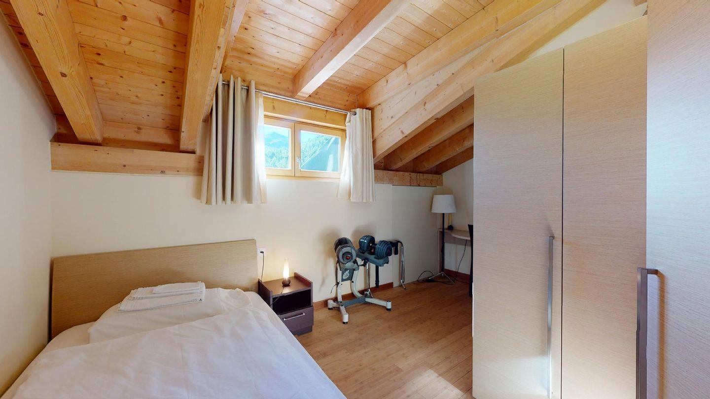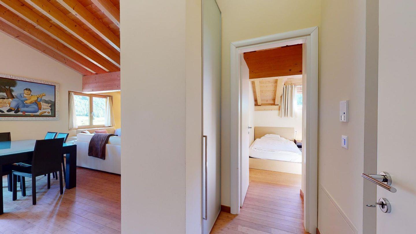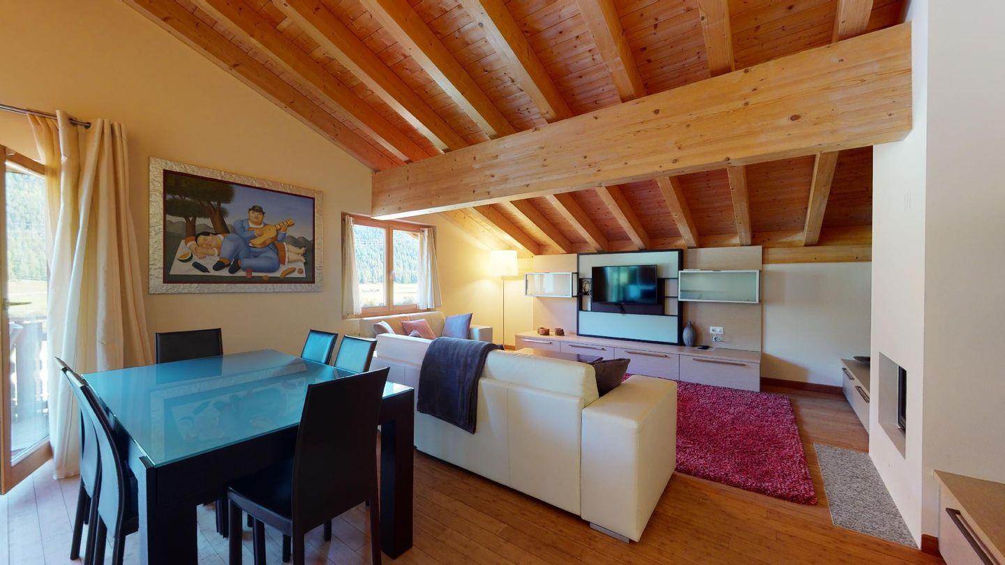 Moderne 4½ Zimmerwohnung im 2. Stock, ca. 90m² gross. Eingang mit Garderobe. Offenes Wohn- und Esszimmer mit Küchenzeile. Esstisch mit sechs Stühlen, zwei Sofas, Smart-TV, Kamin und Balkon. Küche mit Herd, Ofen, Kühlschrank und Geschirrspüler. Ein Doppelzimmer mit Smart-TV. Ein Zimmer mit einem Einzelbett. Ein Zimmer mit französischem Bett für 1 Person. Badezimmer mit Wanne, Lavabo, Toilette und Bidet. Badezimmer mit Dusche, Toilette und Lavabo. WLAN. Gemeinsamer Ski- und Veloraum, sowie Waschmaschine im Untergeschoss. Zwei Parkplätze in der Tiefgarage (Höhe max. 210 cm).