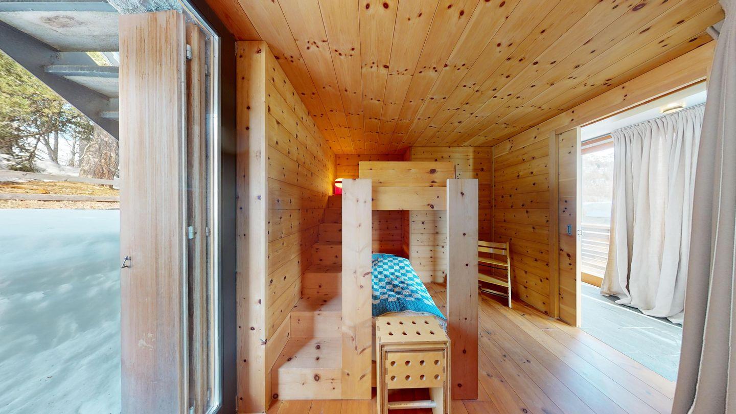 Schlafzimmer mit Etagenbett, Stauraum für Kleidung, Schreibtisch, Ausgang zum Garten und Fenster zum Gang.