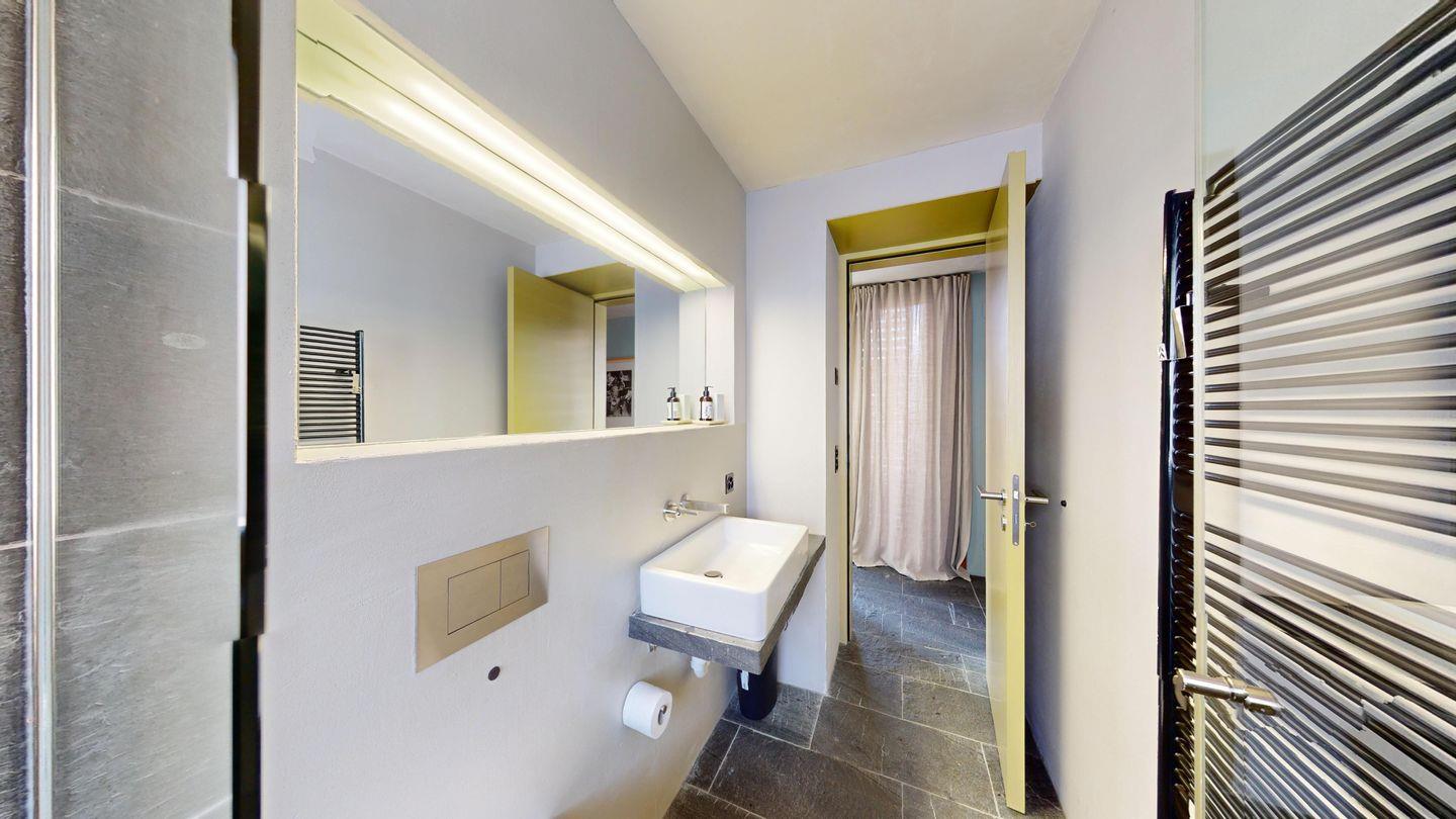 Badezimmer mit Dusche, Lavabo, WC, Handtuchwärmer und Fenster.