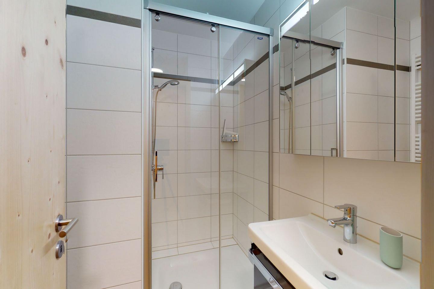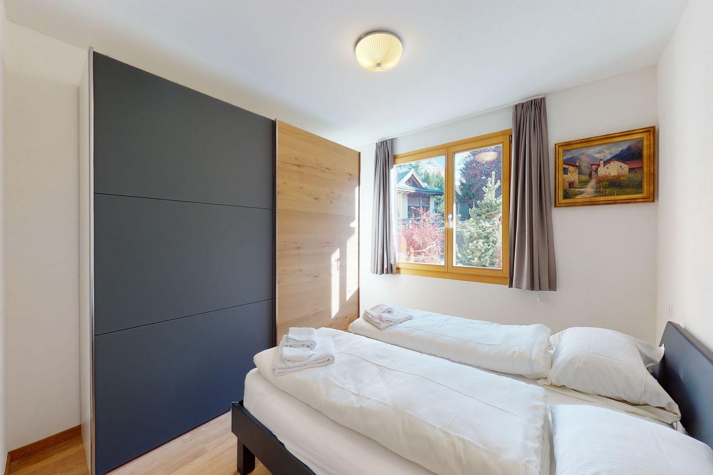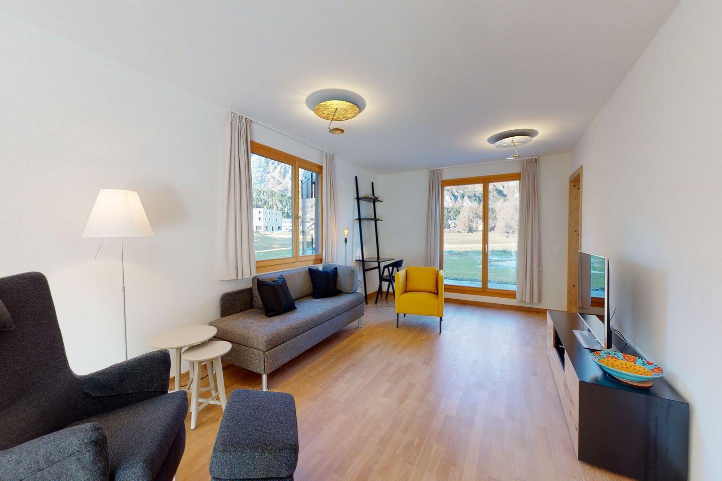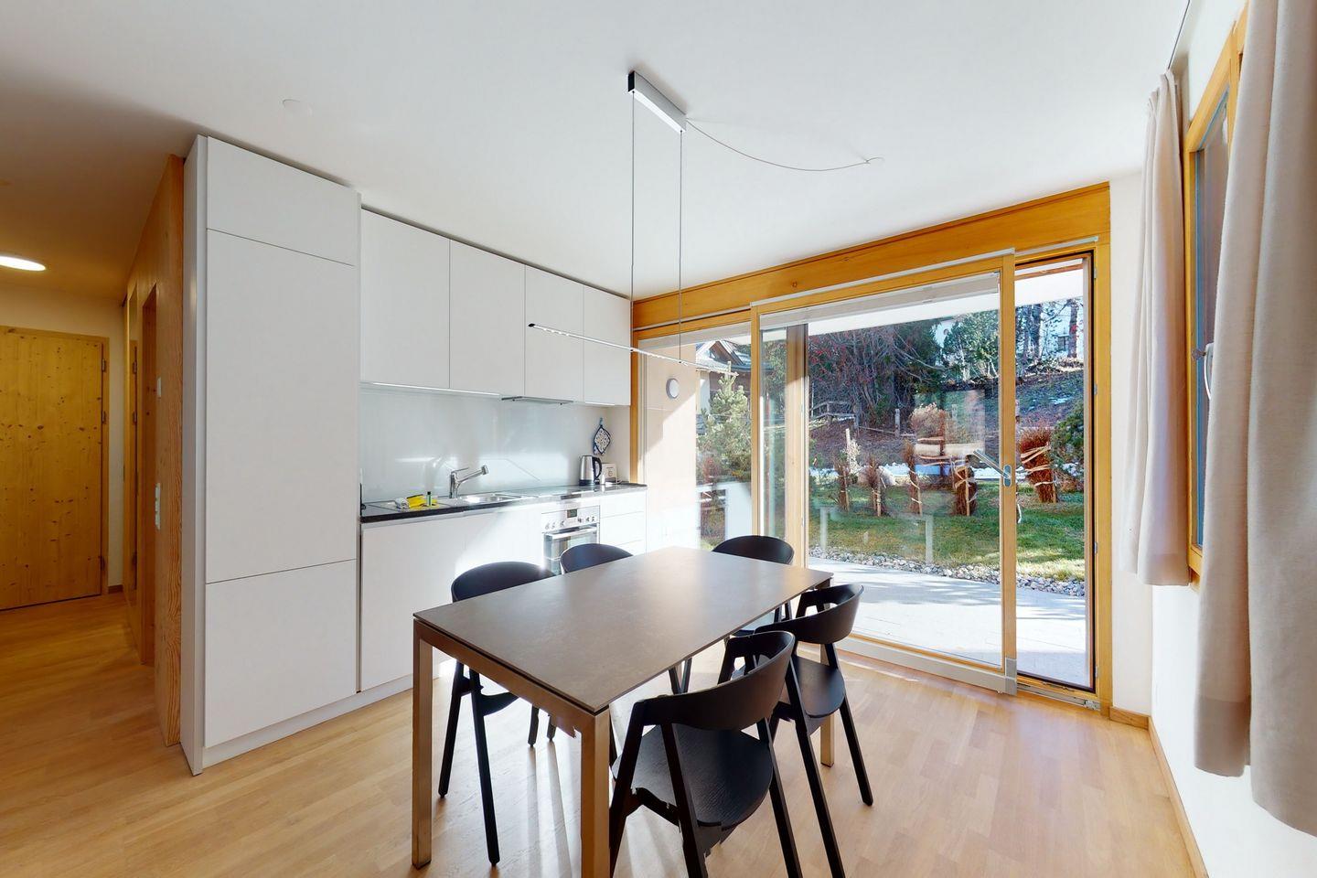 Die lichtdurchflutete Ferienwohnung verfügt über ein geräumiges Wohnzimmer mit bequemen Sofa, Sesseln und TV. Vom Wohnzimmer mit offener Küche und grossem Esstisch gelangen Sie auf zwei verschiedene Terrassen, die jeweils gegen Nord und Süd gelegen sind und eine imposante Aussicht auf die umliegende Bergwelt bieten. Die Küche ist komplett ausgestattet und verfügt über moderne Geräte. Auch die Schlafzimmer bieten eine einmalige Sicht auf die Berge und verfügen über je ein Doppelbett. In beiden Badezimmern befindet sich eine Dusche. Auch Waschmaschine und Tumbler finden Sie in der Wohnung vor. Ein Garagenparkplatz mit Elektro Ladestation sowie ein Skiraum mit eigenem Skiständer und Schuhheizung gehören zur Wohnung. Fahrräder finden in der Einstellhalle Platz.