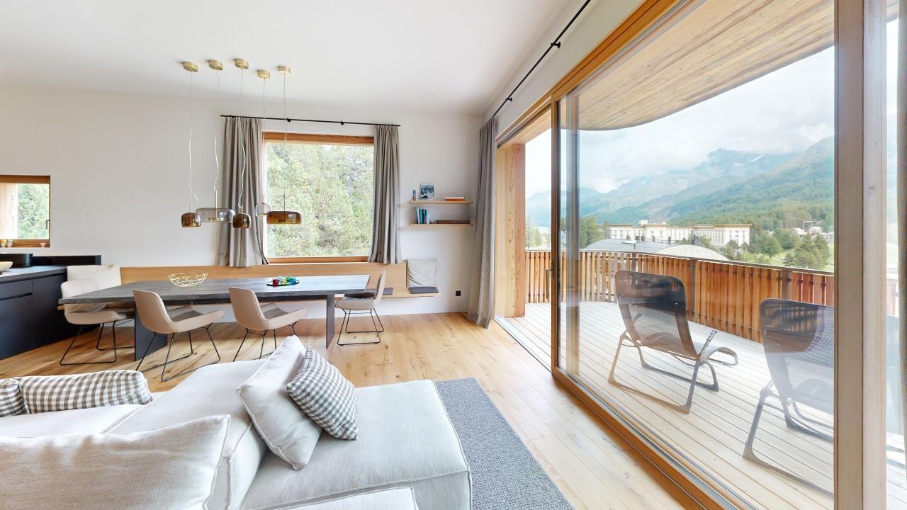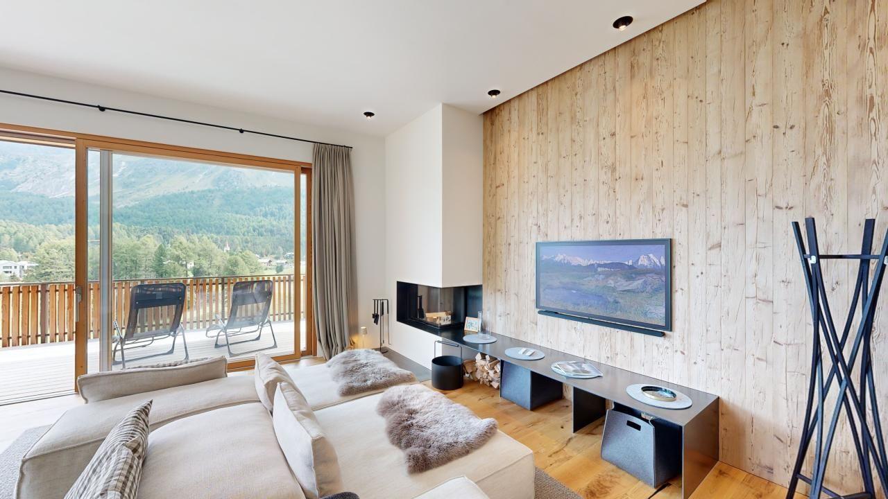 Die Küche ist mit modernsten Geräten ausgestattet und lädt zum gemeinsamen Kochen ein. Der lichtdurchflutete, modern eingerichtete Wohnbereich bietet eine entspannte Atmosphäre, um nach einem Tag auf der Piste oder in der Natur zur Ruhe zu kommen. Von der Wohnung aus geniessen Sie eine atemberaubende Panoramasicht auf die umliegende Berglandschaft.