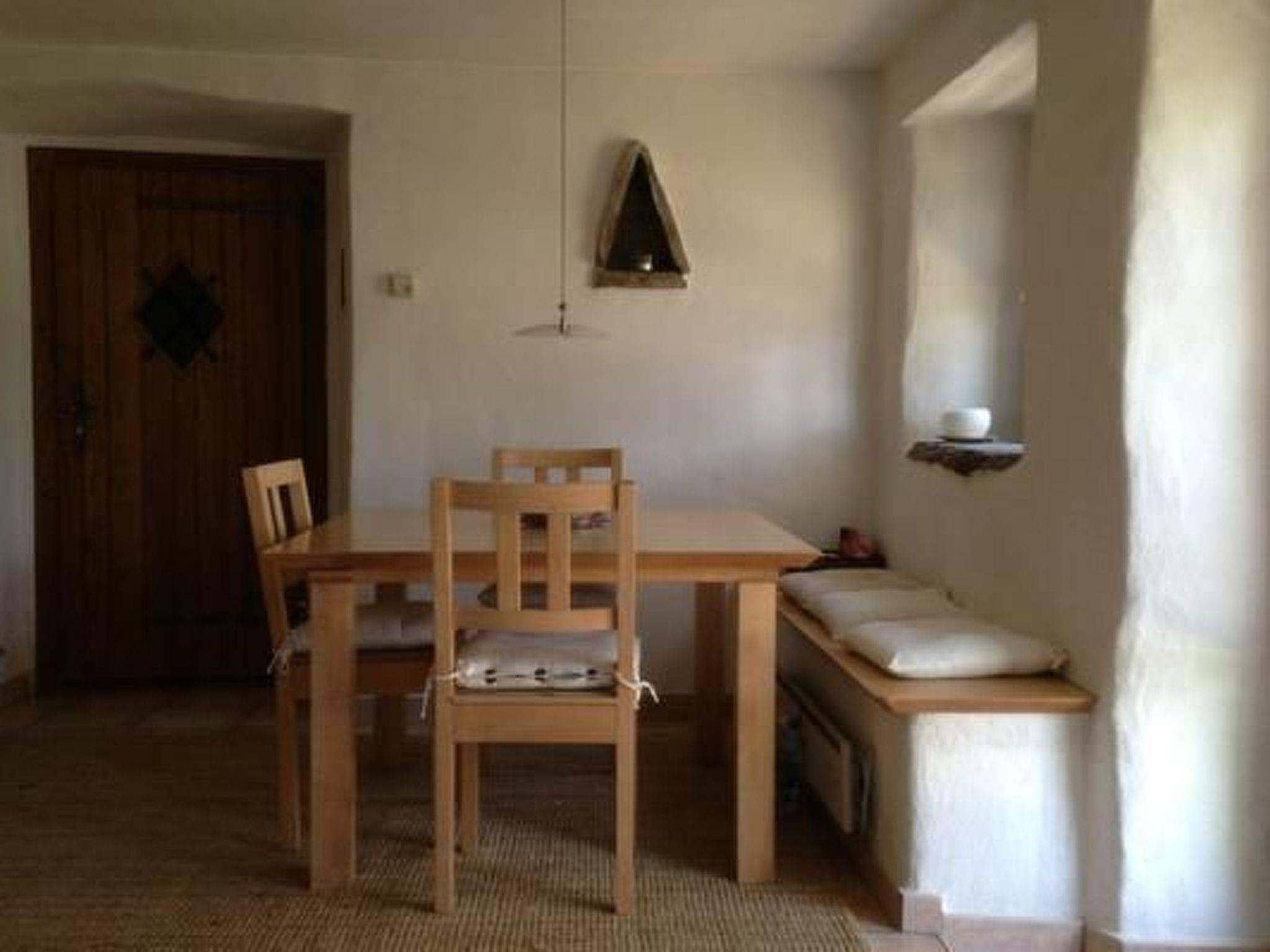 Other living room features (Living room1): Dining area with table, 3 chairs and bench. Couch with view on the fireplace. Little room with cleaning material. Room with washing machine, freezer