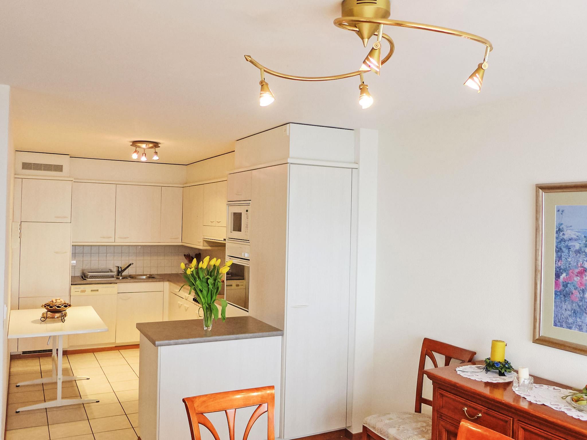 "Montreux - Panorama", 4-room apartment 129 m2 on 3rd floor. Spacious and bright, simple and practical furnishings: living/dining room with dining table and TV (flat screen). Exit to the balcony. 1 double bedroom with 1 double bed. Exit to the garden. 1 room with 1 fold-away bed. 1 room with 1 double bed (1 x 160 cm, length 200 cm). Open kitchen (oven, dishwasher, 4 ceramic glass hob hotplates, microwave, freezer) with small dining table. Bath/bidet/WC, 2 showers/WC. Large balcony. Balcony furniture. Very beautiful view of the lake, the mountains, the countryside and the resort. Facilities: washing machine, hair dryer. Internet (WiFi, free). Garage, height 190 cm, width 230 cm. Please note: non-smokers only. Maximum 1 pet/ dog allowed.