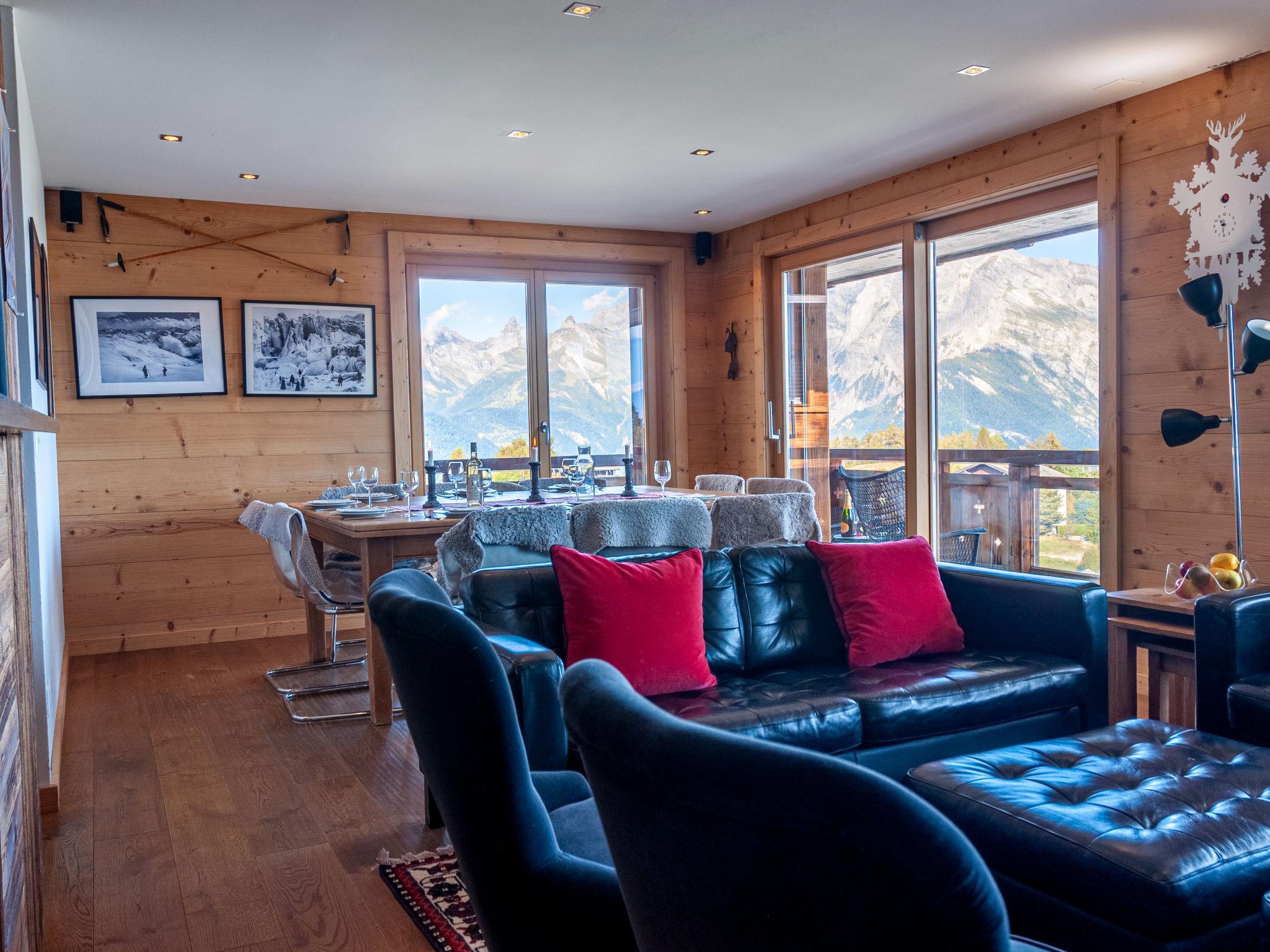 "Montagnard 10", 5-room apartment 166 m2 on 3rd floor. Comfortable and beautiful furnishings: living/dining room with open-hearth fireplace, cable TV and DVD. 1 room with 1 french bed (180 cm, length 200 cm), bath/shower/WC and double hand-basin. Exit to the balcony, north facing position. 1 room with 1 french bed (180 cm, length 200 cm), bath/shower/WC and double hand-basin. 1 room with 1 x 2 bunk beds (length 200 cm). Exit to the balcony, south facing position. 1 room with 1 x 2 bunk beds (length 200 cm). Open kitchen (oven, dishwasher, 4 ceramic glass hob hotplates, toaster, kettle, freezer, electric coffee machine, Capsules for coffee machine (Nespresso) extra, raclette grill, fondue Set (cheese)) with bar, separate WC. Bath/WC, double hand-basin. Balcony, north facing position and west facing position, small balcony, south facing position. Beautiful view of the mountains, the valley and the resort. Facilities: washing machine, dryer, hair dryer. Internet (WiFi, free). Parking space n Montagnard 10 (roofed), height 220 cm. Please note: suitable for families. Non-smokers only. 2 subscriptions to Spa Bisses are included in the rental price during the stay. This spa is part of the 4 Valleys Mer de Glace complex.