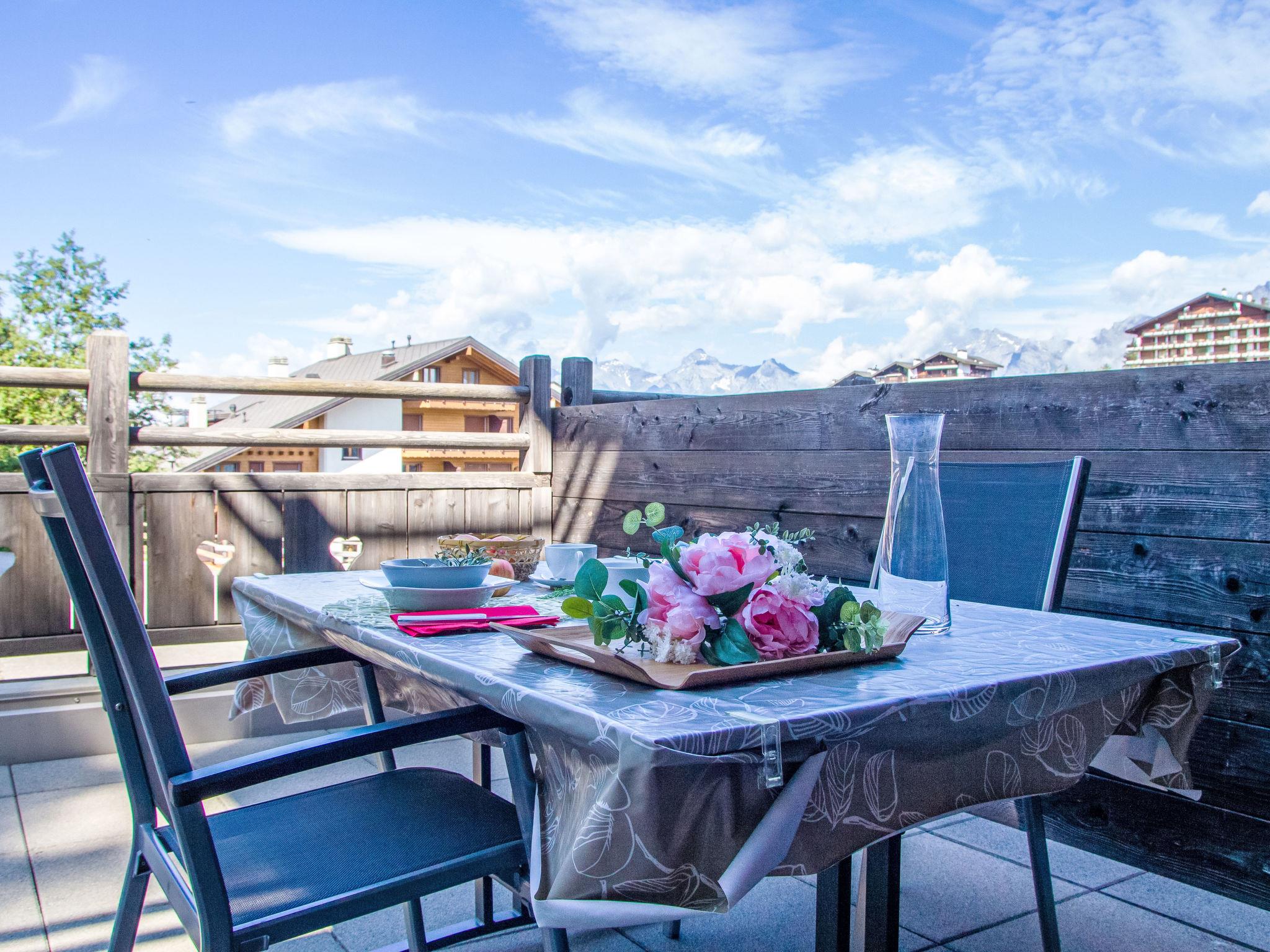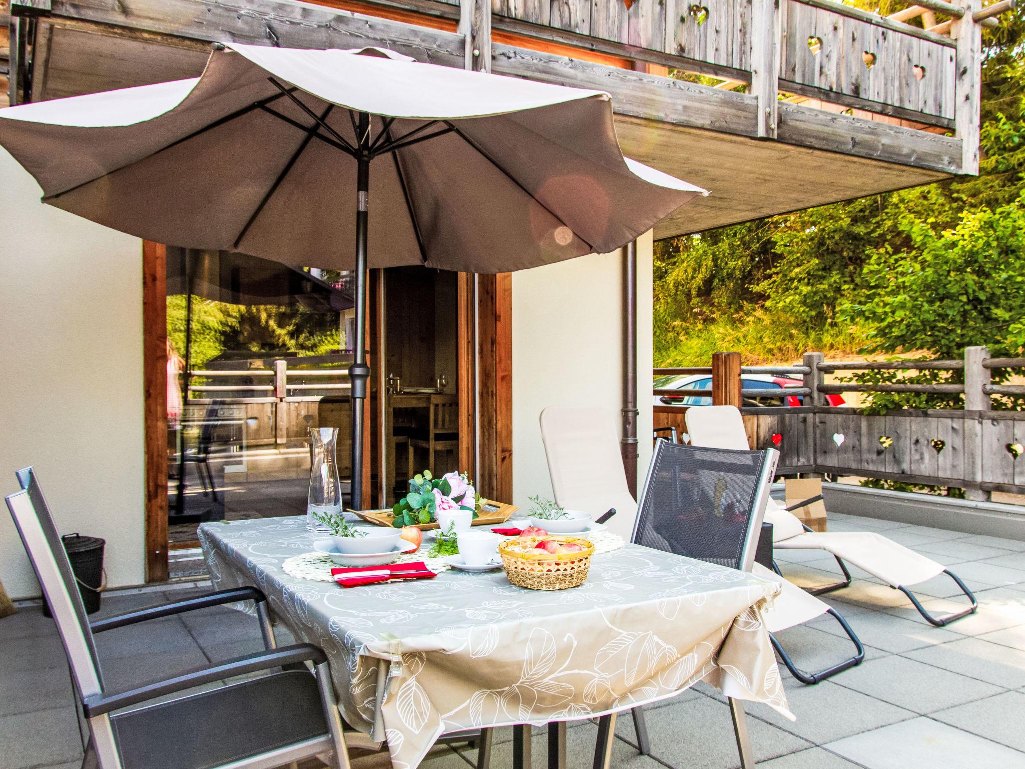 "la Ferme de Sandra F0", 2-room apartment 34 m2, on the ground floor, north-west facing position. Comfortable and beautiful furnishings: living room with panoramic window with cable TV. Exit to the terrace. 1 room 8 m2 with 1 french bed (140 cm, length 200 cm). Exit to the balcony. Open kitchen (oven, dishwasher, 4 ceramic glass hob hotplates, toaster, kettle, electric coffee machine, Capsules for coffee machine (nespresso) extra, raclette grill, fondue Set (chinoise, cheese)). Shower/WC. Large terrace 32 m2, north-west facing position. Barbecue (portable). View of the mountains. Facilities: hair dryer. Internet (WiFi, free). Parking space n 6. Please note: non-smokers only.
