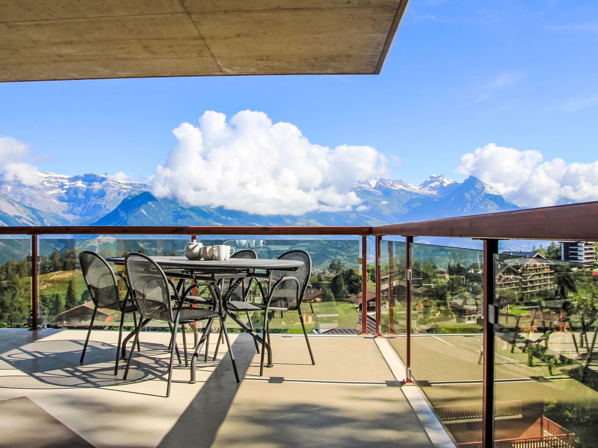"Domaine des Reines A9", 4-room apartment 100 m2 on 4th floor. Comfortable and cosy furnishings: living/dining room with DVD. Exit to the balcony, north facing position and east facing position. 1 room with 1 french bed (140 cm, length 200 cm). Exit to the balcony, east facing position. 1 room with 2 beds (90 cm, length 200 cm). Exit to the balcony, south facing position. 1 room with 1 french bed (160 cm, length 200 cm). Open kitchen (oven, dishwasher, 4 ceramic glass hob hotplates, toaster, kettle, microwave, electric coffee machine, Capsules for coffee machine (Nespresso) extra, fondue Set (cheese)). Bath/WC, shower/WC. Balcony, north facing position and, east facing position. Balcony furniture. Beautiful view of the mountains. Facilities: Internet (WiFi, free). Parking space n A9. Please note: non-smokers only. Maximum 1 pet/ dog allowed.
