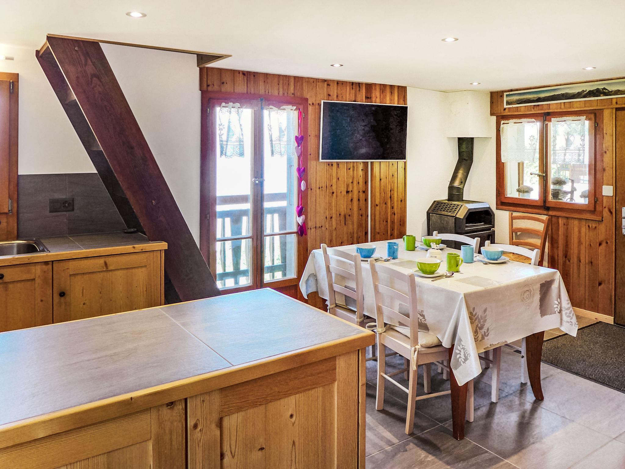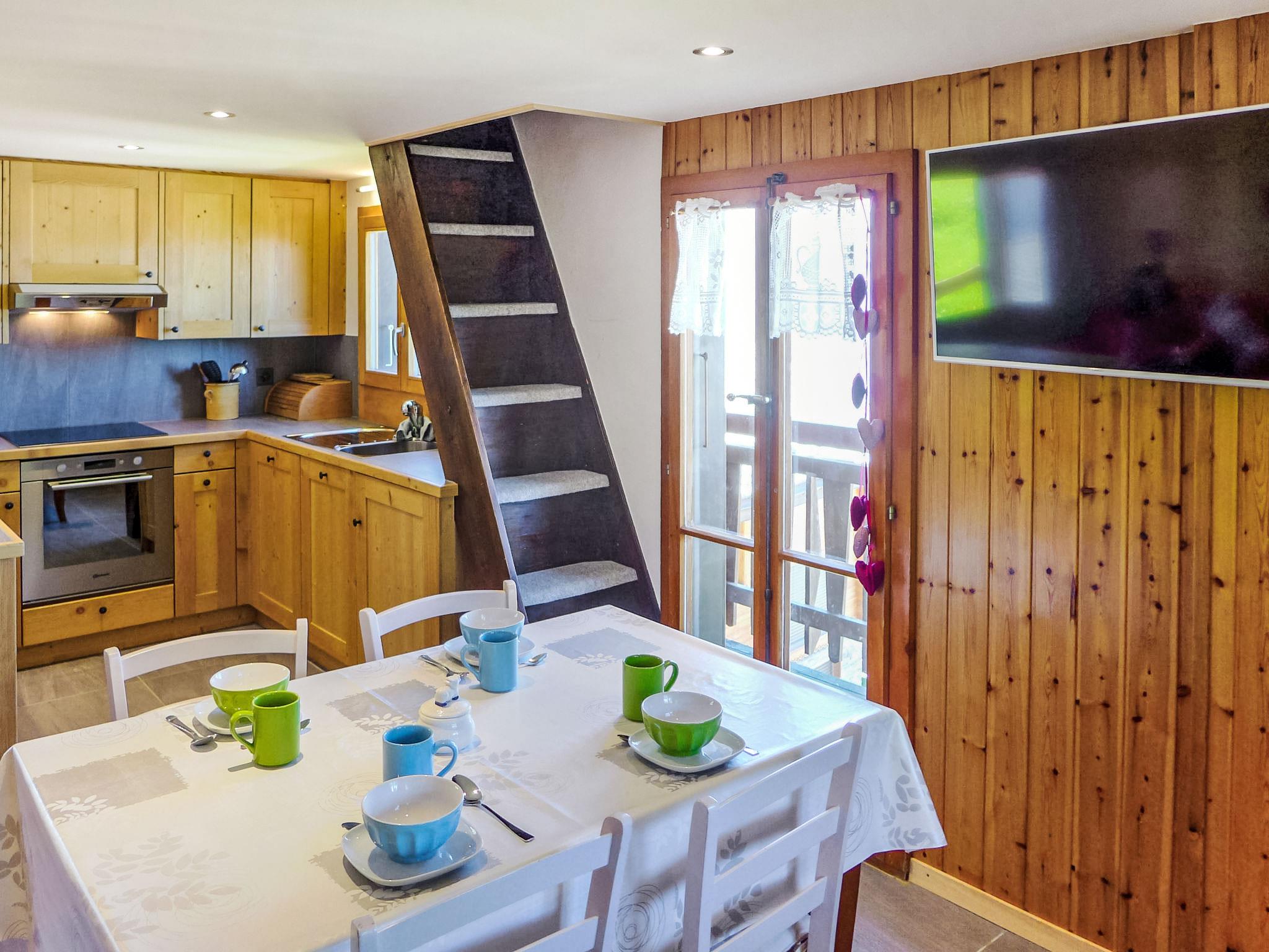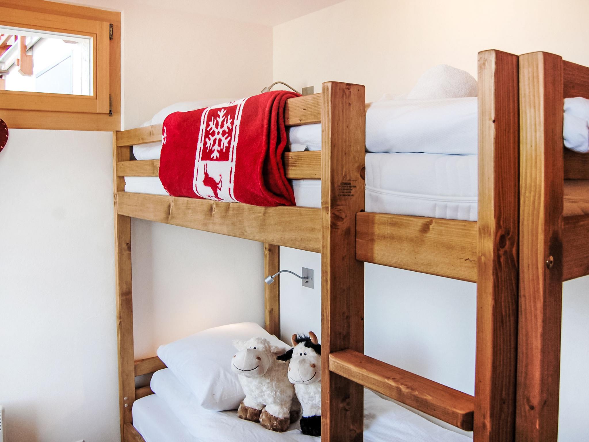 "Le Ruisseau", 3-room chalet 74 m2 on 3 levels. Fully renovated in 2015, beautiful furnishings: small living room with Scandinavian wood stove, dining nook and cable TV. Open kitchen (oven, dishwasher, 4 induction hot plates, toaster, kettle, electric coffee machine, Capsules for coffee machine (Nespresso) extra, raclette grill, fondue Set (cheese)). Shower/WC. Electric heating. On the lower ground floor: 1 room with 2 beds (90 cm, length 200 cm). 1 children's room with 1 x 2 bunk beds (80 cm, length 190 cm). Shower/WC. Top floor: open gallery with sloping ceilings, ceiling height 150 cm with DVD. Small balcony 8 m2, north facing position. Terrace furniture, barbecue, deck chairs (2). Very beautiful view of the mountains and the valley. Facilities: washing machine, dryer, hair dryer. Internet (WiFi, free). Please note: non-smokers only. Instead of an enclosed bedroom, some sleeping areas are located in an open-plan area (gallery, alcove, etc.).