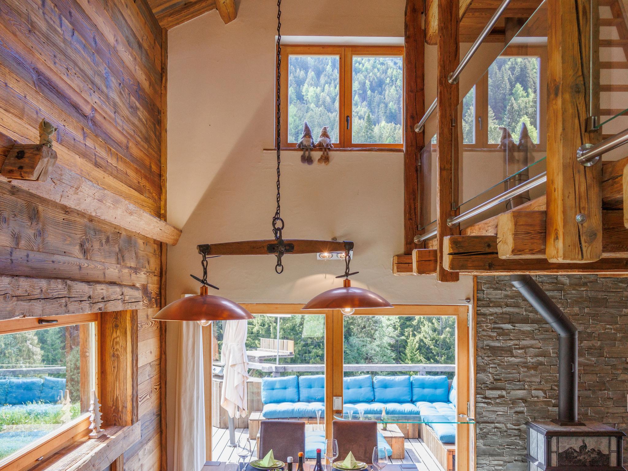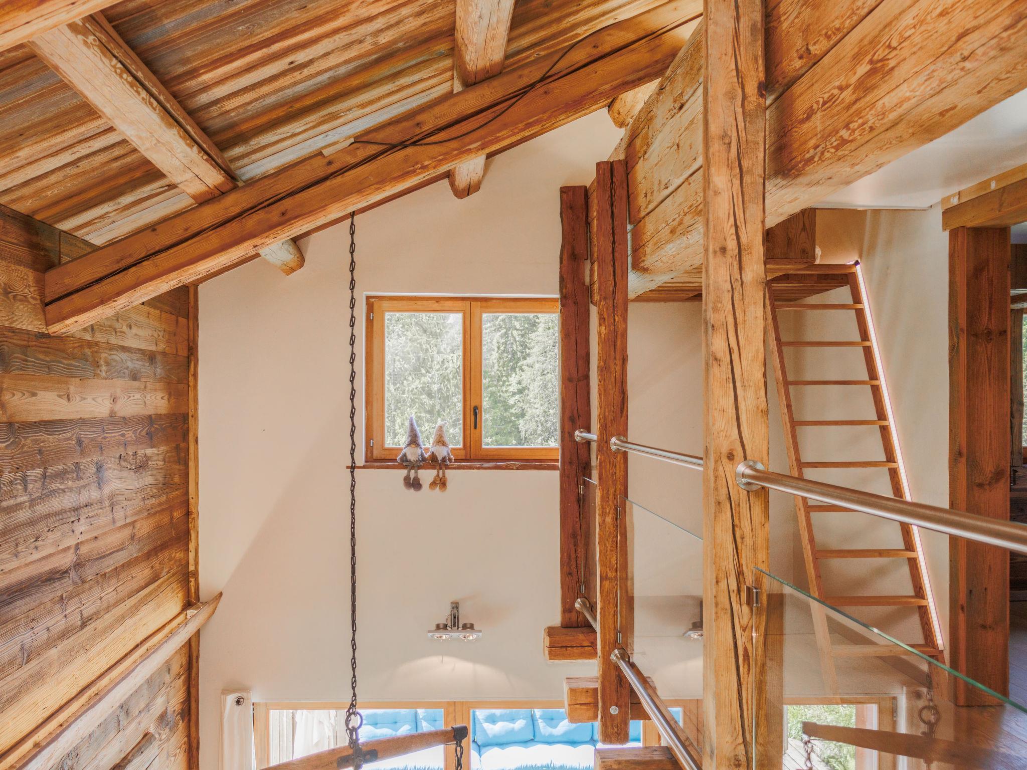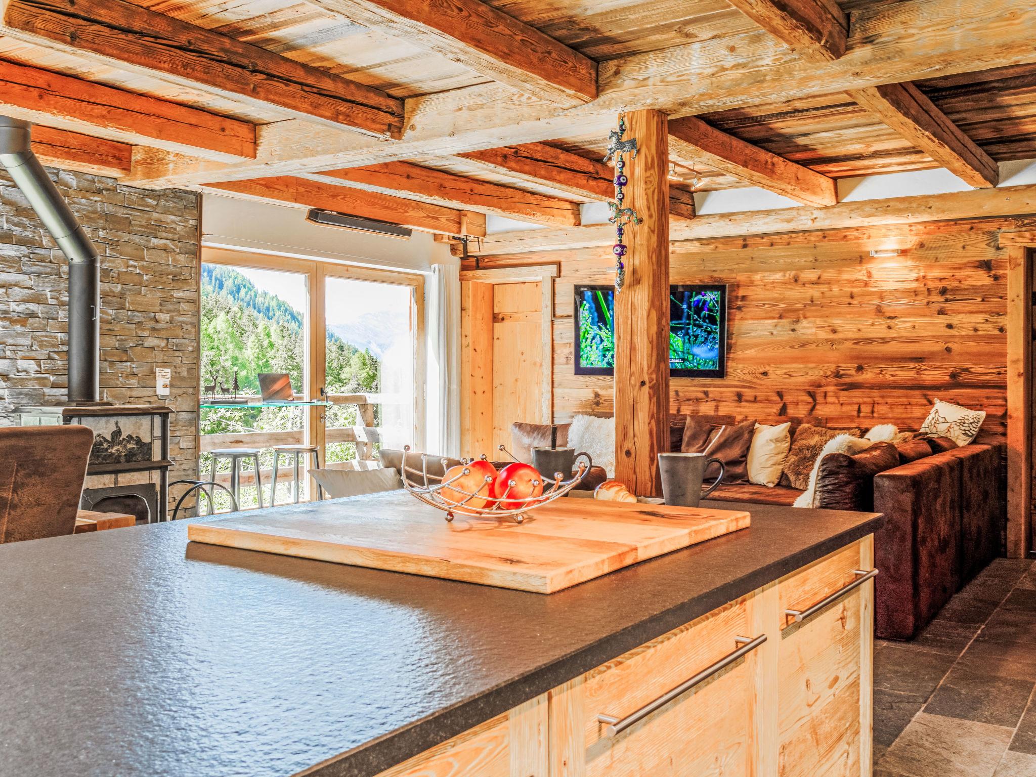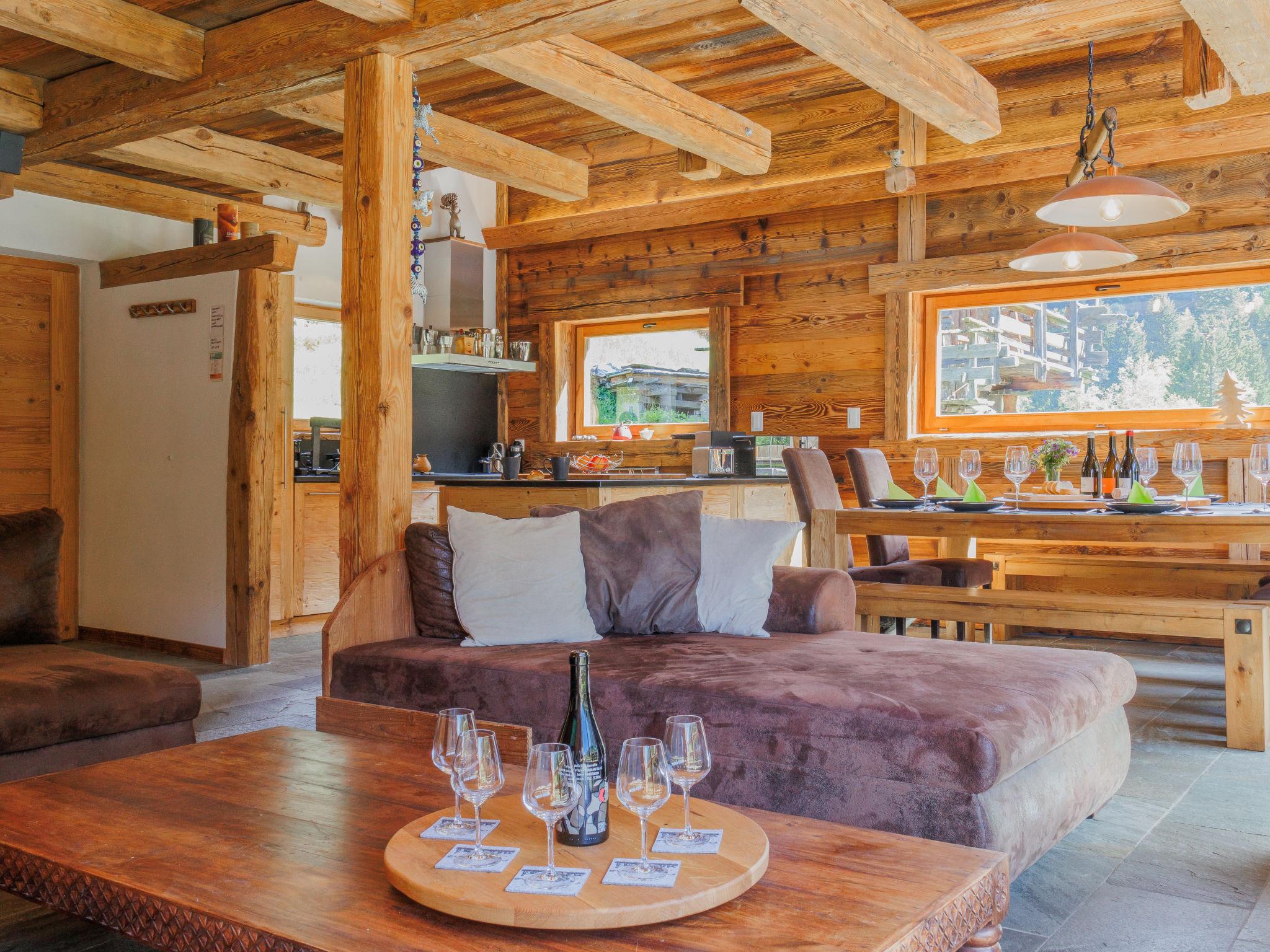"Chalet Gaea", 5-room chalet 140 m2 on 3 levels, north-east facing position. Object suitable for 6 adults + 3 children. Partly with sloping ceilings, very comfortable and beautiful furnishings: entrance hall. Living/dining room with Scandinavian wood stove and Home cinema. Exit to the terrace. Open kitchen (oven, dishwasher, 4 induction hot plates, toaster, kettle, microwave, freezer, electric coffee machine, Capsules for coffee machine (Nespresso) extra, raclette grill, fondue Set (cheese)). Bath/shower/WC. On the lower ground floor: 1 room with 1 french bed (180 cm, length 200 cm), bath/shower/WC. Upper floor: 1 room with 1 bed (90 cm, length 200 cm), 1 french bed (160 cm, length 200 cm). (ladder) open small gallery with sloping ceilings, ceiling height 120 - 145 cm with 1 bed (90 cm, length 200 cm). 1 room, without wardrobe with 1 double sofabed (140 cm, length 200 cm). Top floor: (ladder) open gallery with sloping ceilings, ceiling height 48 - 135 cm with 1 bed (90 cm, length 200 cm). Large terrace. Terrace furniture, barbecue, deck chairs. Very beautiful view of the mountains. Facilities: washing machine, dryer, hair dryer. Internet (WiFi, free). Parking (3 cars). Please note: not suitable for children under 8 years. Non-smokers only. 2 braziers, one of which is covered. Instead of an enclosed bedroom, some sleeping areas are located in an open-plan area (gallery, alcove, etc.).