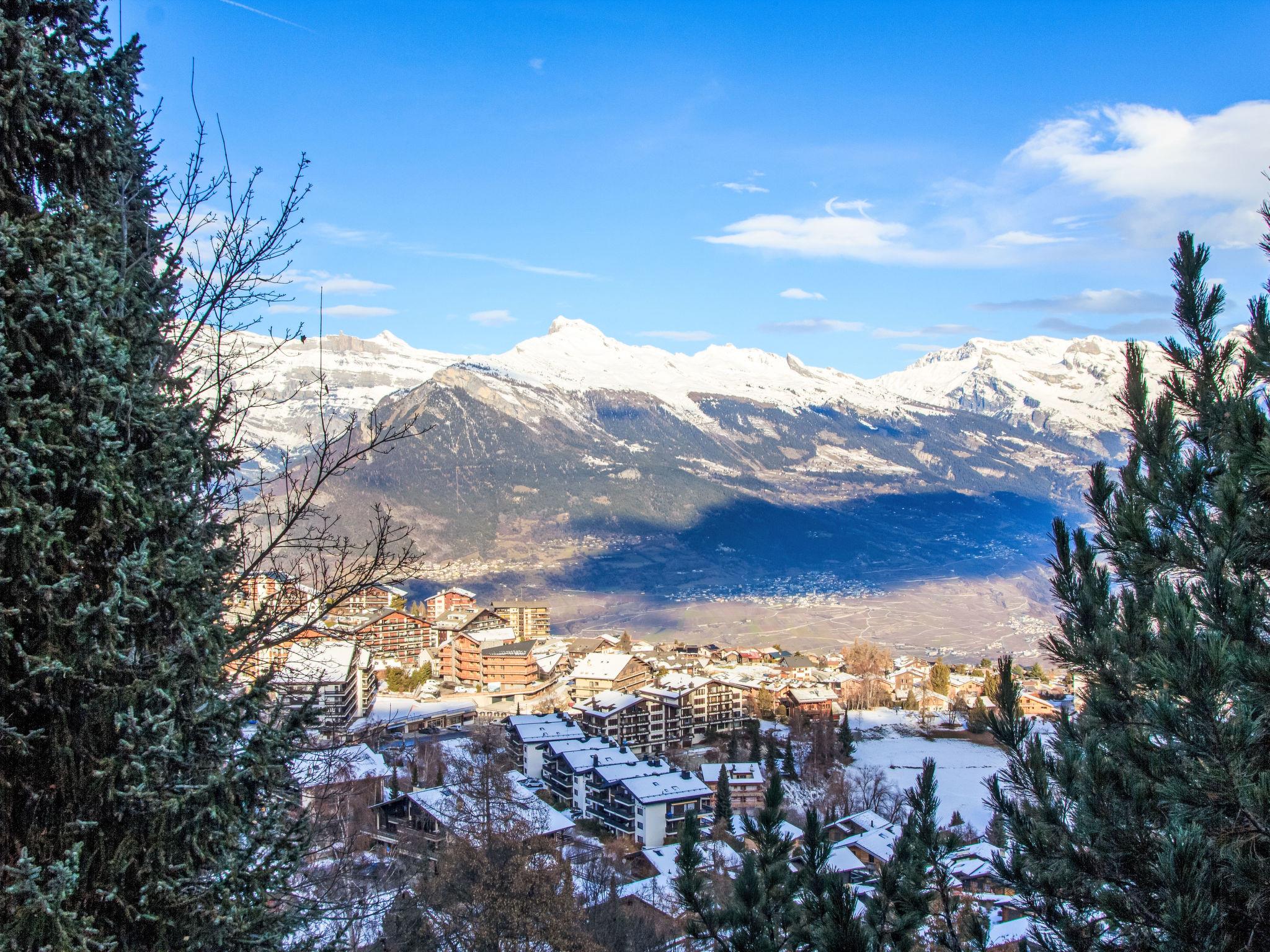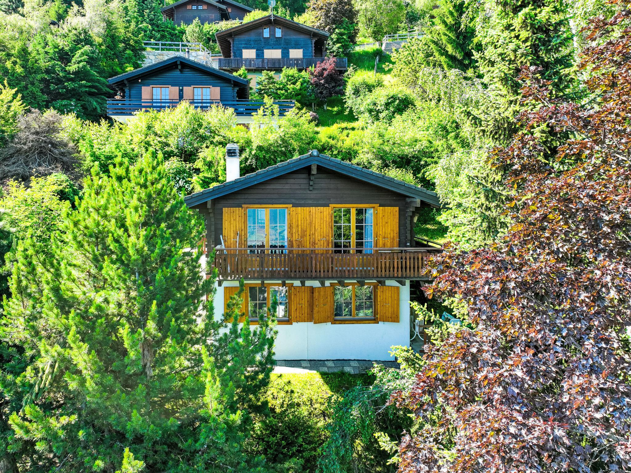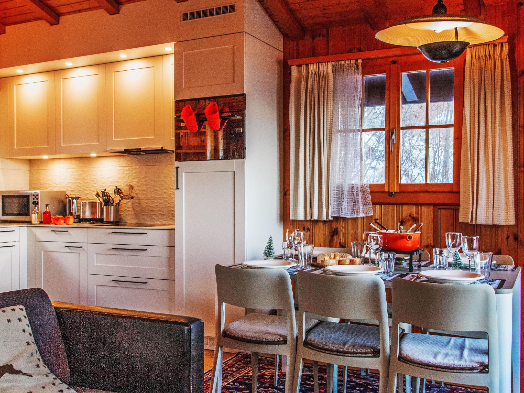 "Magicien", 4-room chalet 80 m2 on 2 levels. Simple furnishings: living/dining room with open-hearth fireplace, cable TV, radio, CD-player and DVD. Exit to the balcony. Open kitchen (4 hot plates, oven, dishwasher, toaster, kettle, microwave, electric coffee machine, Capsules for coffee machine (nespresso) extra, raclette grill, fondue Set (cheese)). Sep. WC. Electric heating. On the lower ground floor: 1 room with 2 beds (90 cm, length 190 cm). 1 small children's room with 1 x 2 bunk beds (90 cm, length 180 cm). 1 room with 2 beds (90 cm, length 190 cm). Bath/WC. 2 balconies, north facing position and west facing position. Terrace furniture, barbecue. Beautiful view of the mountains and the valley. Facilities: washing machine. Internet (WiFi, free). Parking (1 car), garage (1 car), height 200 cm, width 240 cm. Please note: non-smokers only.