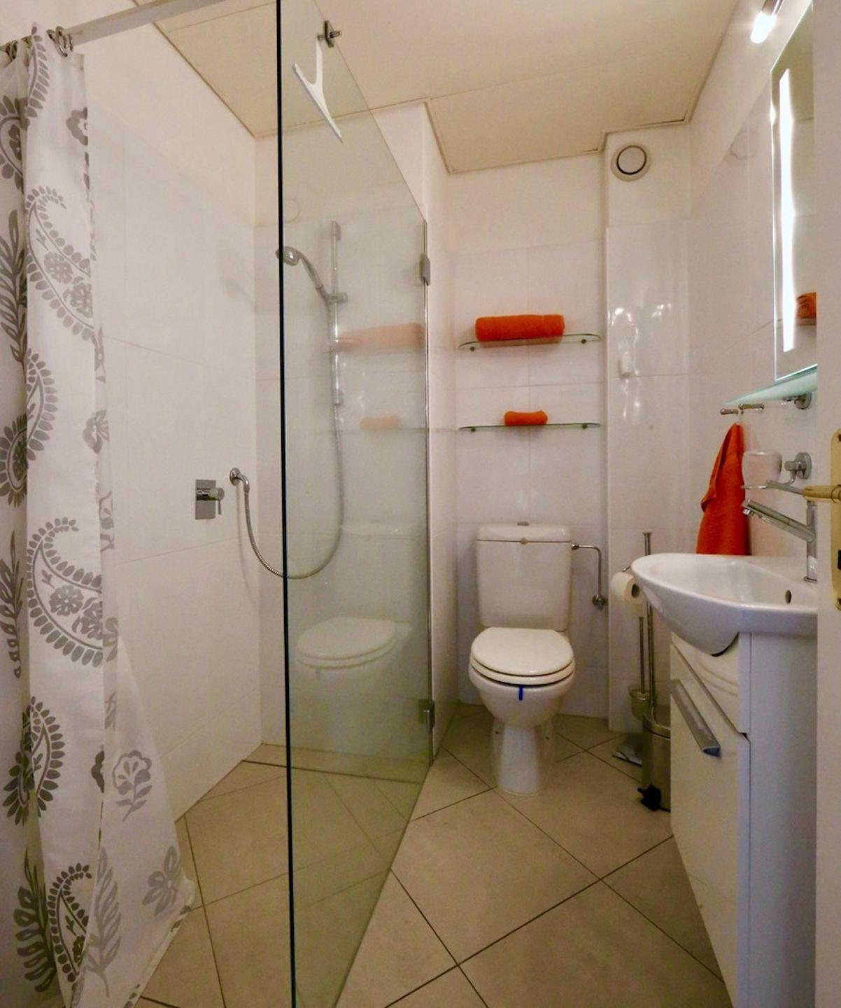 Bad mit Dusche, Waschbecken, Haartrockner und WC.