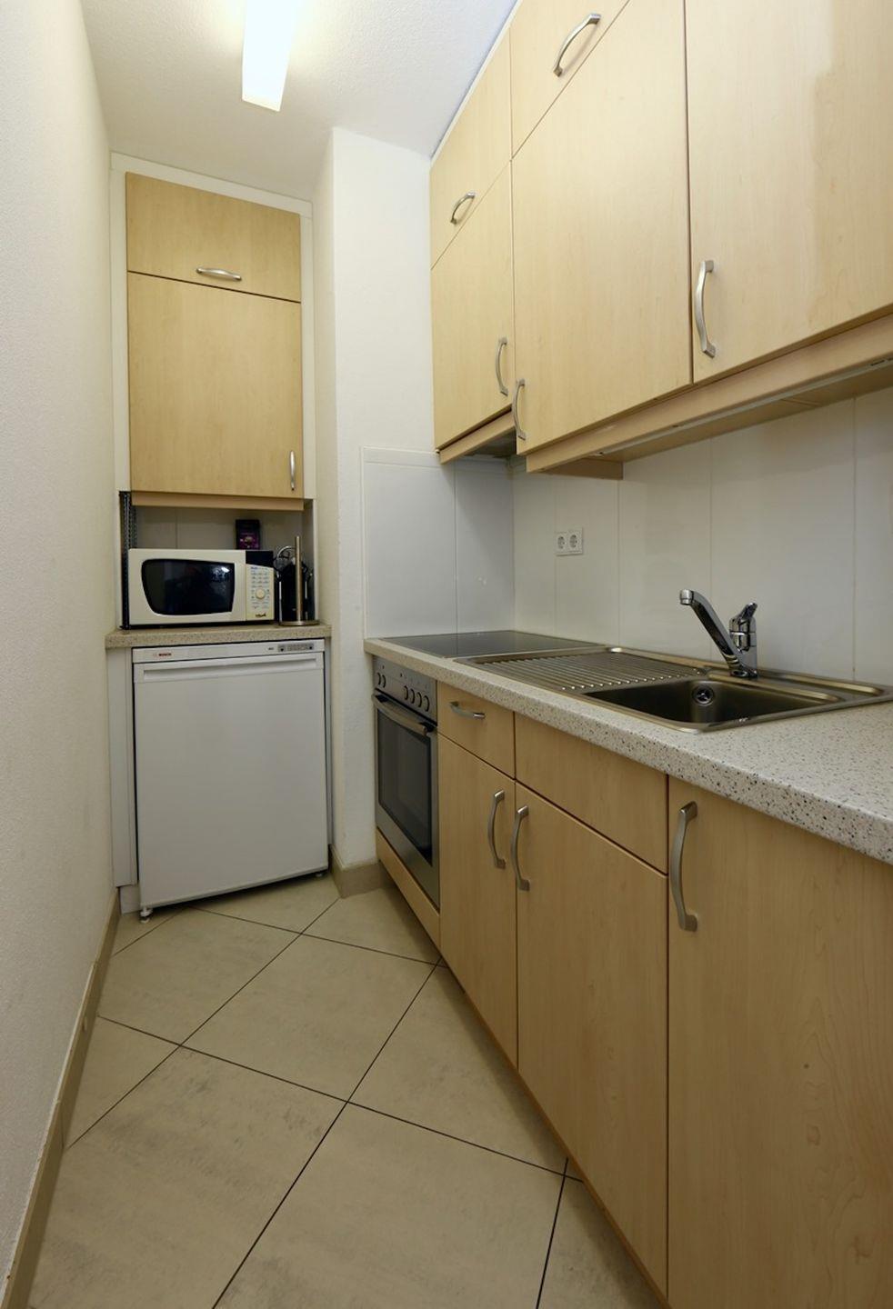 Küche mit Glaskeramikherd, Backofen, Kühlschrank, Mikrowelle, Deliciokaffeemaschine.