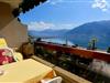 Möblierter Balkon mit Panorama-See- und Bergsicht.