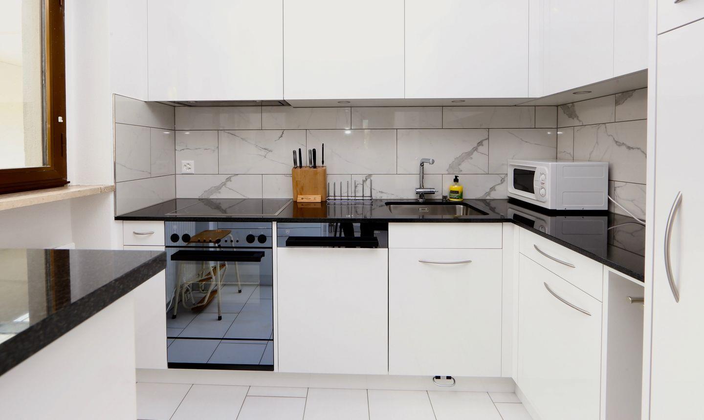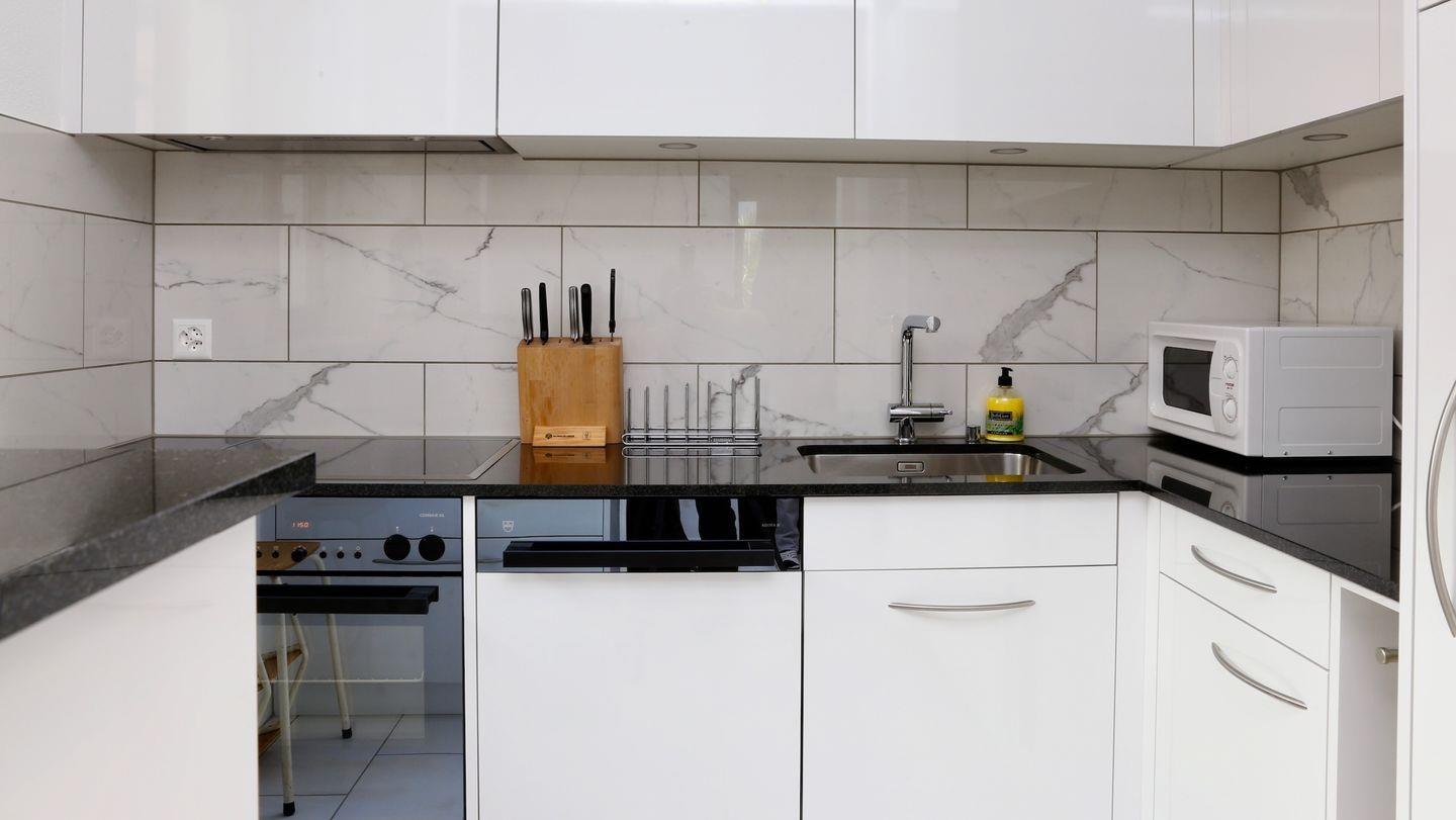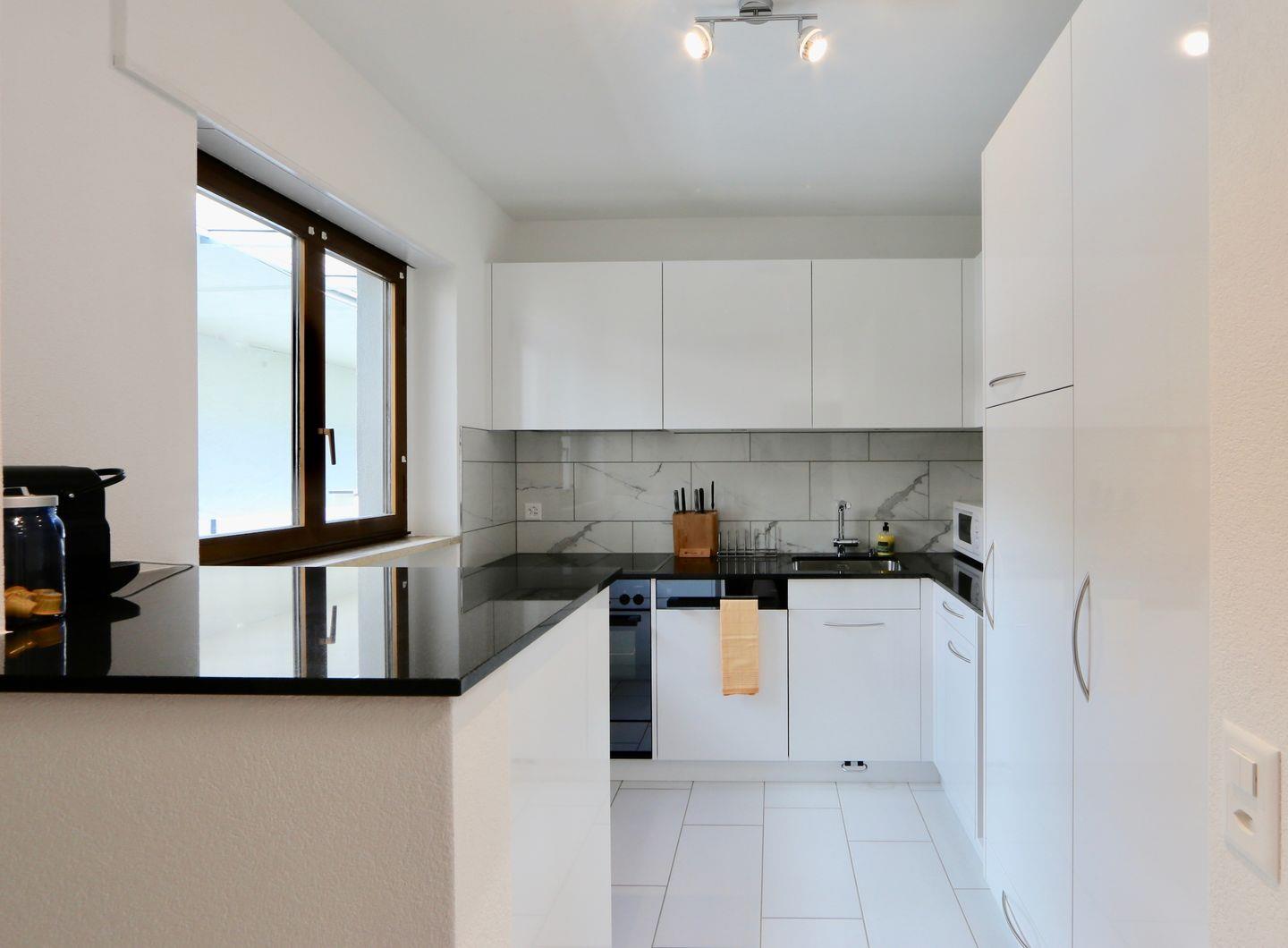 Küche mit Glaskeramikherd, Backofen, Kühlschrank mit Gefrierfach, Geschirrspüler, Delizio-, Filter- und Jura-Kaffeemaschine.