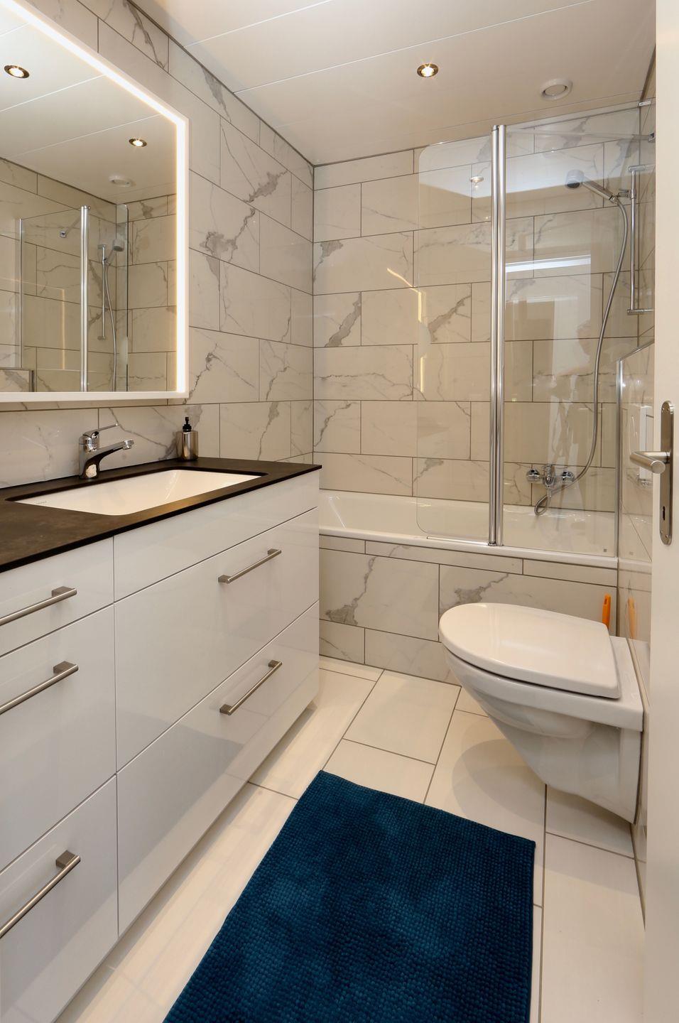 Bad mit Badewanne/Dusche und Lavabo, Haartrockner. Sep. Bad mit Dusche und WC, Waschbecken.