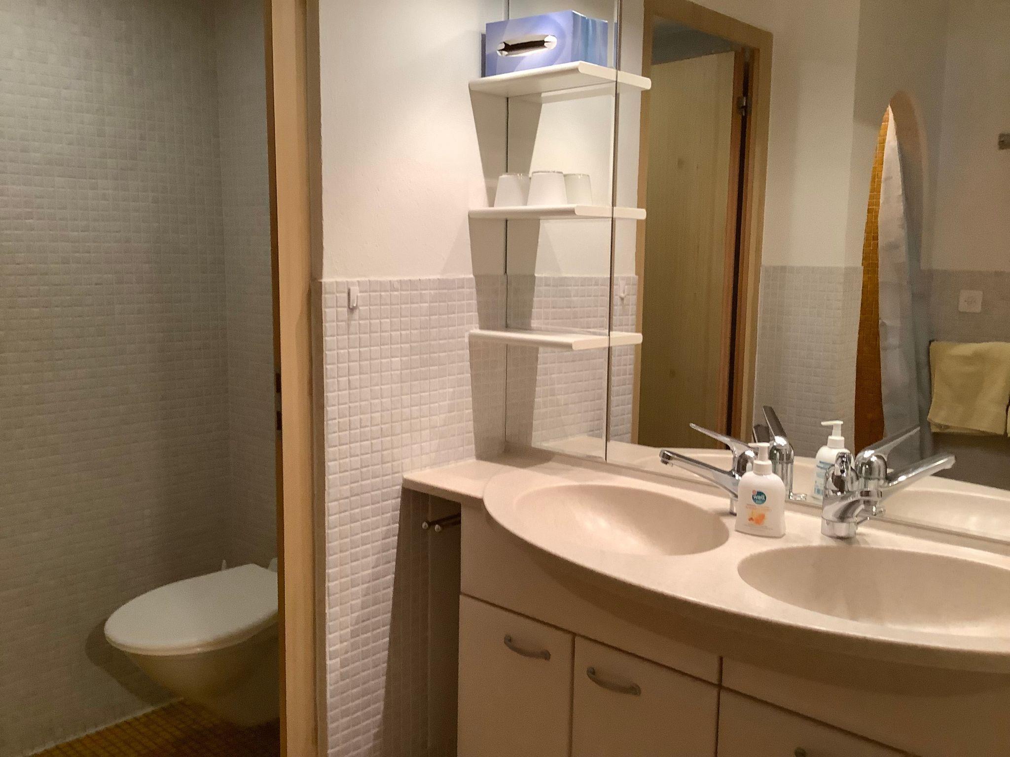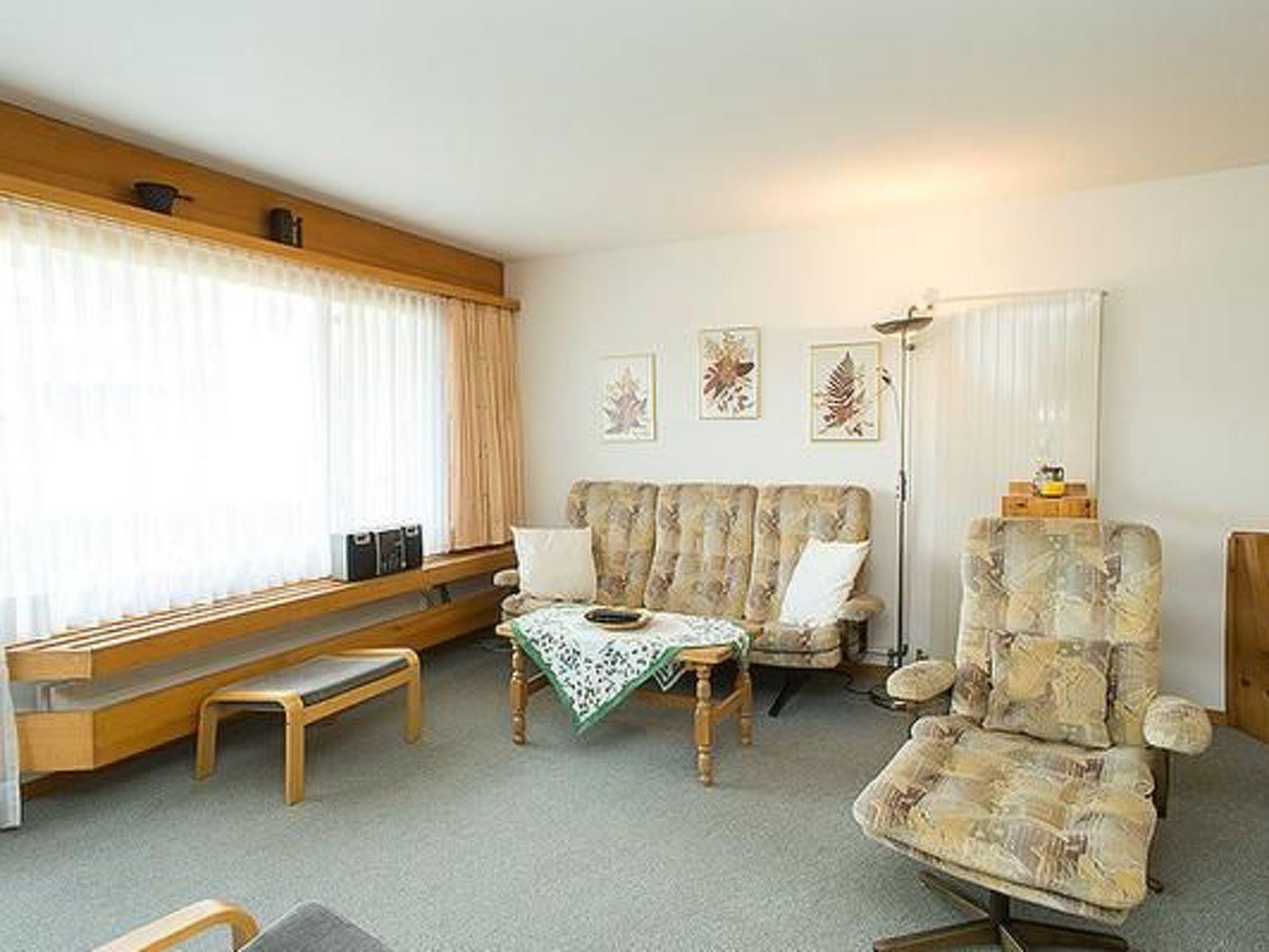Very nice, spacious 2 1/2 room flat (65m2) on the 1st floor, cosily furnished with lots of Swiss stone pine. Quietly situated. The living room offers space to relax with a cosy couch, 2 TV armchairs, Swisscom TV and WLAN. A balcony with a view of the fantastic mountain scenery, fully furnished with table and chairs, as well as loungers and parasol invites you to linger. The open, modern kitchen is equipped with ceramic hob, dishwasher, oven, large fridge, coffee machine, capsule system (Nespresso), filter coffee machine, kettle, microwave, fondue dishes and racelette oven. A round dining table with corner bench invites you to sit together in a cosy atmosphere. The bedroom with double bed (2 x 90 x 200), built-in wardrobe and direct access to the balcony offers plenty of space for a good night's sleep. A 3rd bed can be found in a separate alcove in the anteroom. The bathroom offers great comfort in a small space with a shower, separate WC and double washbasin. Shared bike and ski storage and a washing machine can be found in the basement of the house. An outdoor car park is available. The proximity to the bus stop offers the ideal starting point for your activities. Hiking, biking, skiing and cross-country skiing start right outside the front door. In winter you can easily reach the cross-country ski runs on foot.