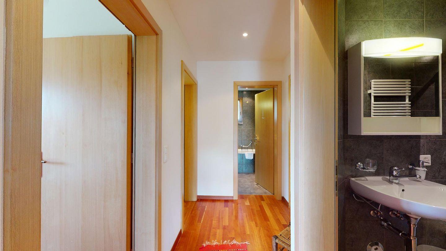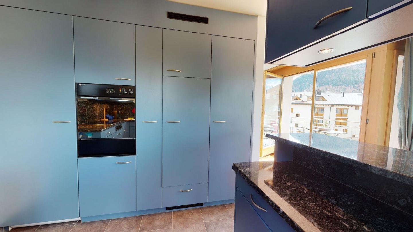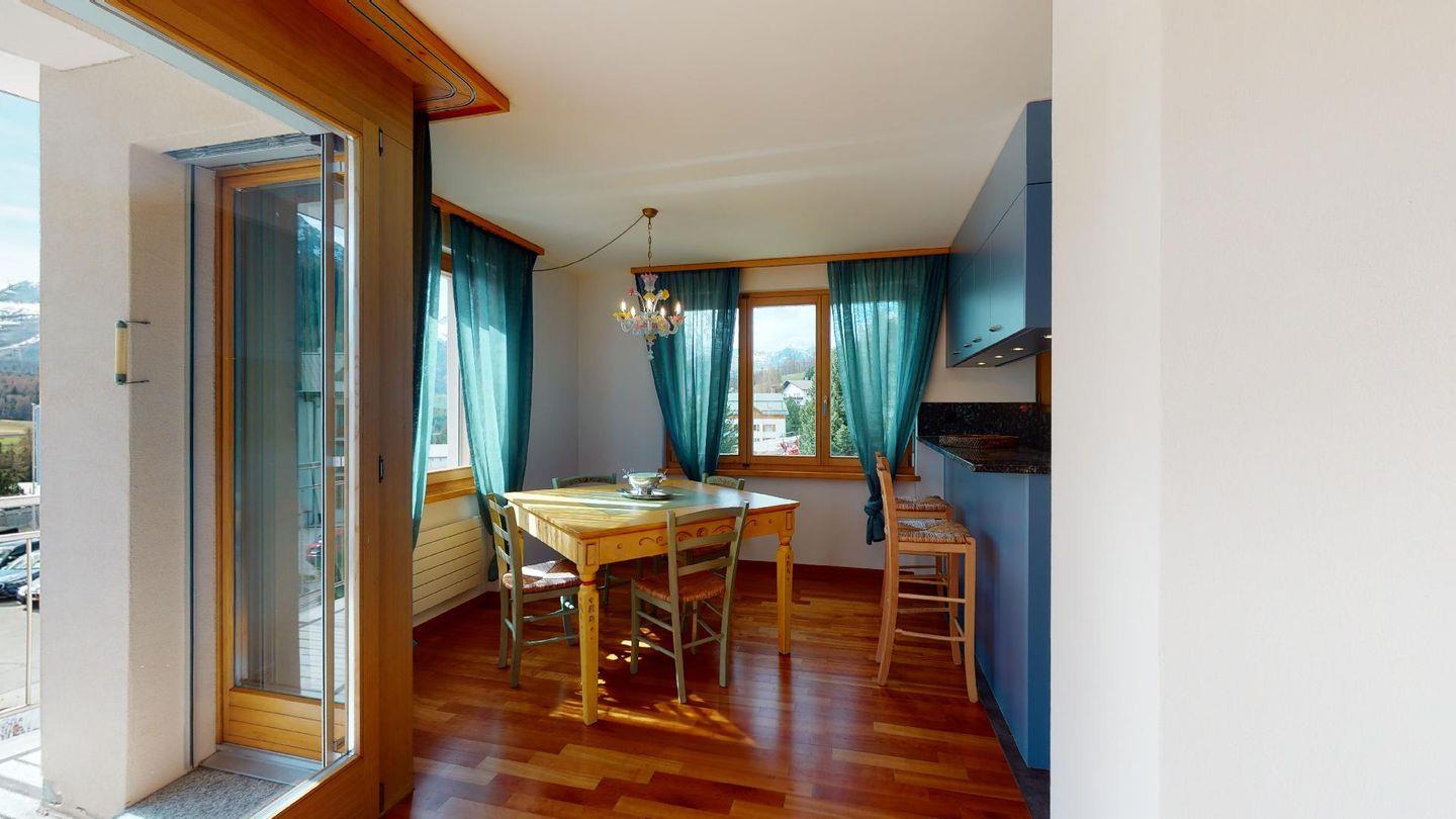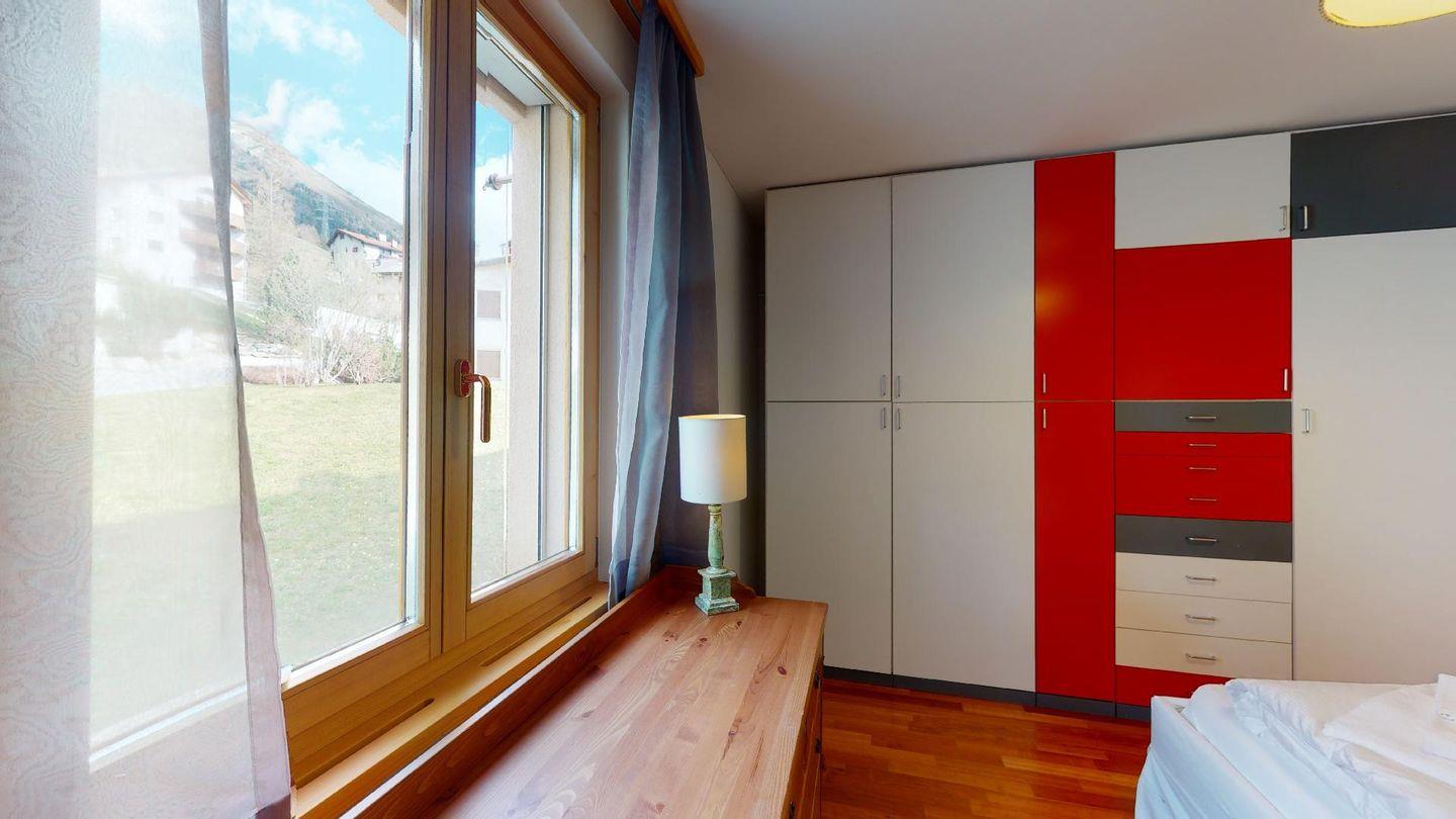 4½-Zimmerwohnung im 1. Stock. Eingang mit Garderobe. Wohnzimmer mit Balkon mit Blick zur Julierkette, Cheminée, TV, Internet und Essecke. Küche zum Wohnzimmer offen, mit Backofen, Herd, Geschirrspüler, Waschmaschine und Tumbler. Ein Doppelschlafzimmer (160cm x 195cm). Ein Doppelschlafzimmer (180cm x 200cm) und ein Einzelzimmer (90cm x 200cm). Ein Badezimmer mit Wanne, Toilette, Lavabo, Bidet und Fenster. Ein Badezimmer mit Dusche, Toilette, Lavabo und Bidet. 2 Parkplätze in der Tiefgarage. Haustiere sind erlaubt. Gemeinsamer Ski- und Veloraum.